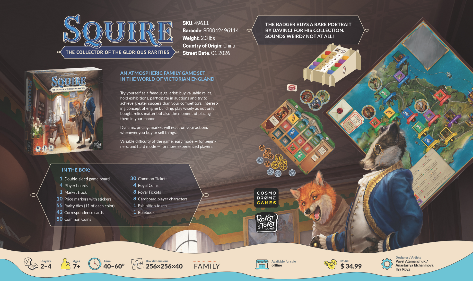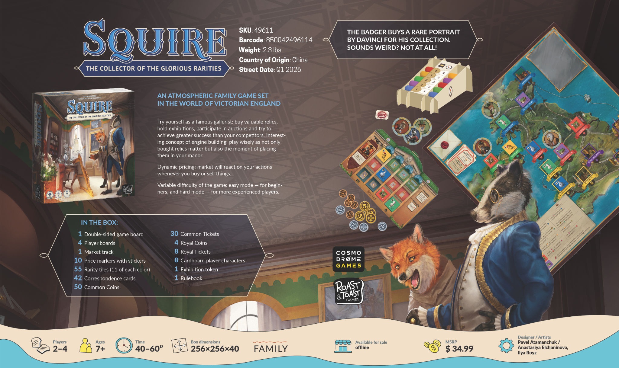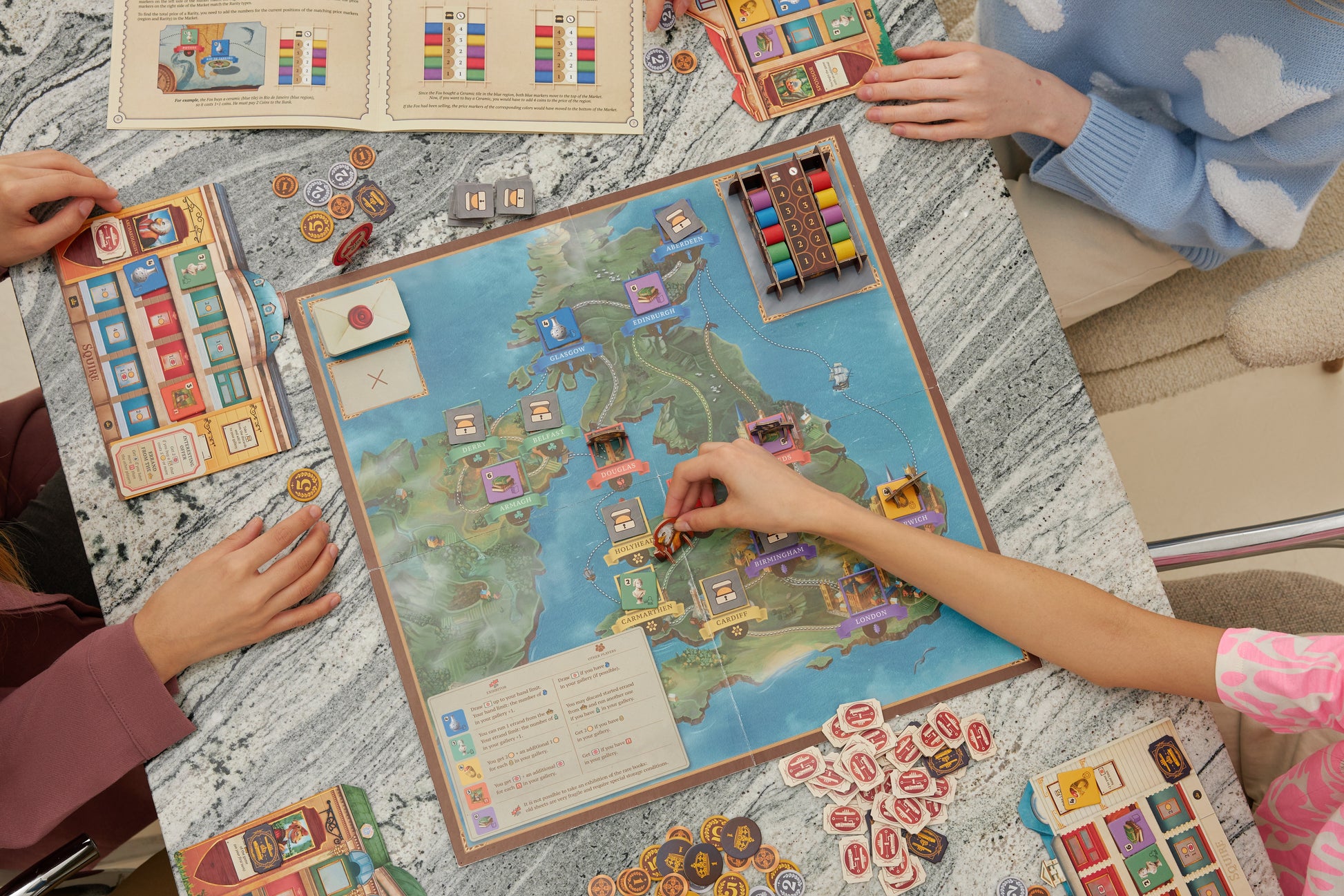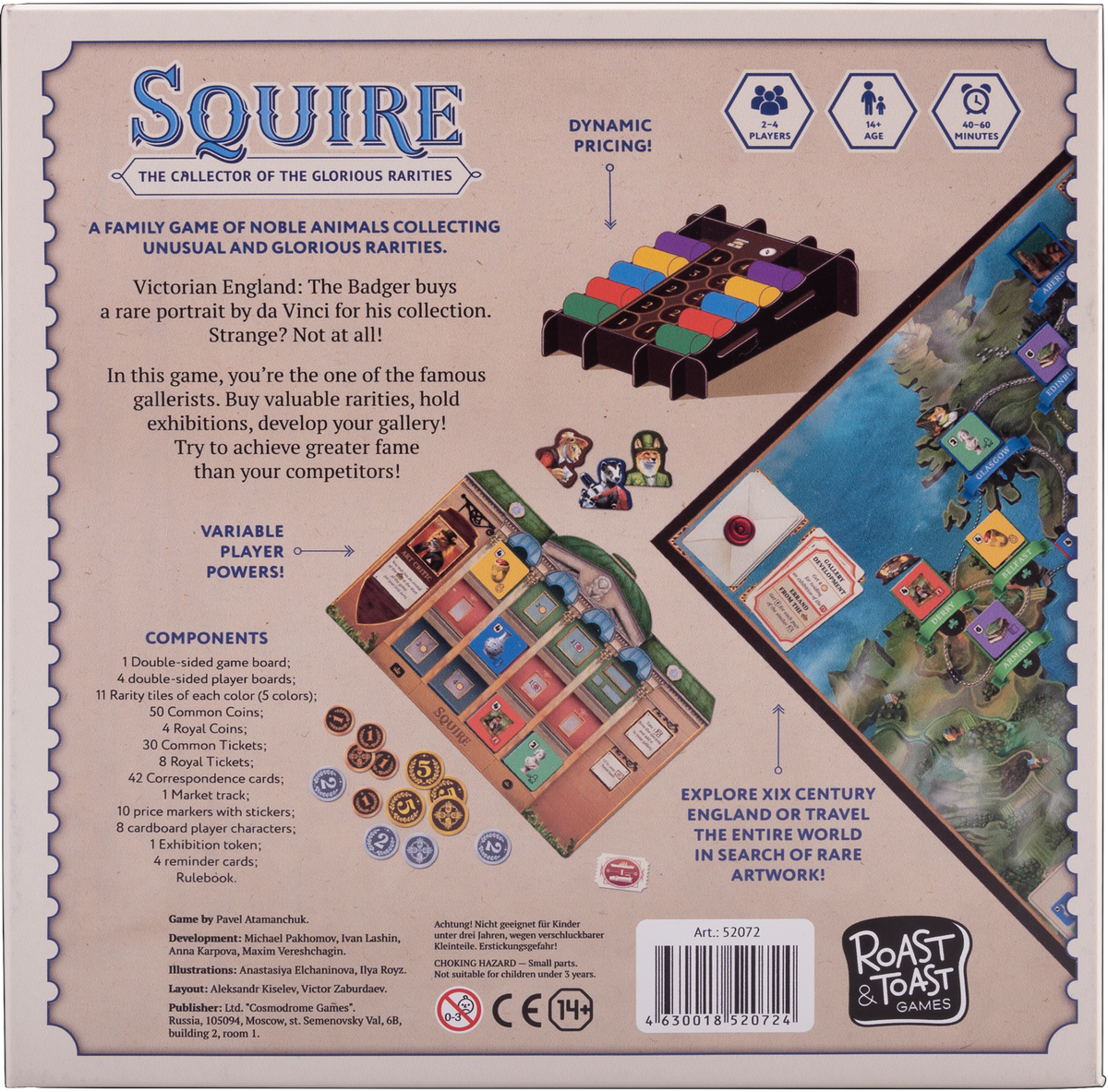 In this strategy board game, you are an art collector traveling the world to buy various artifacts for your gallery, sell art pieces to the market, and organize exhibitions. You are a professional who knows everything about constantly fluctuating prices in the art market, so you can also influence them.