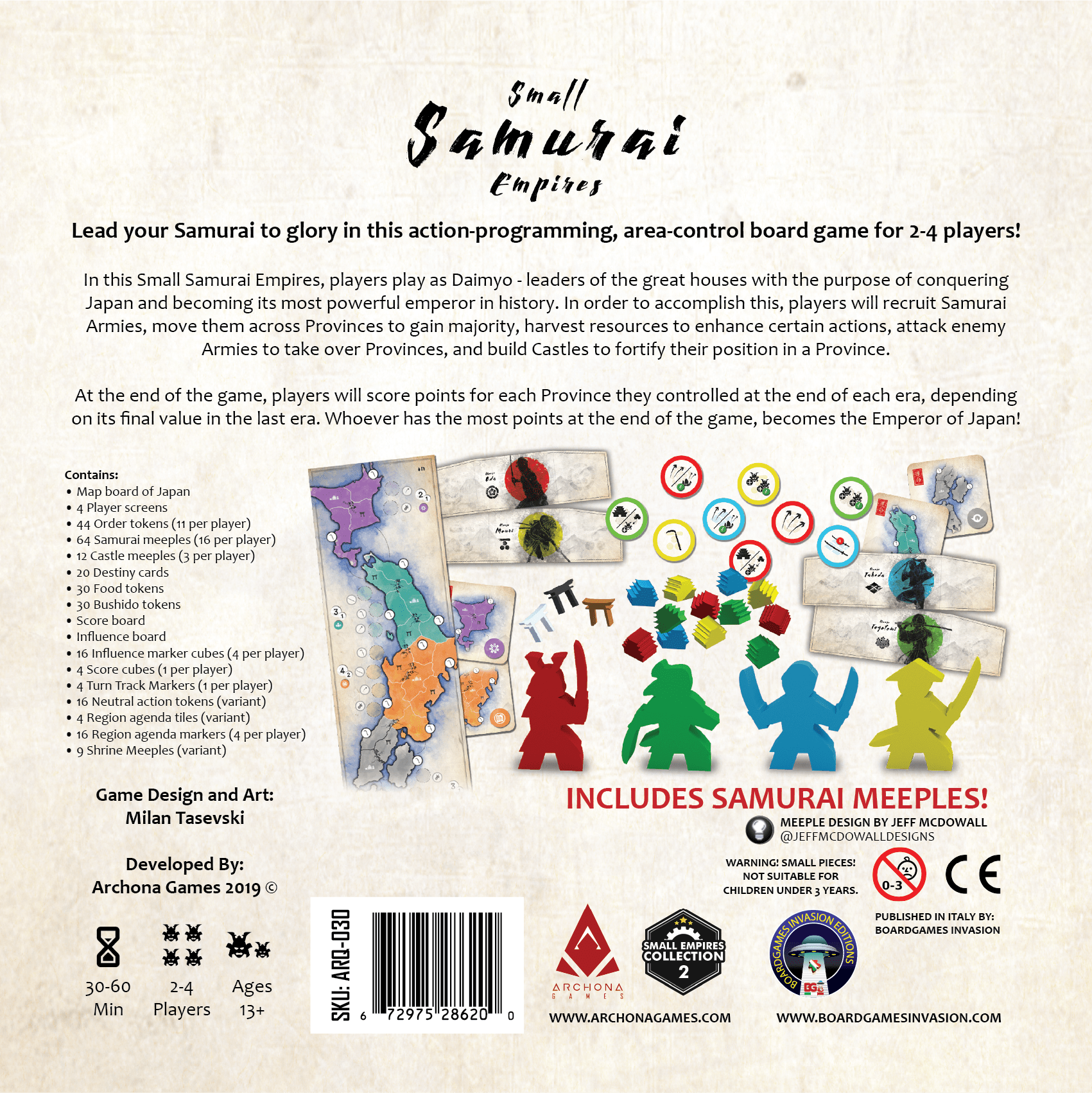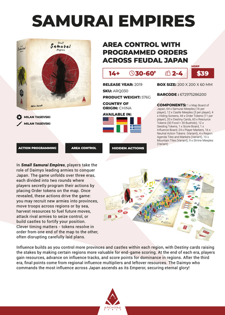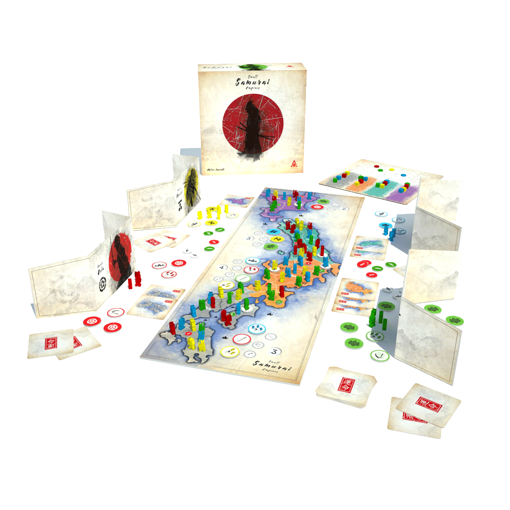 In Small Samurai Empires, players take the role of Daimyo leading armies to conquer Japan. The game unfolds over three eras, each divided into two rounds where players secretly program their actions by placing Order tokens on the map. Once revealed, these actions drive the game: you may recruit new armies into provinces, move troops across regions or by sea, harvest resources to fuel future moves, attack rival armies to seize control, or build castles to fortify your position. Clever timing matters - tokens resolve in order from one end of the map to the other, often disrupting carefully laid plans.