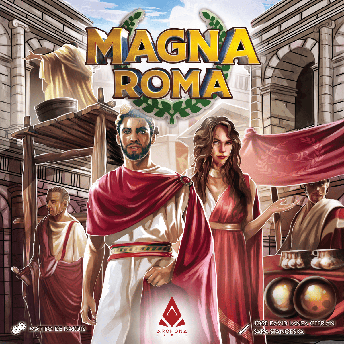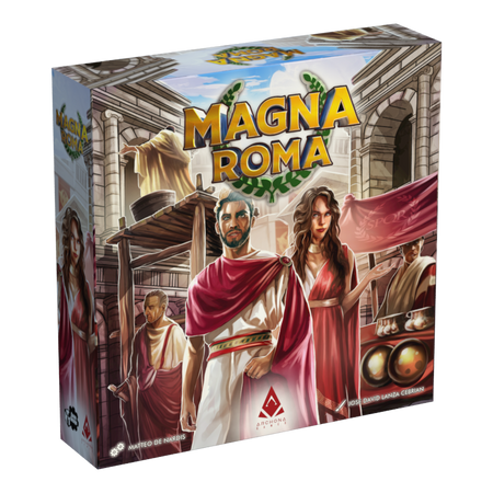In Magna Roma, players take on the role of architects tasked by the Emperor to design the next great Roman city. Each turn, a player drafts a city tile and places it in their growing 5×5 grid. Placing tiles creates and connects half-symbols that form complete icons, which immediately grant resources such as coins, population, legions, faith, or luxuries. Matching colors produces greater rewards, while mixed colors yield smaller but still valuable benefits. After tile placement, players may take optional actions: construct mighty Monuments by investing coins and population, send Legions to conquer provinces for end-game points, or use Blessings from the gods to re-trigger tile effects.