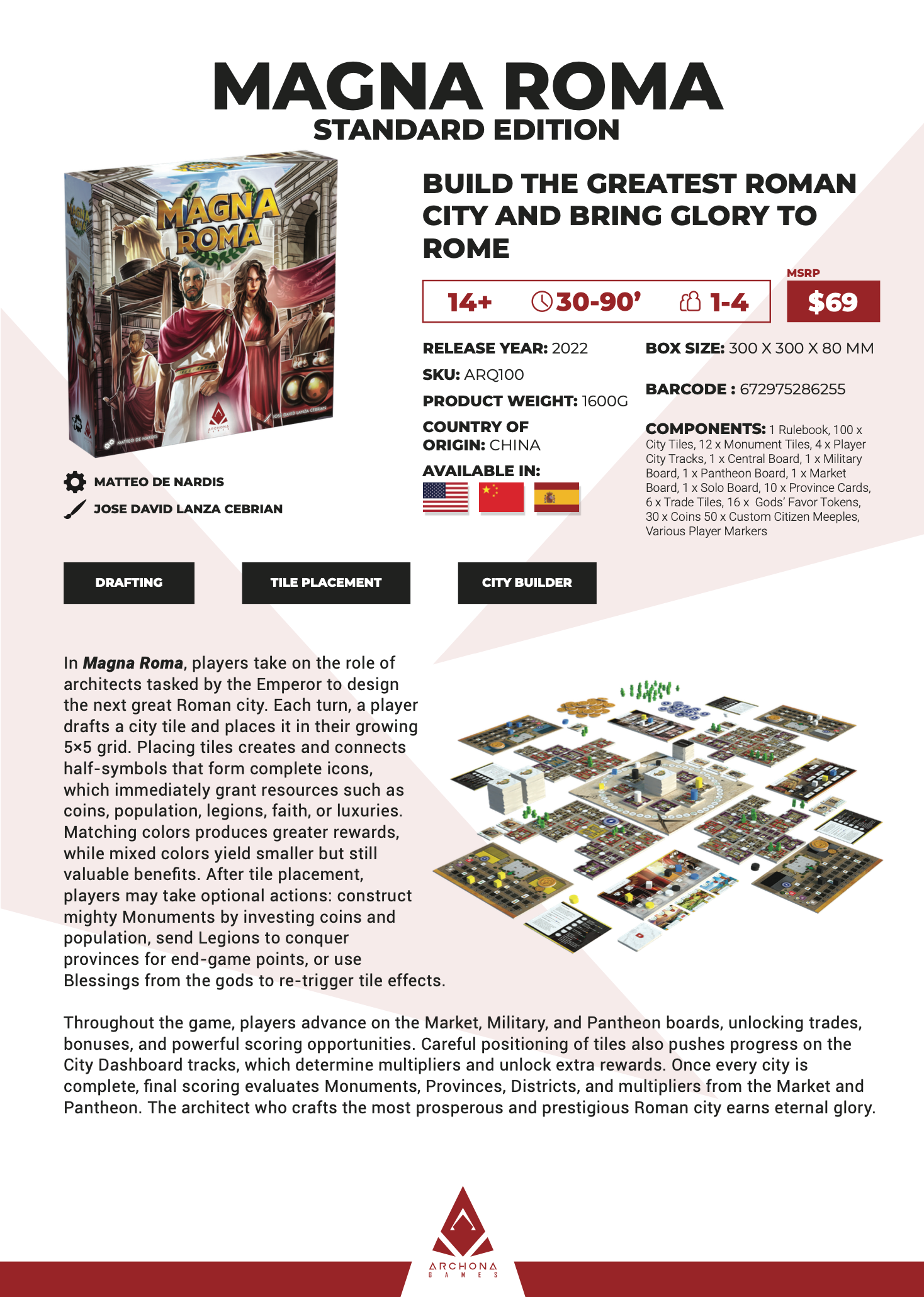 Throughout the game, players advance on the Market, Military, and Pantheon boards, unlocking trades, bonuses, and powerful scoring opportunities. Careful positioning of tiles also pushes progress on the City Dashboard tracks, which determine multipliers and unlock extra rewards. Once every city is complete, final scoring evaluates Monuments, Provinces, Districts, and multipliers from the Market and Pantheon. The architect who crafts the most prosperous and prestigious Roman city earns eternal glory.
