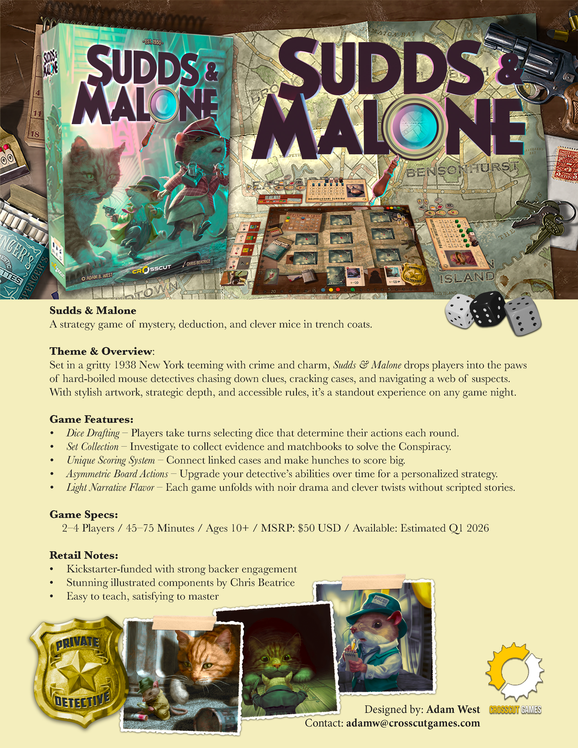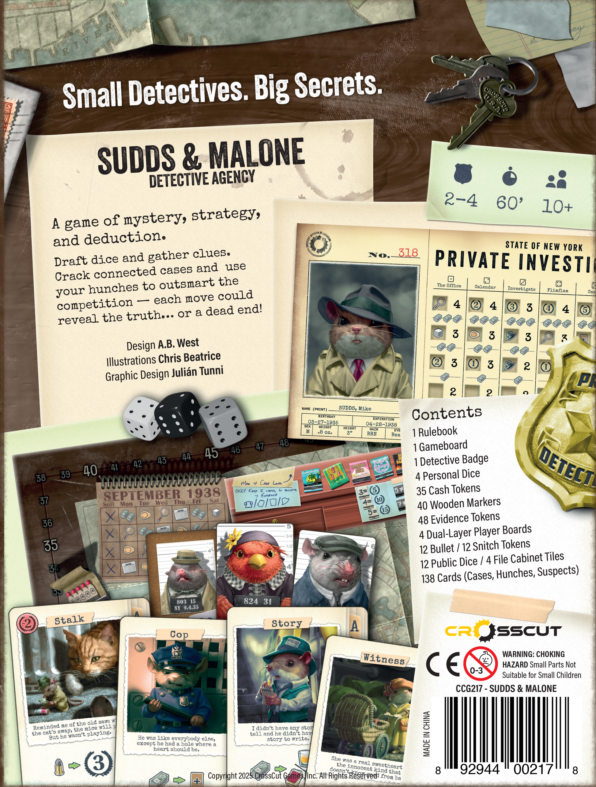 Dive into a medium-light competitive Euro game where strategic card management, tactical dice drafting, and clever set collection drive the action. With hidden information adding layers of intrigue, every decision matters as you piece together clues and navigate the murky world of 1938 New York. Feel the suspense build as you uncover secrets and solve mysteries.