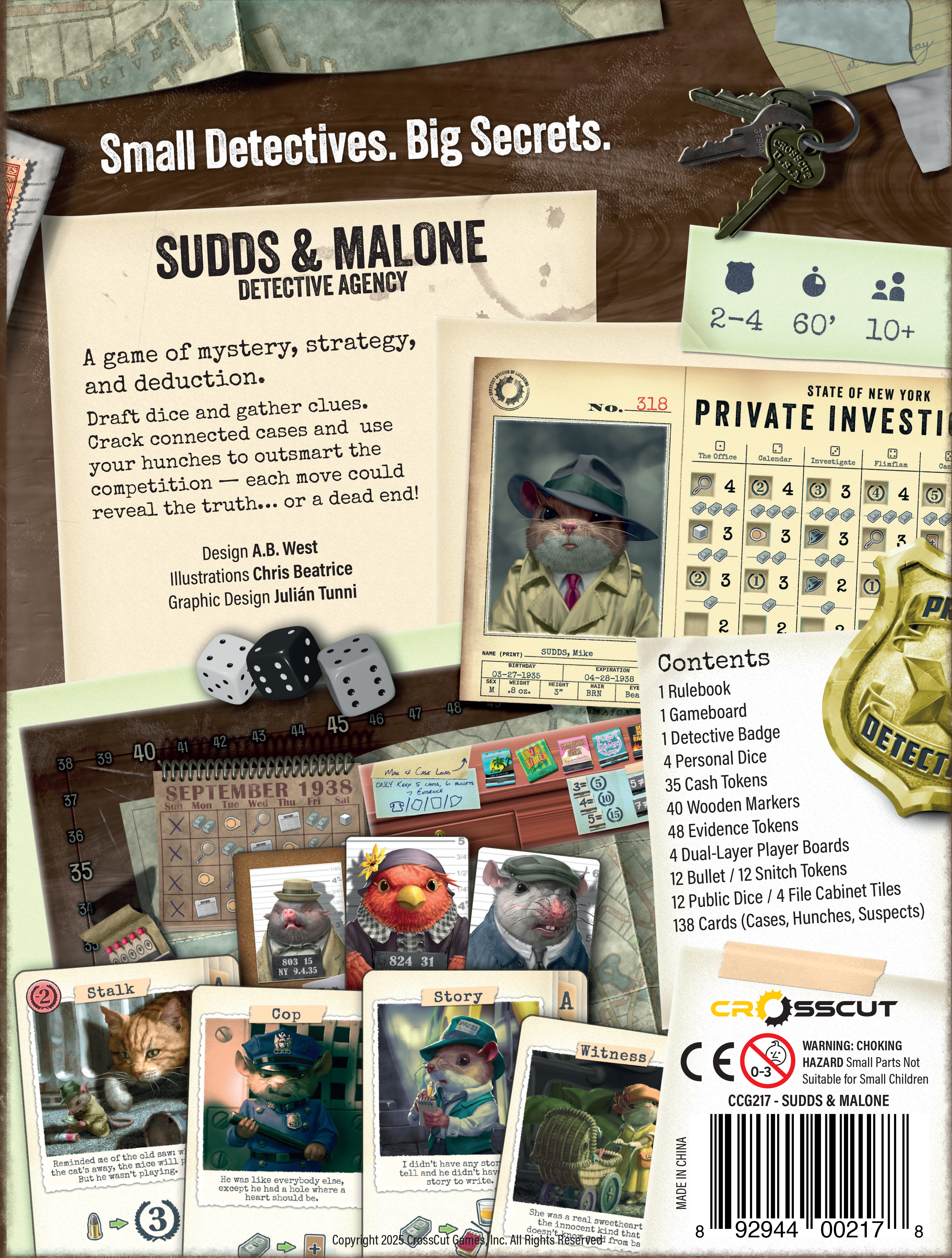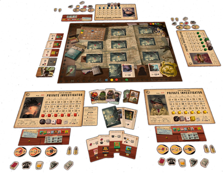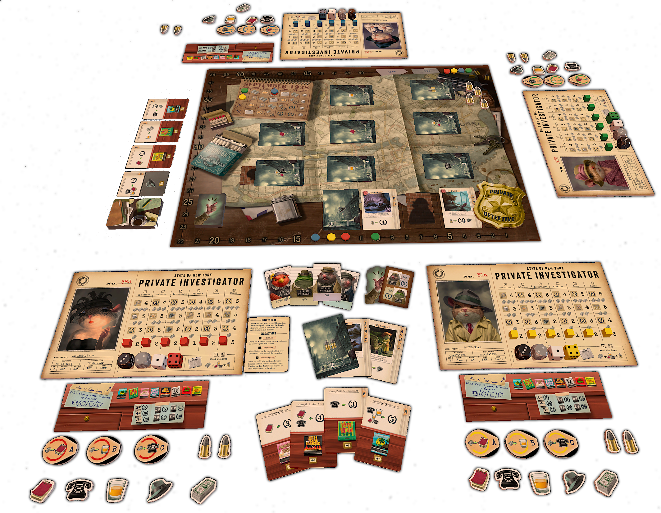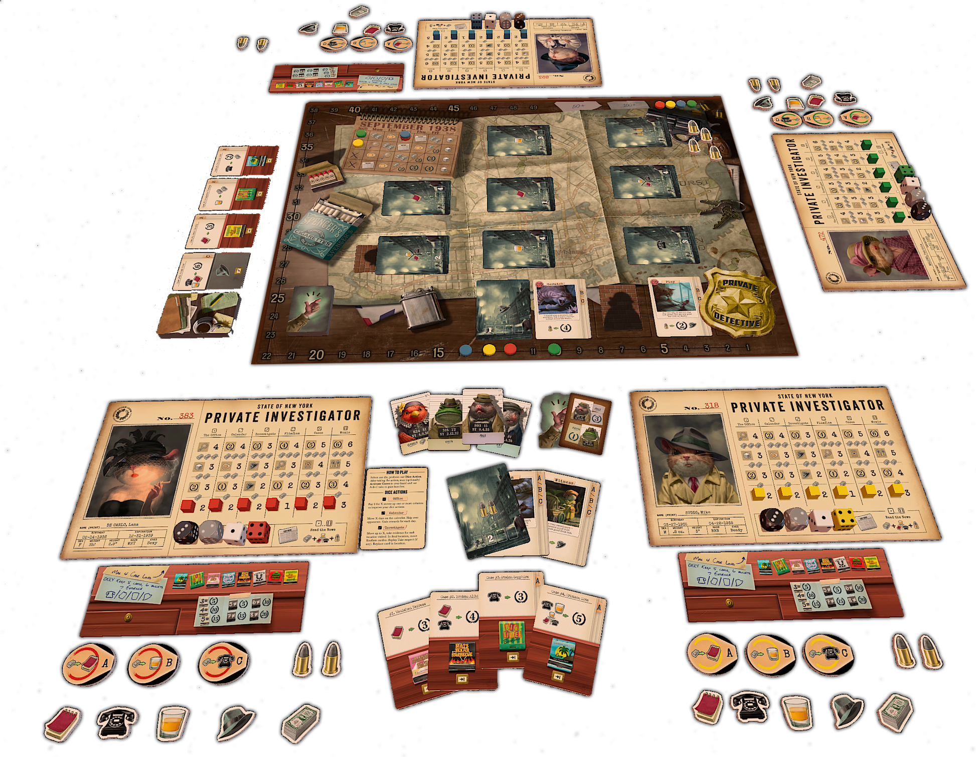 On your turn, draft a die from the pool and choose your action. Improve your skills with Office, talk to suspects with Calendar, investigate the city for evidence, use Flimflam to distract the cat or gain extra clues, dive into new cases, stock up on bullets, or just sit back and read the newspaper for additional hints.