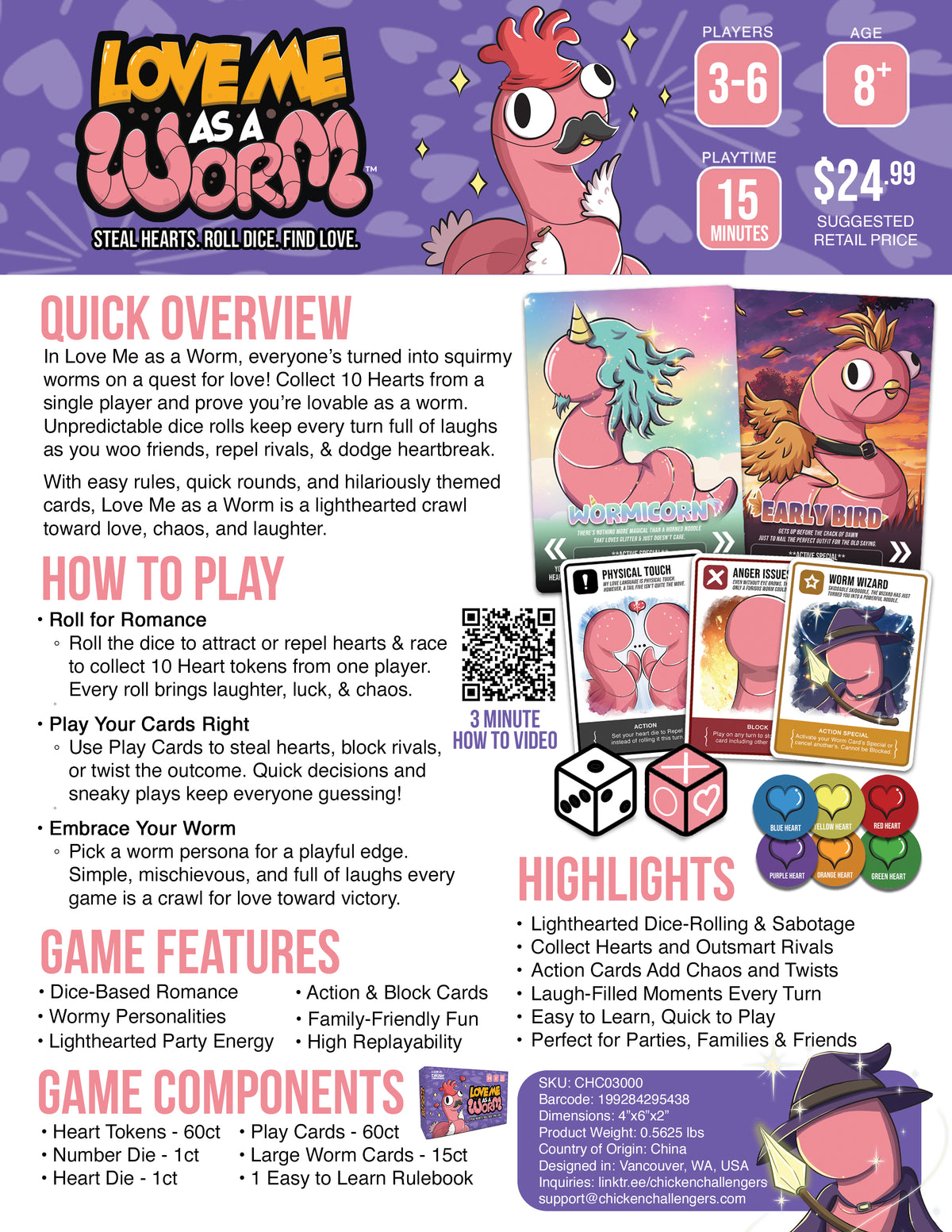 In Love Me as a Worm, everyone’s been magically turned into squirmy little worms on a chaotic quest for affection! Roll dice to woo rivals, steal hearts, and dodge heartbreak as you race to collect 10 Hearts from a single player. Every turn is a laugh-filled mix of luck, sabotage, and sneaky strategy.