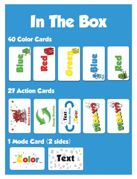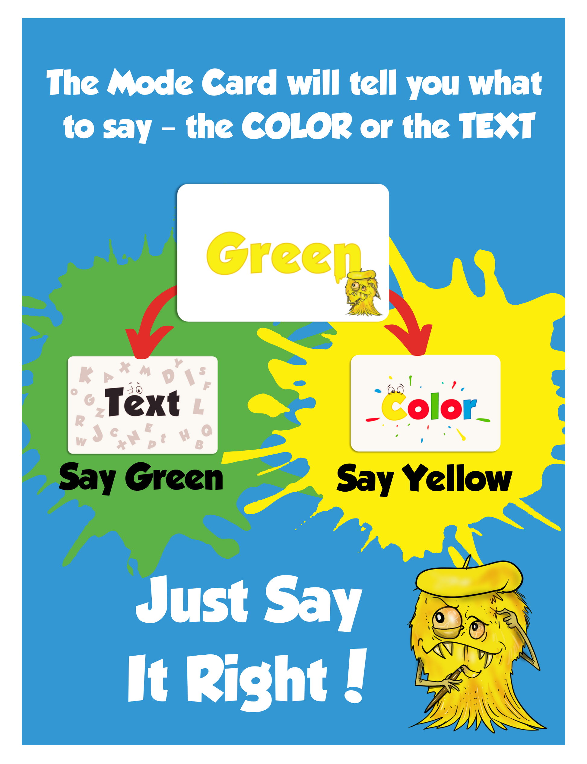 Race against time as you flip cards and think fast - you've got just ONE second to act! Colors and words dance across the cards, but here's the catch: the sneaky Mode Cards keep switching whether you should read the word or say the color. And trust us - they're rarely the same!