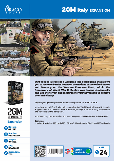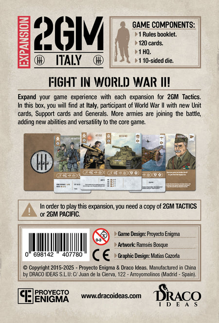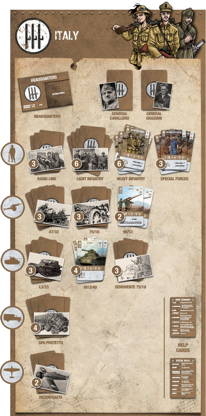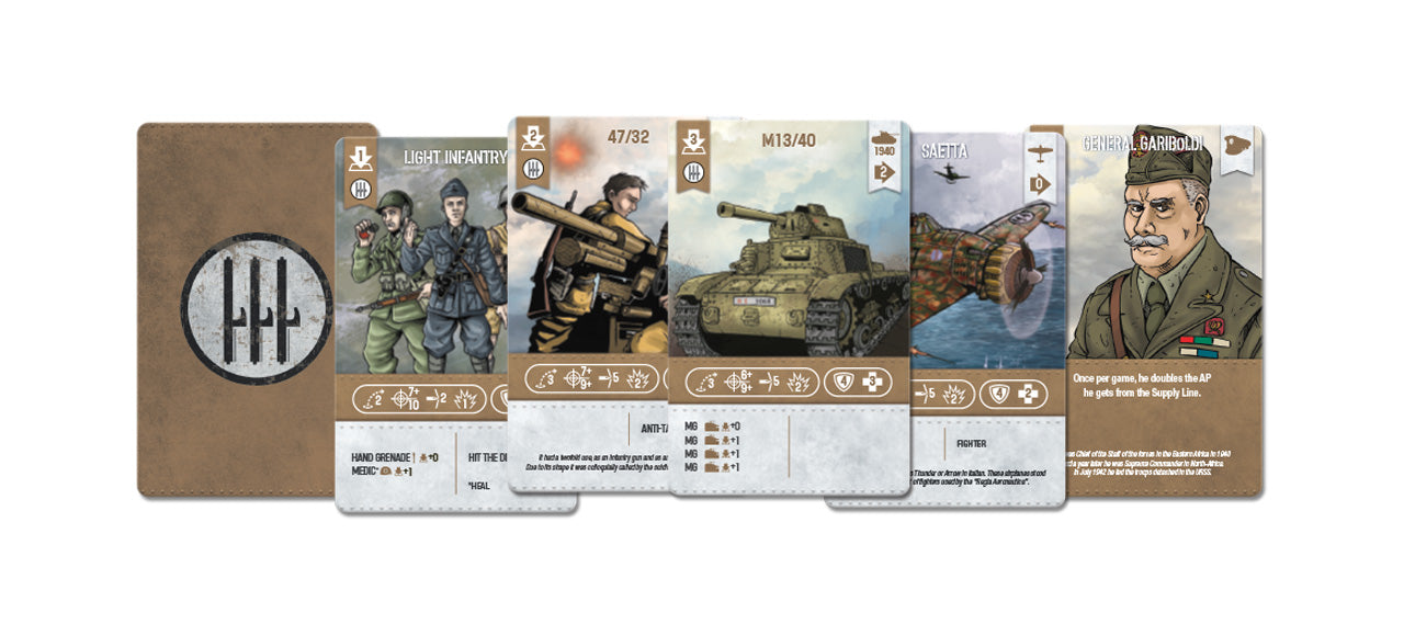 In this box, you will find Italy, participant of World War II with new Unit cards, Support cards and Generals. More armies are joining the battle, adding new abilities and versatility to the core game.
