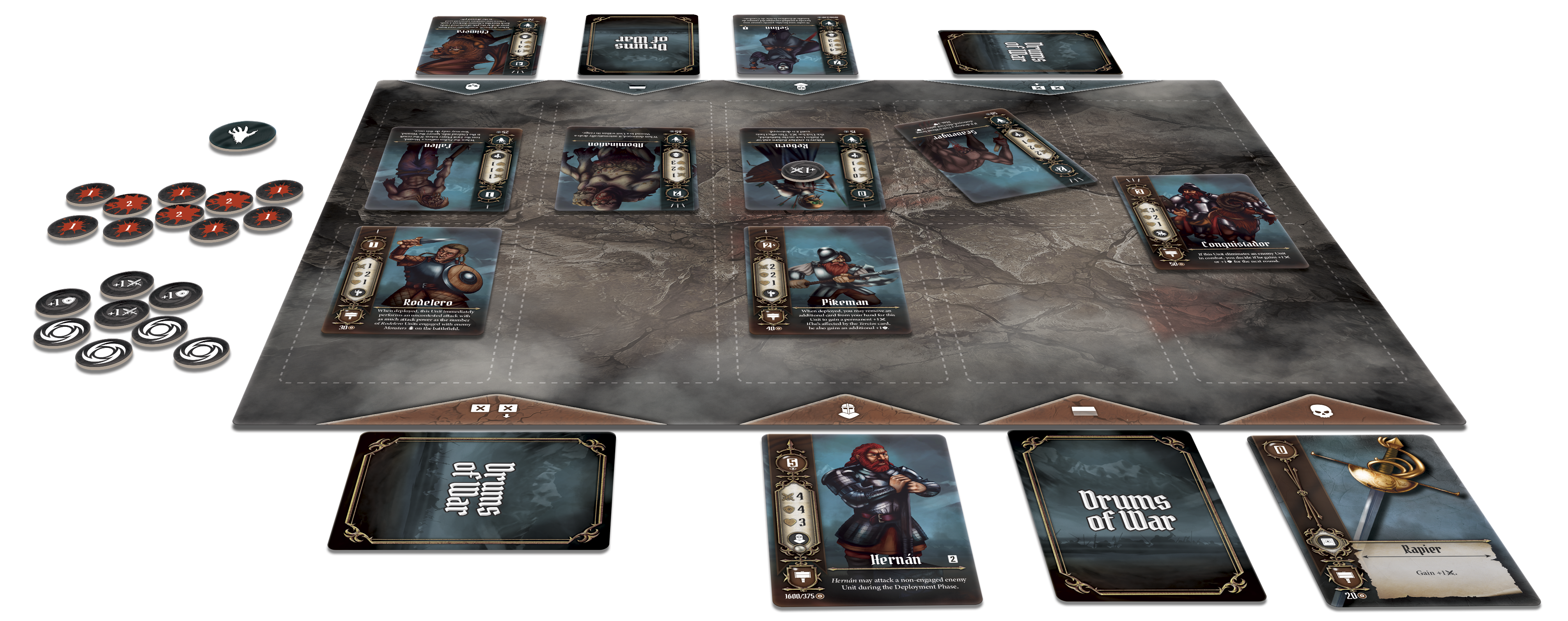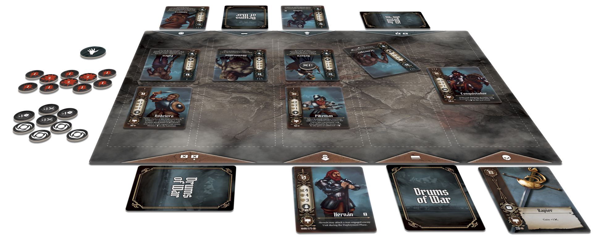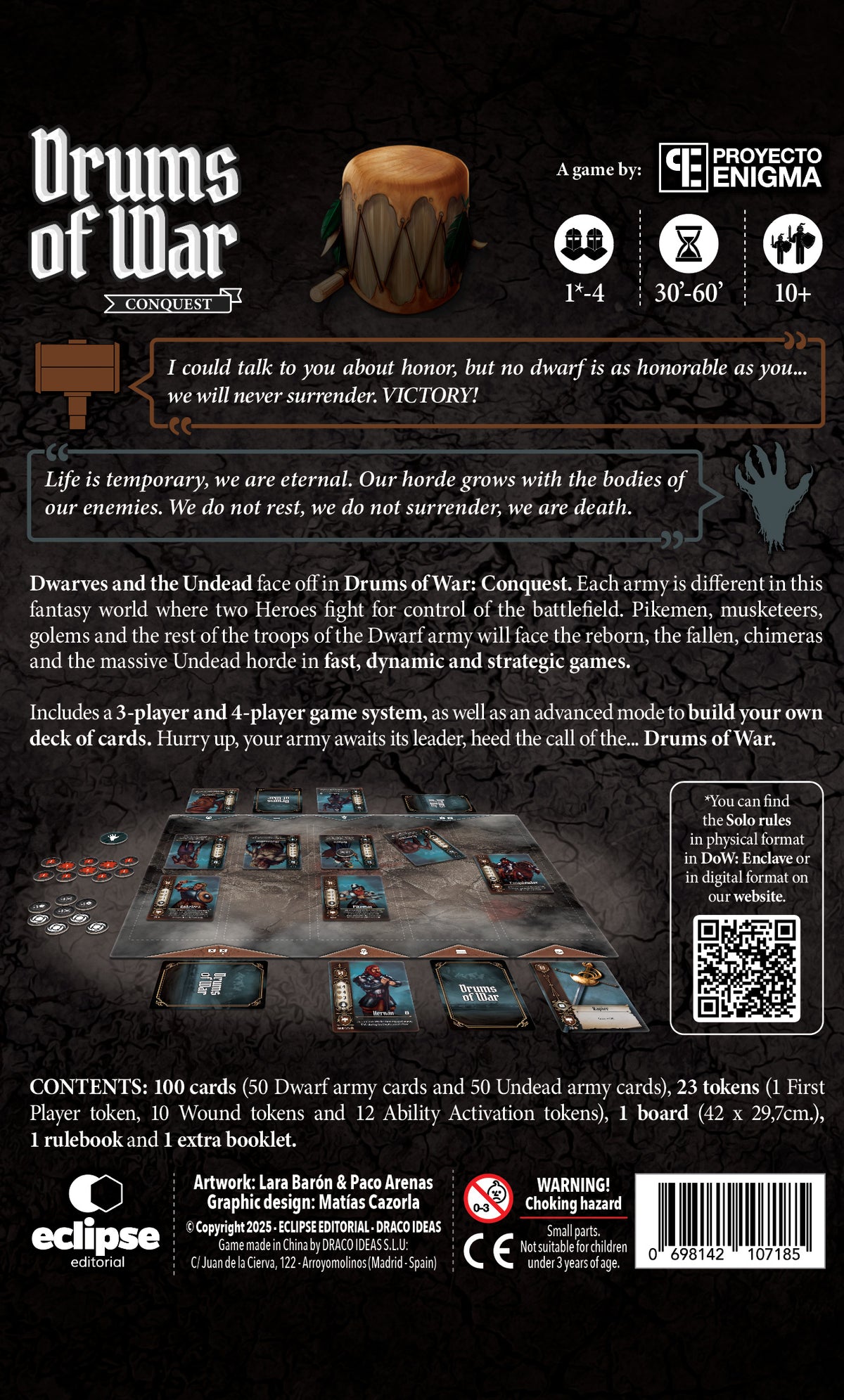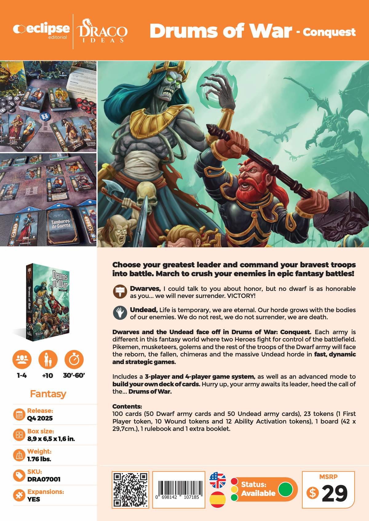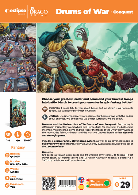 Dwarves and the Undead face off in Drums of War: Conquest. Each army is different in this fantasy world where two Heroes fight for control of the battlefield. Pikemen, musketeers, golems and the rest of the troops of the Dwarf army will face the reborn, the fallen, chimeras and the massive Undead horde in fast, dynamic and strategic games.