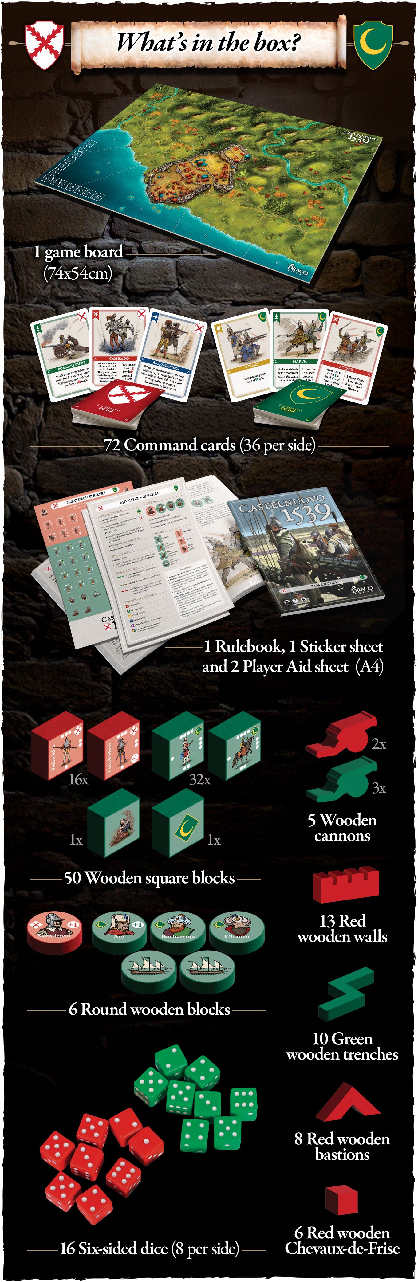 Components: 1 Game board (74 x 54 cm), 16 Six-sided dice, 72 Command cards, 1 Sticker sheet for the wooden blocks, 1 Rulebook with historical commentary, 2 Player Aid sheets, 98 wooden markers.