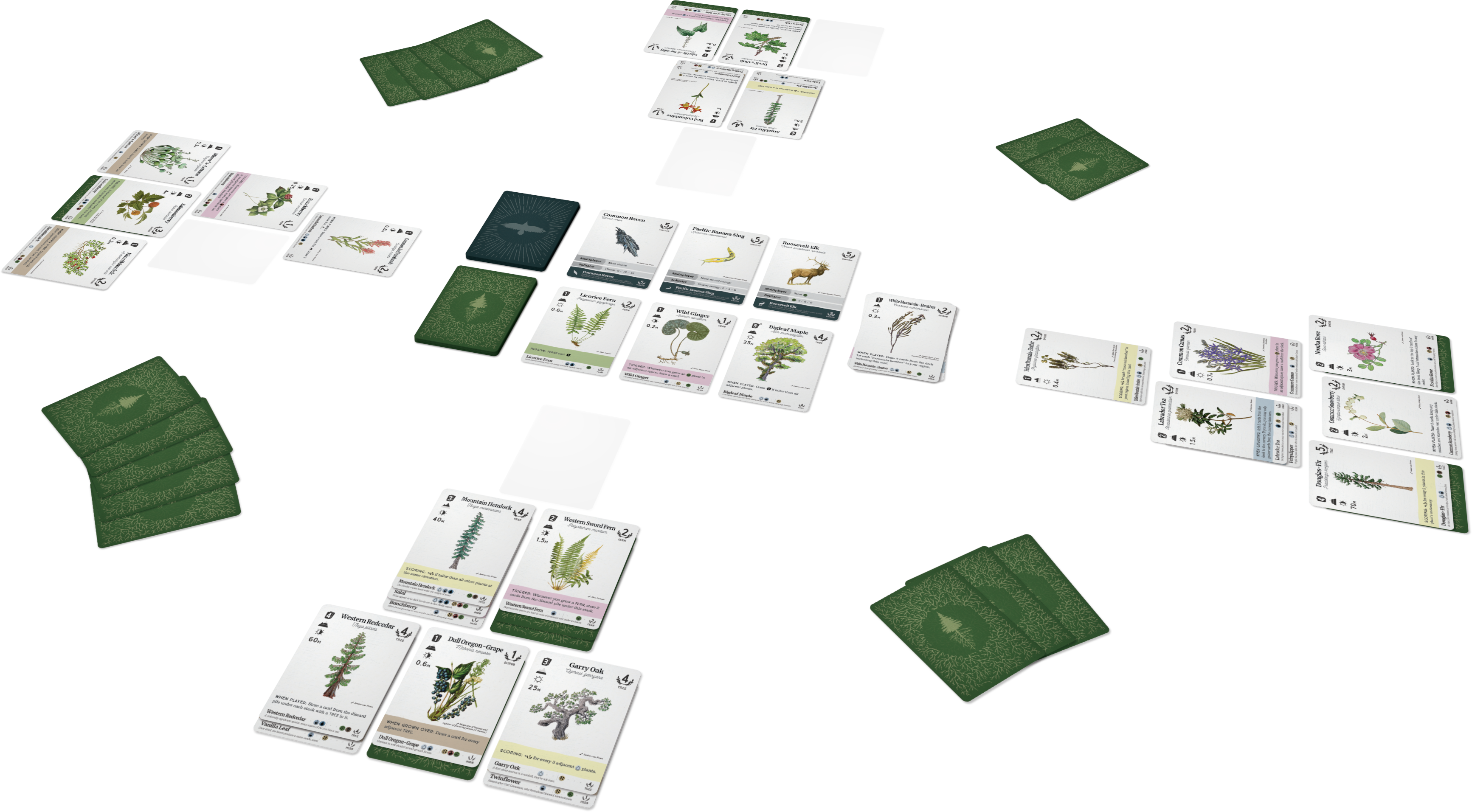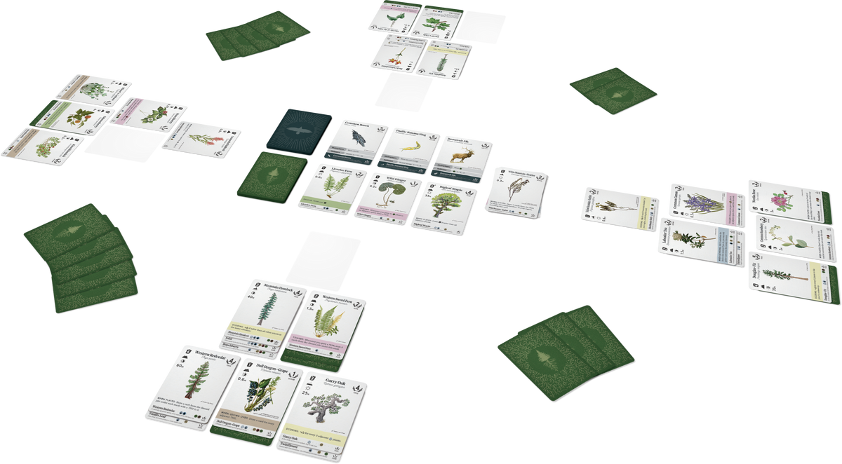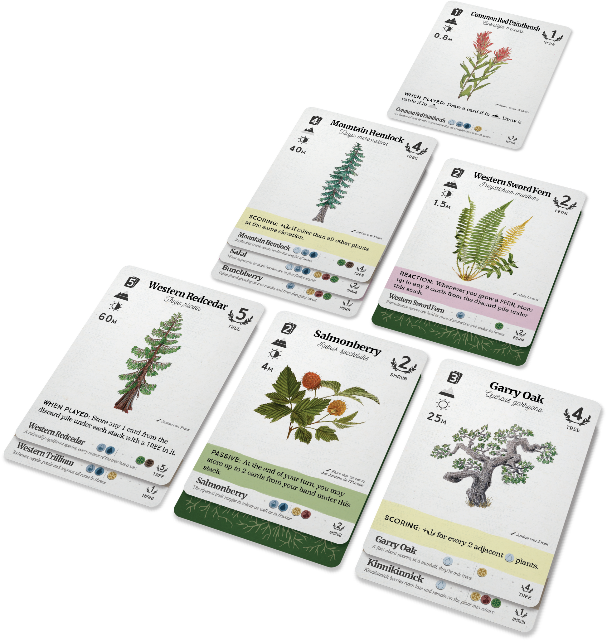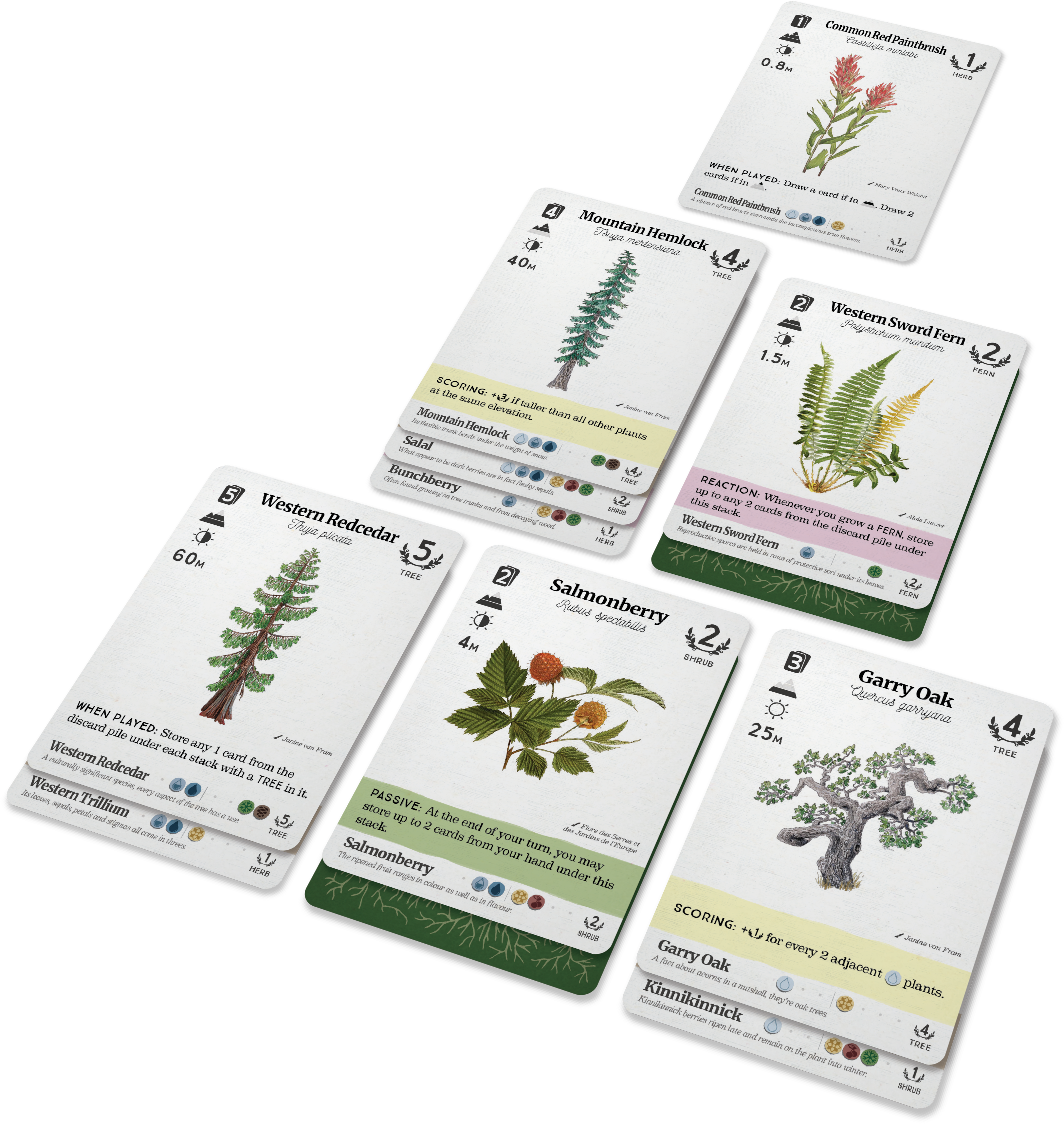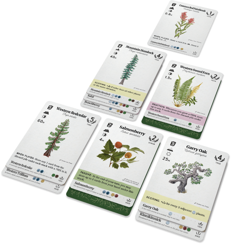 On your turn, you'll choose one of two actions: gather plants or play a plant. Each introduced plant has specific growing conditions and contributes to a growing ecosystem of interconnected abilities. Space is limited, but taller plants can be grown over pioneer species at a reduced cost.
