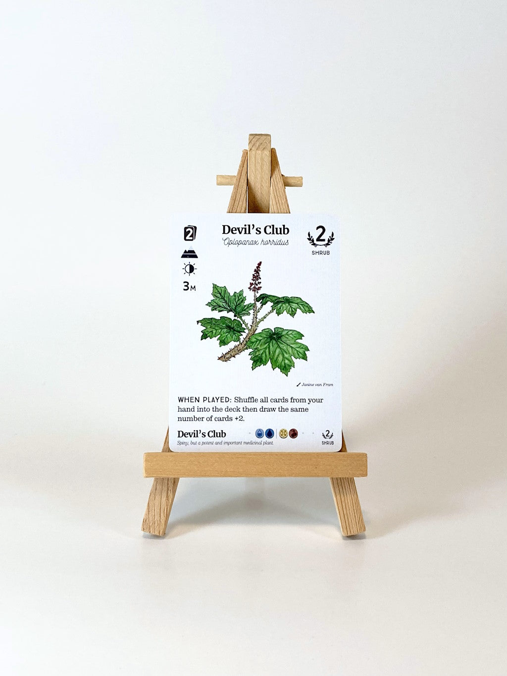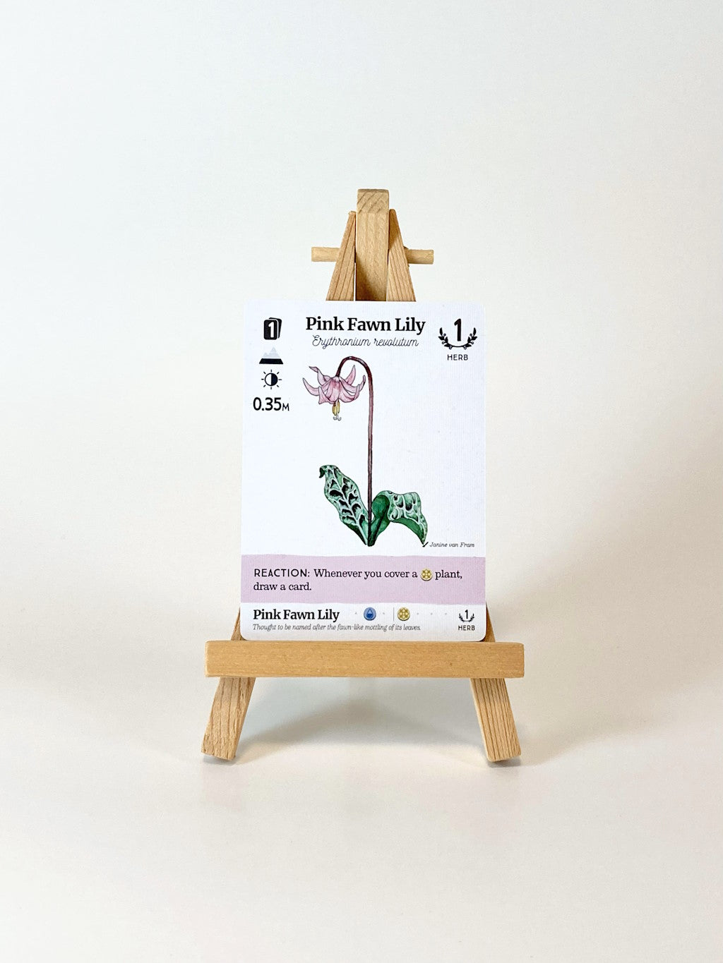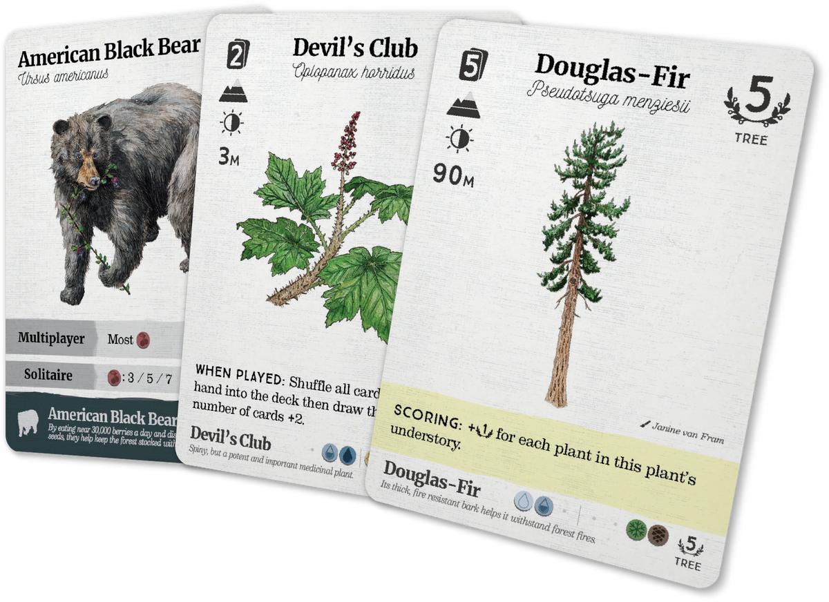 On your turn, you'll choose one of two actions: gather plants or play a plant. Each introduced plant has specific growing conditions and contributes to a growing ecosystem of interconnected abilities. Space is limited, but taller plants can be grown over pioneer species at a reduced cost.