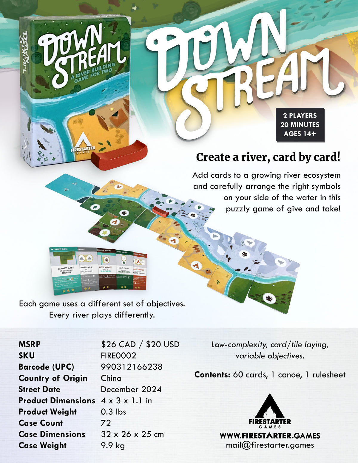 Downstream is a 2 player card laying game where players create a river together, attempting to enrich their own shoreline without helping their opponent accross the river.