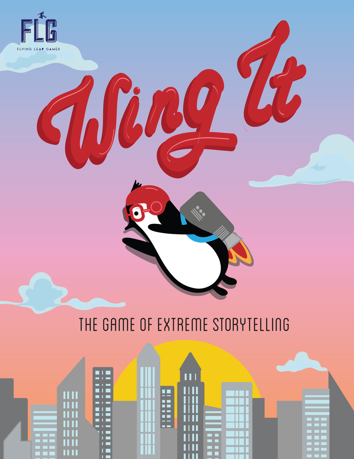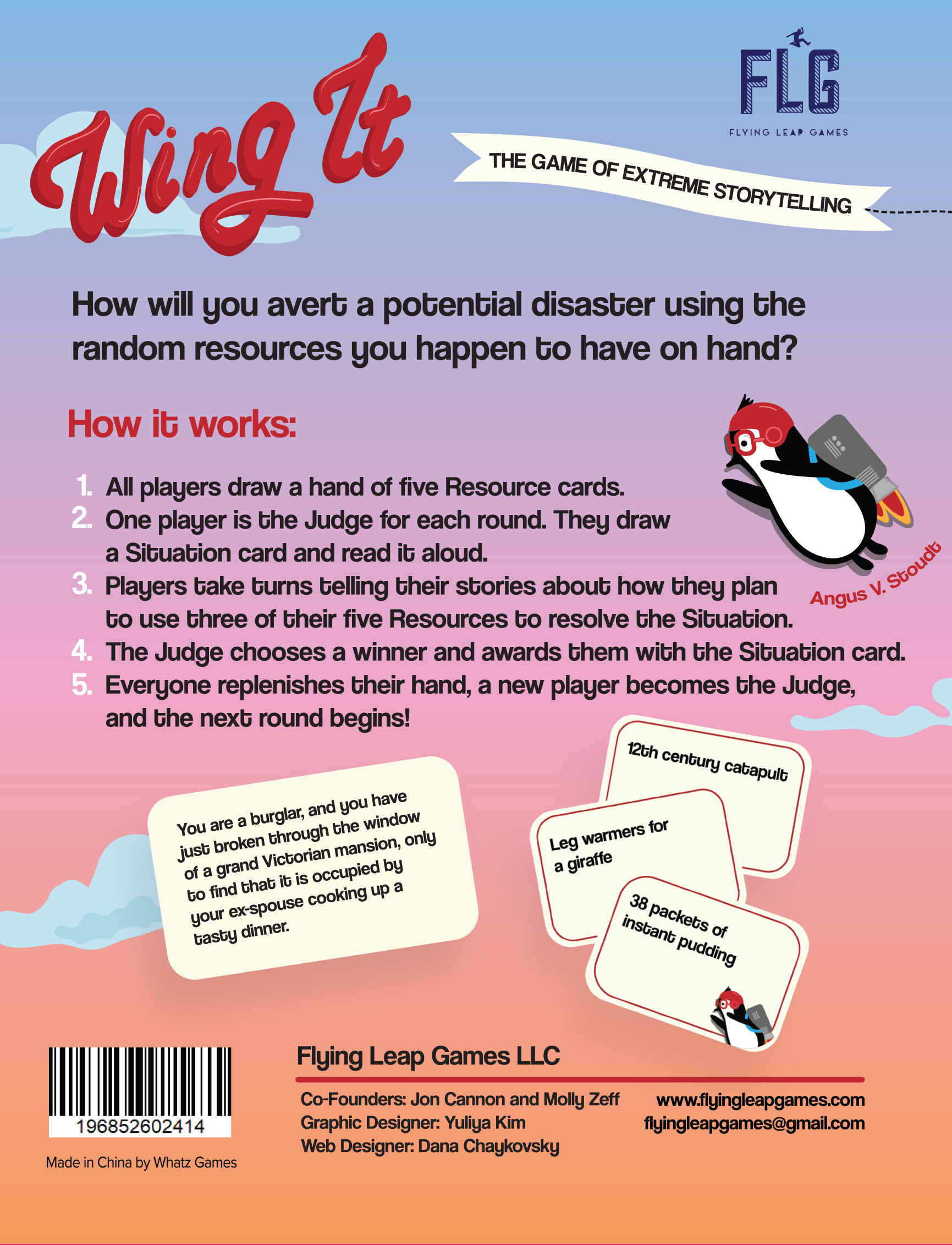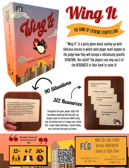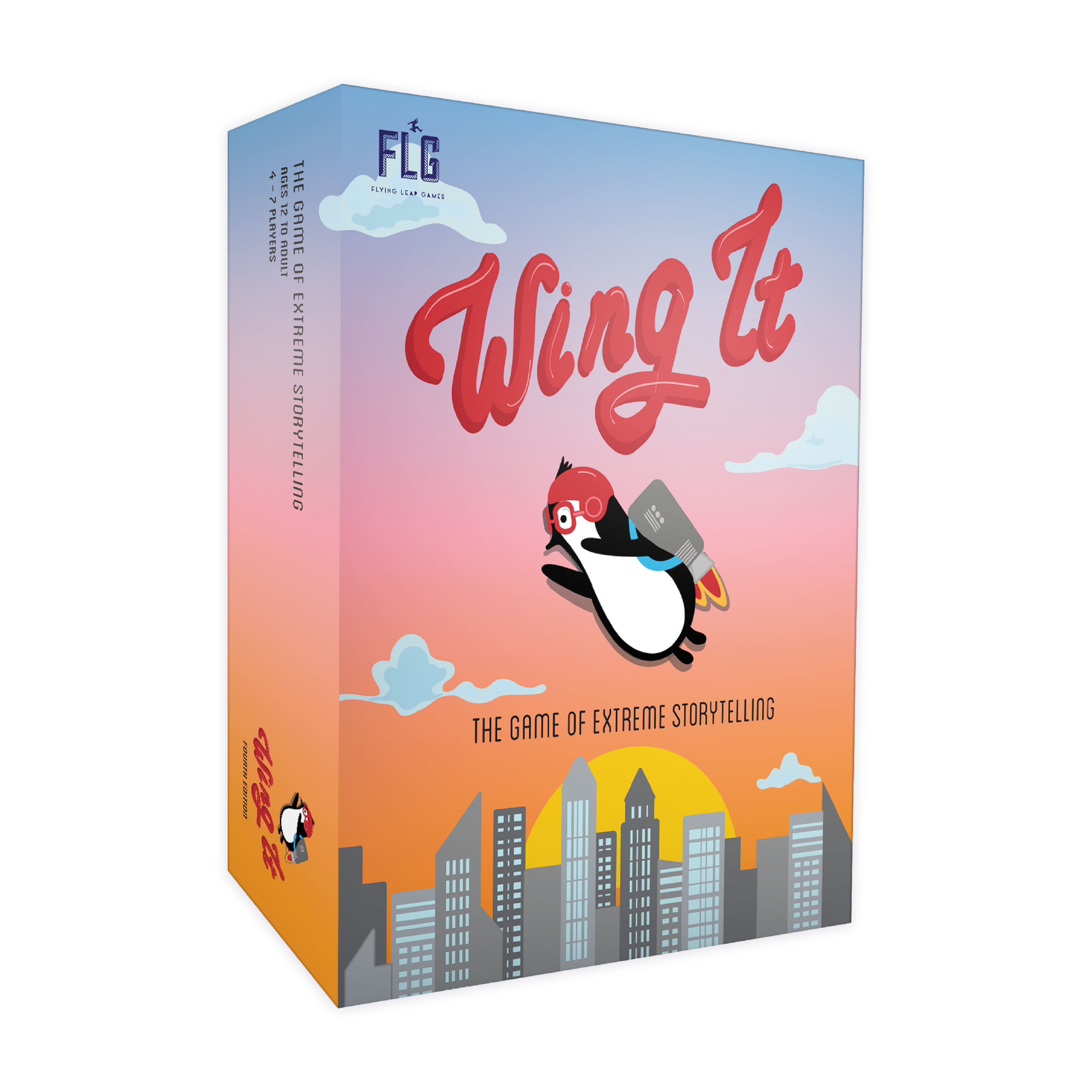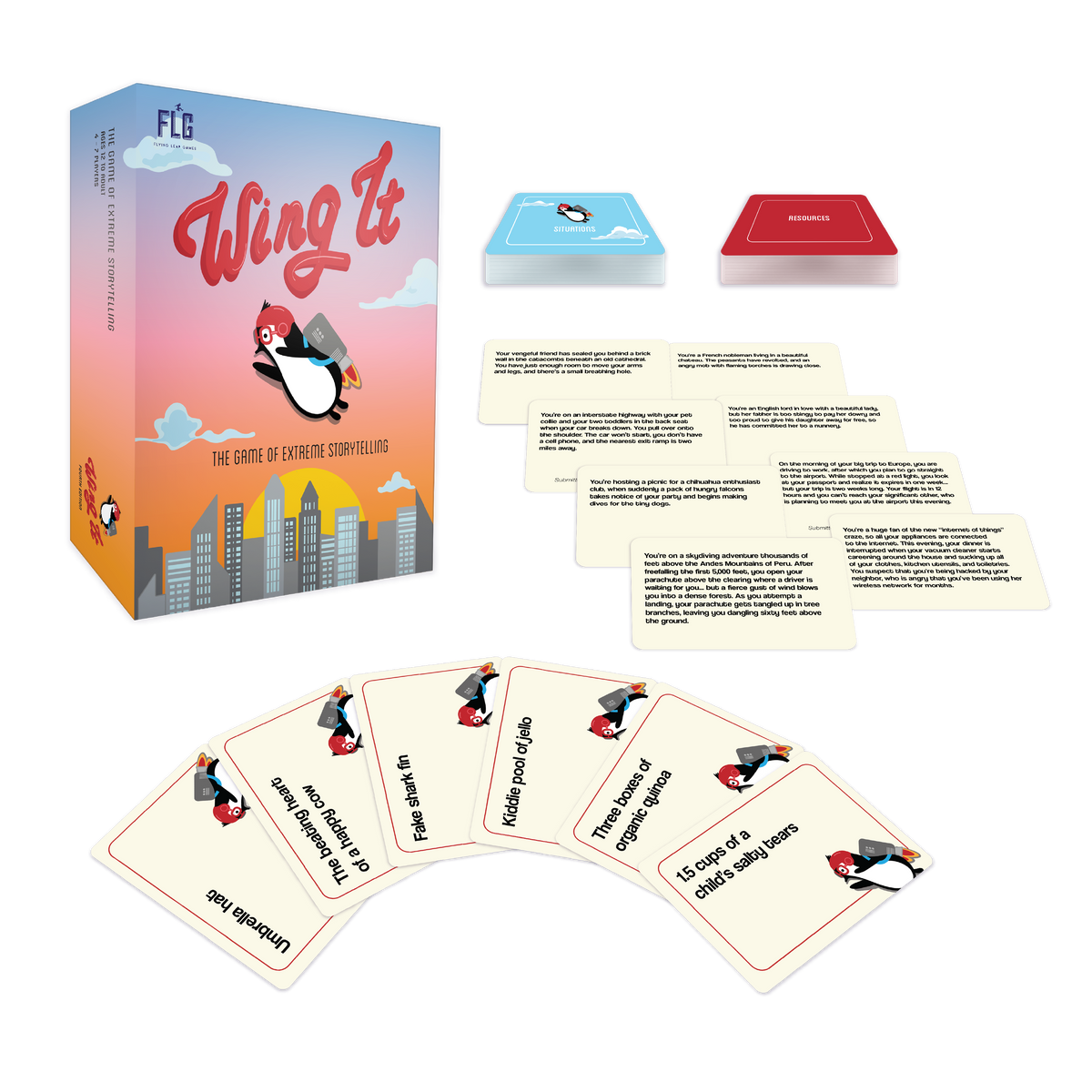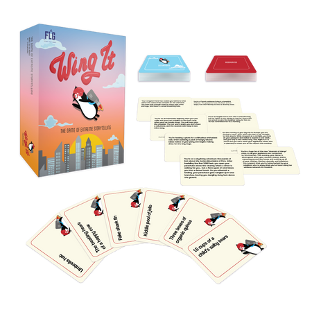 Wing It is a hilarious storytelling game that's perfect for game nights, parties, classrooms, and a low key bonding activity with new people in your life. In this party game, you and your friends pit your imaginations against each other as you dream up ways to overcome unlikely challenges (e.g. you are being chased by a pack of rare carnivorous rabbits...) with an even unlikelier funny set of resources (...and all you have is an ice axe, ten coconuts, a set of snow tires, one pound of leg hair, and a complete collection of Hitchcock films).