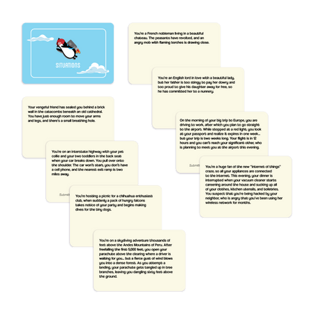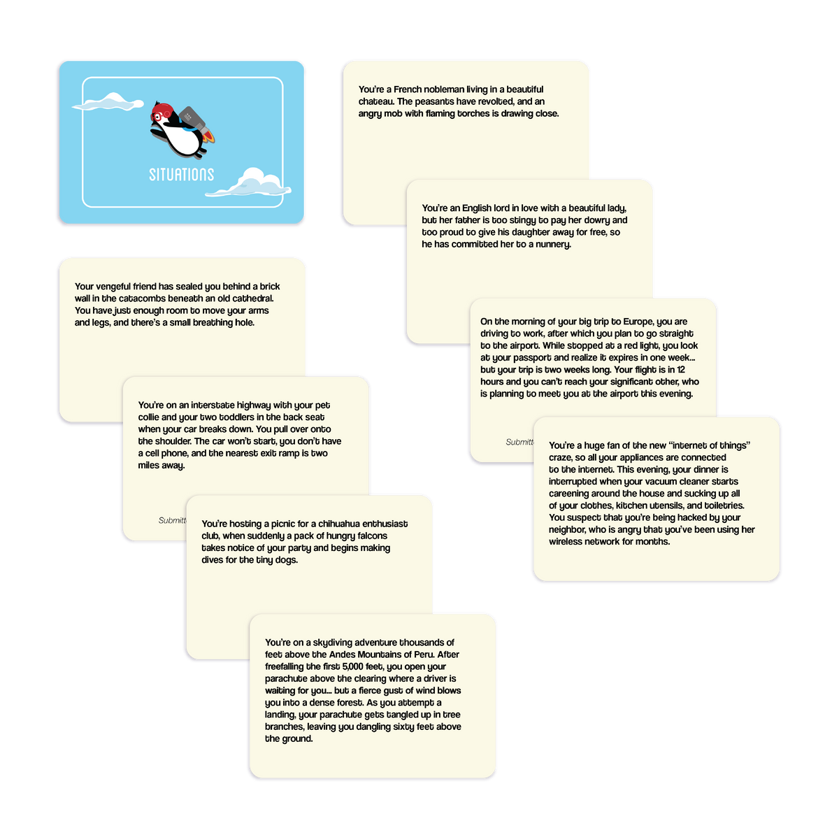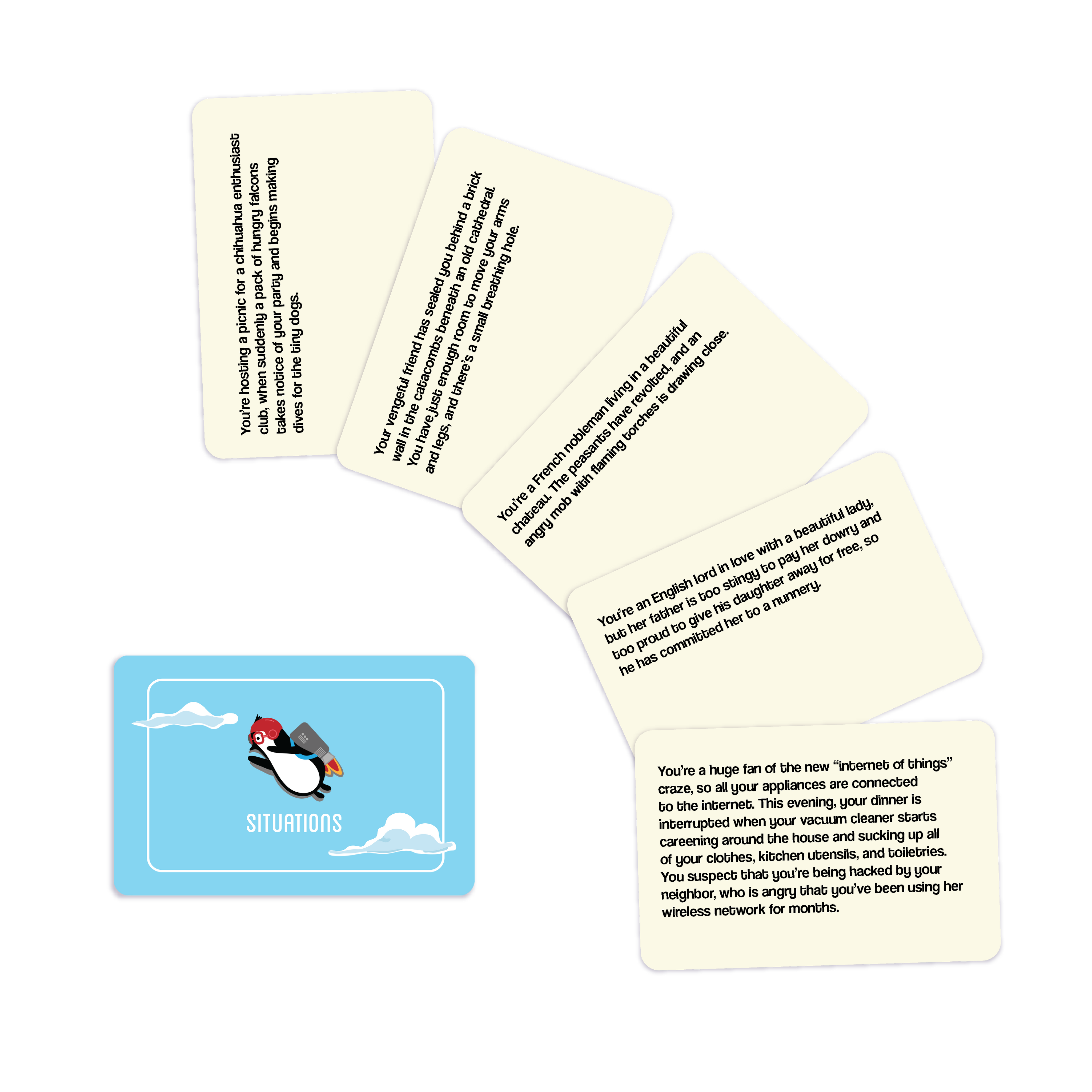 The first player to 3 situation cards wins, but the real fun is in the stories!