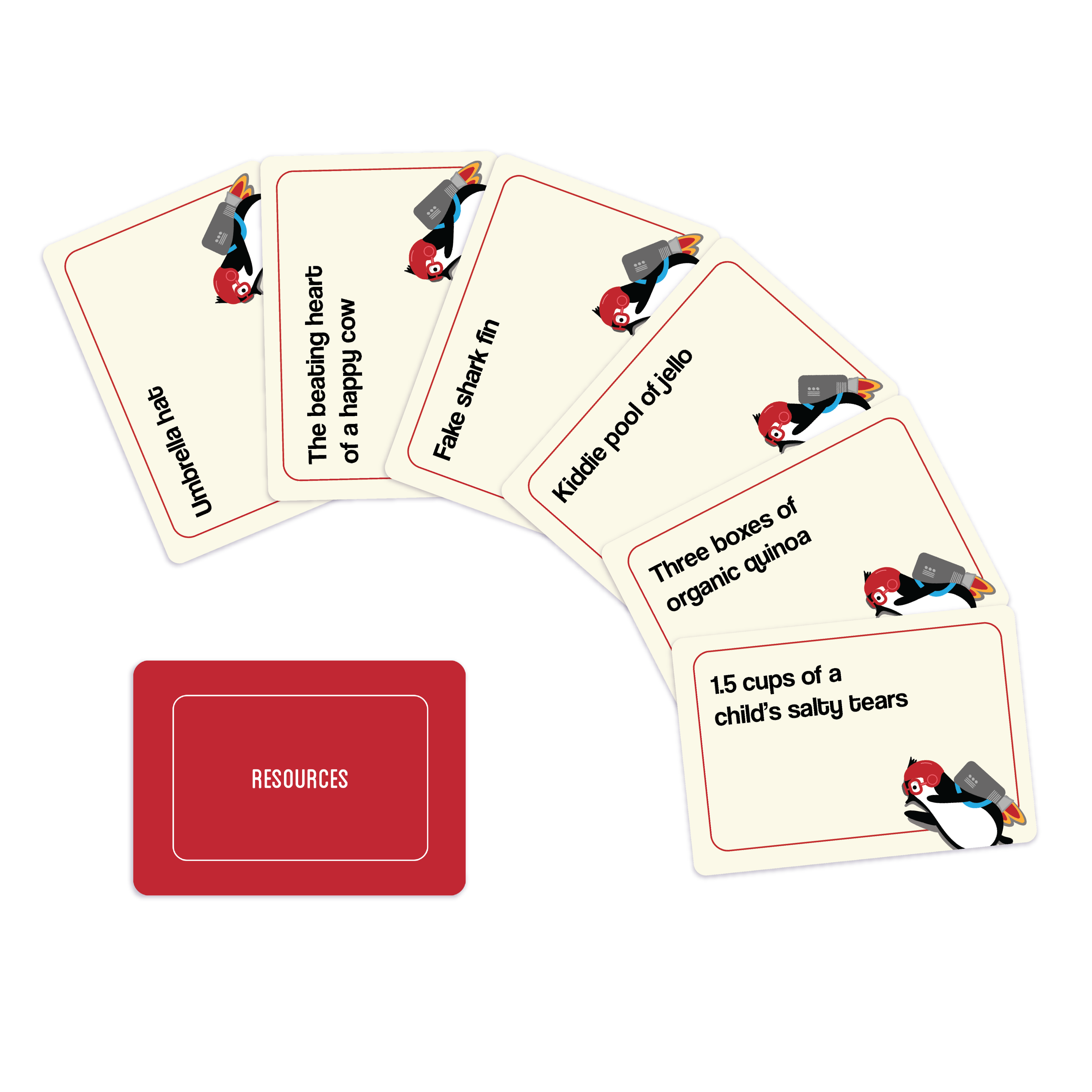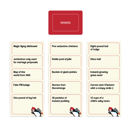Each round, a judge reads aloud a challenging situation. Each player then comes up with a story about how they'll solve the situation using exactly three of the five resources in their hand, and then everyone takes a turn pitching their story to the judge. A winning story is selected, a new player becomes the judge, and the next round begins.