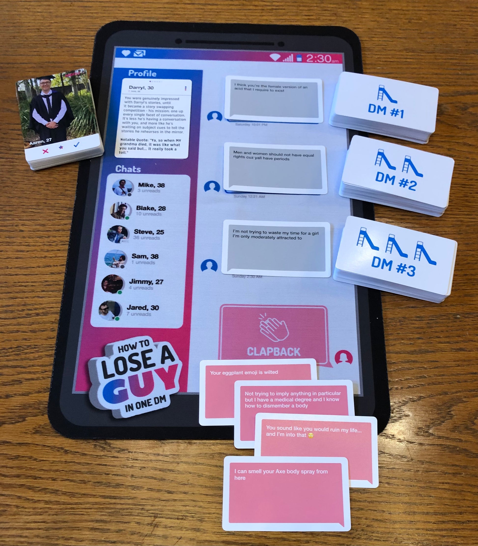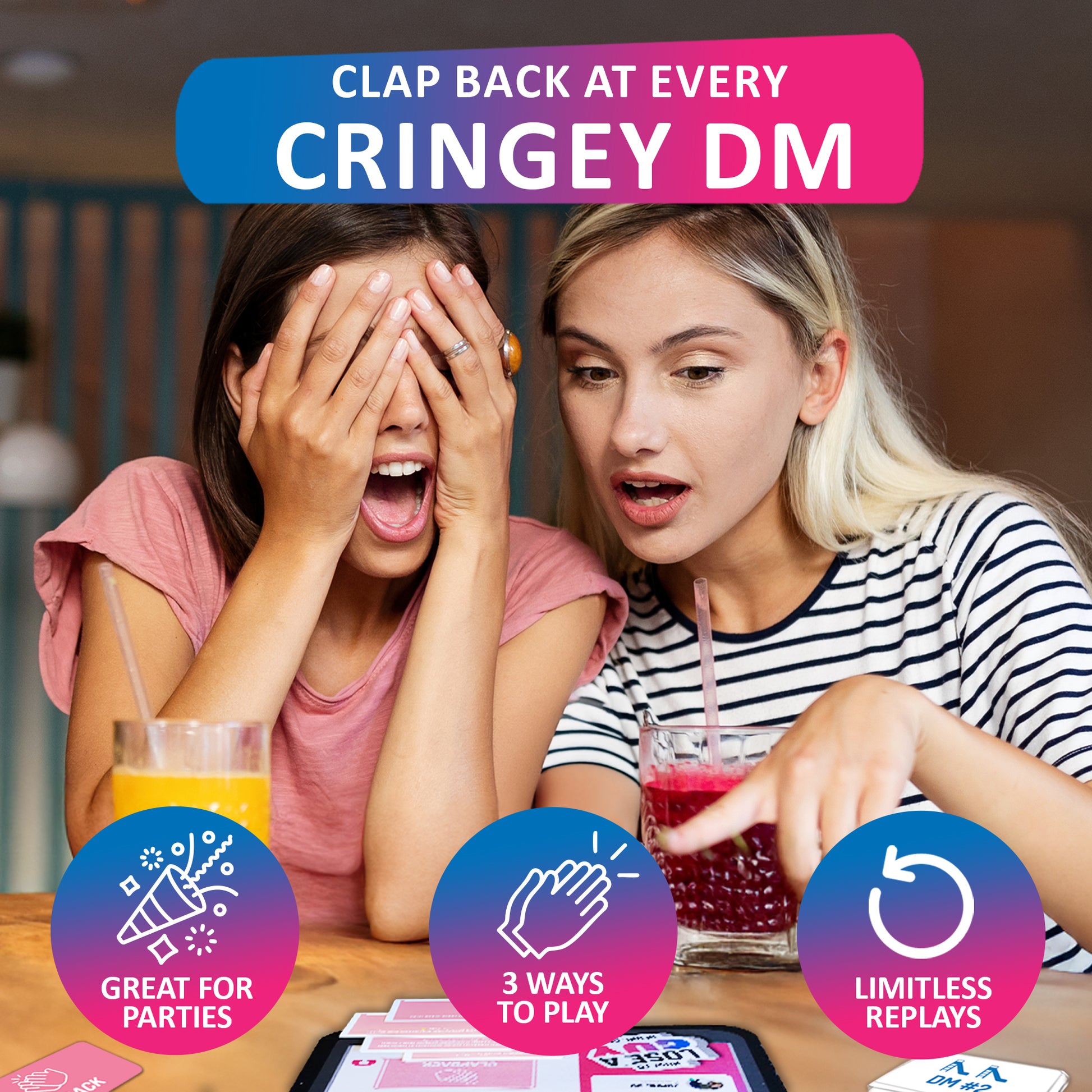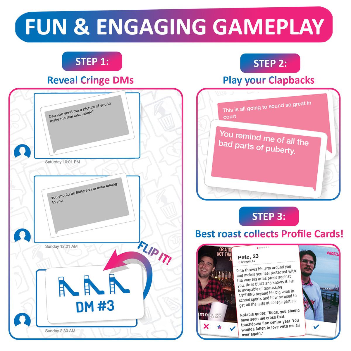 Finally, a game that makes fun of all the cringiest, weirdest, and just straight up AWFUL comments that soooo many of us have dealt with on dating apps. The game play is simple and hilarious: a Judge reads aloud the dude's profile and then deals out 3 of his texts sliding into your DMs later and later at night as they get more cringe.... then the other players "Clapback" with their funniest response. Players can choose to share a creative defense about why their response is BEST or just read aloud their funniest reply in the sassiest voice possible!
