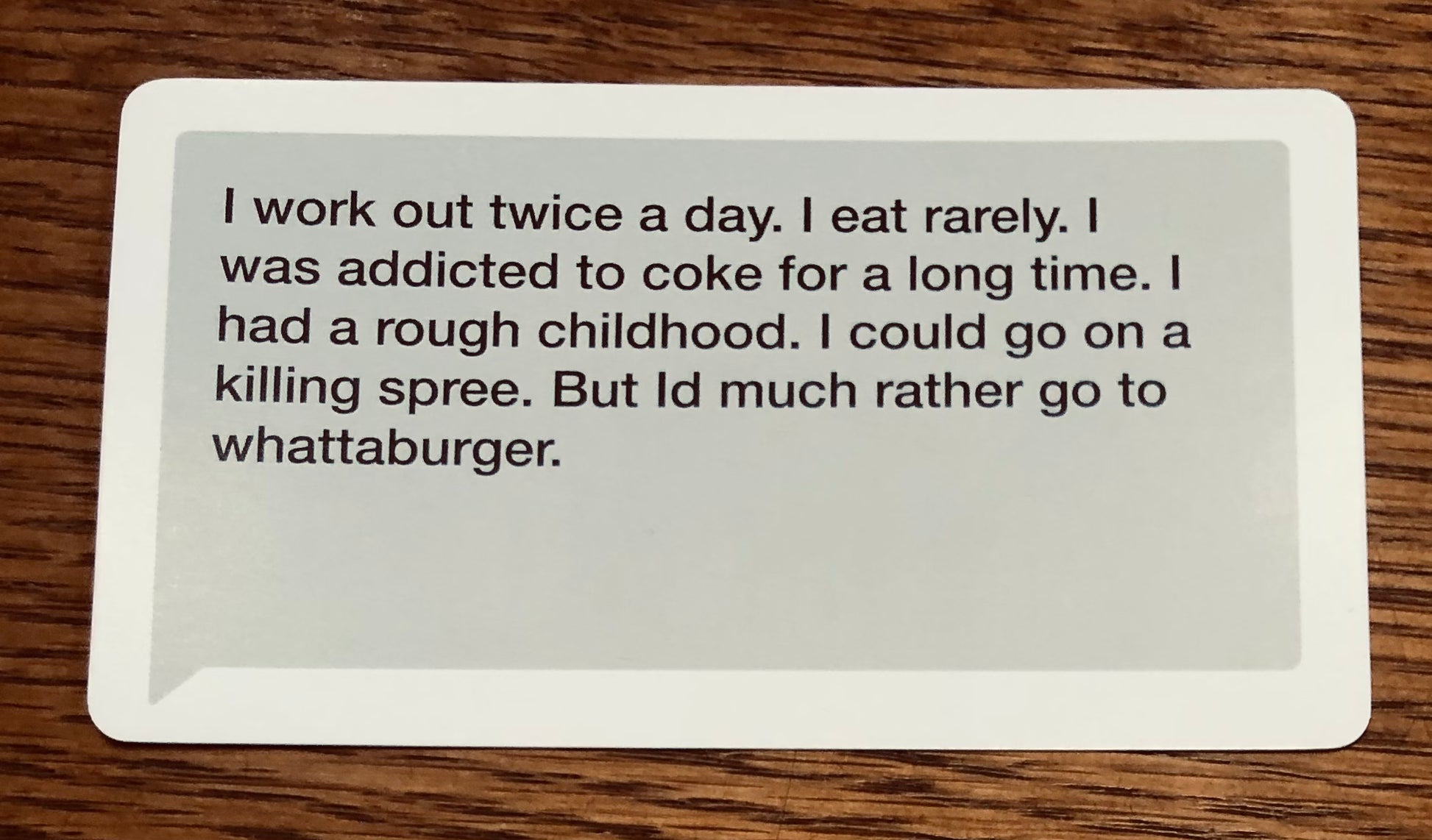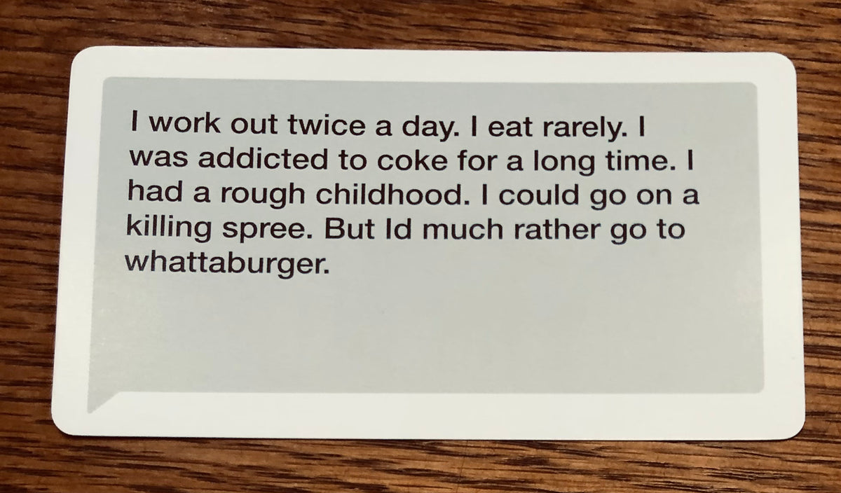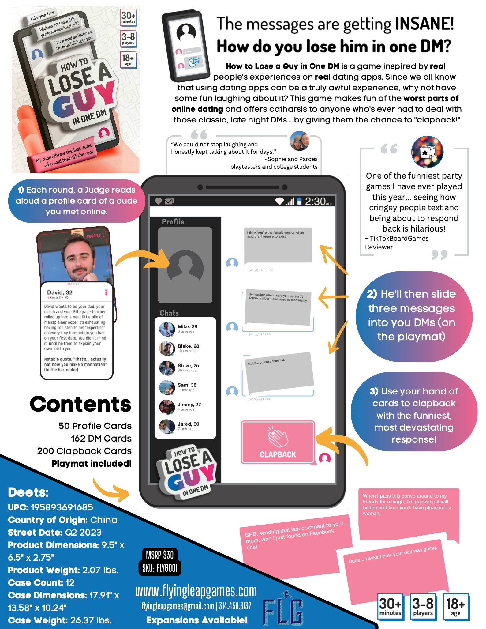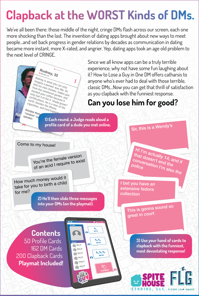 Finally, a game that makes fun of all the cringiest, weirdest, and just straight up AWFUL comments that soooo many of us have dealt with on dating apps. The game play is simple and hilarious: a Judge reads aloud the dude's profile and then deals out 3 of his texts sliding into your DMs later and later at night as they get more cringe.... then the other players "Clapback" with their funniest response. Players can choose to share a creative defense about why their response is BEST or just read aloud their funniest reply in the sassiest voice possible!