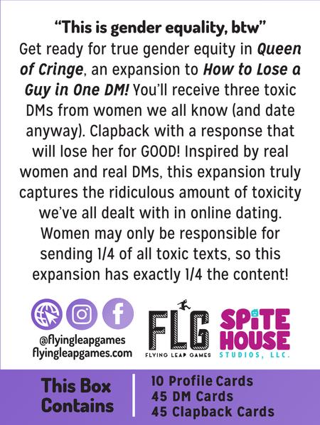 Get ready for true gender equity in Queen of Cringe, an expansion to How to Lose a Guy in One DM! You’ll receive three toxic DMs from women we all know (and date anyway), and your job is to clapback with a response that will lose her for GOOD!