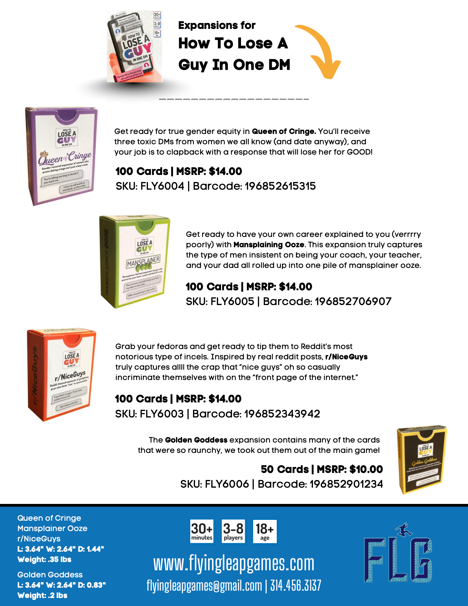 Inspired by real women and real DMs, this expansion truly captures the ridiculous amount of toxicity we’ve all dealt with in online dating. Women may only be responsible for sending 1/4 of all toxic texts, so this expansion has exactly 1/4 the content!