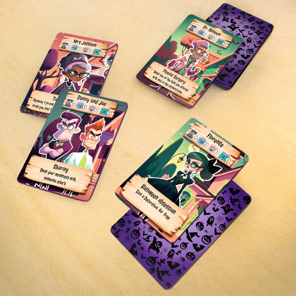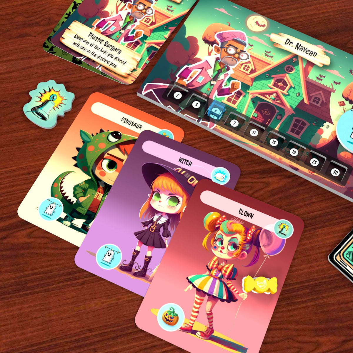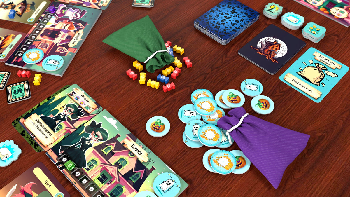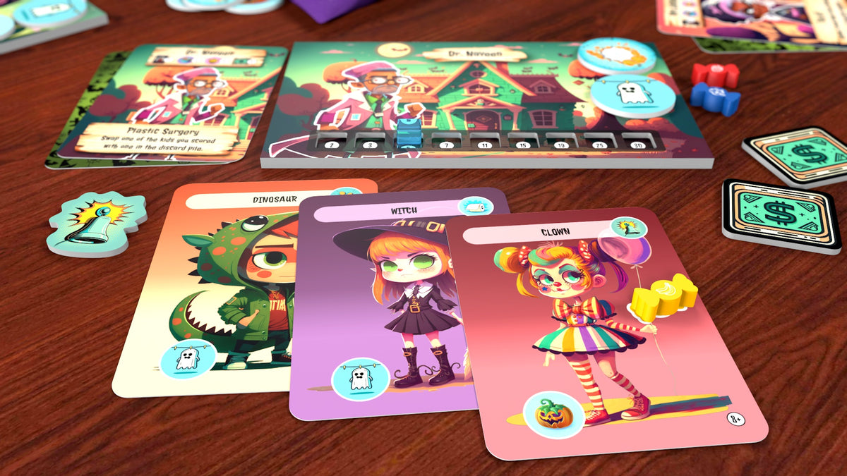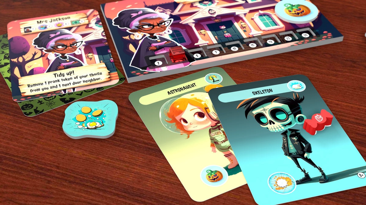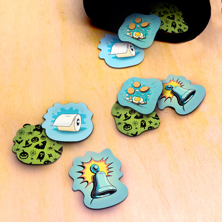 💥 On your turn, draw a Trick-or-Treater card and send it to the poor soul holding the cursed Ding-Dong token. Will they bribe the kid with treats, spend precious decorations to scare them off, or suffer a prank that could ruin their night?