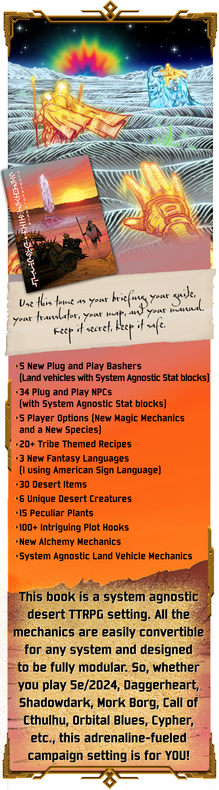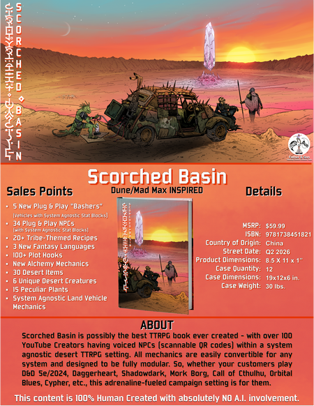 There are over 100 of the top TTRPG YouTube, Instagram, and TikTok influencers having voiced NPCs within the book (scannable QR codes linking to audio voicovers for game players to enjoy and find inspiration from). Also, all mechanics are easily convertible for any system and designed to be fully modular. So, whether your customers play D&D 5e/2024, Daggerheart, Shadowdark, Mork Borg, Call of Cthulhu, Orbital Blues, Cypher, or any other TTRPG, this adrenaline-fueled campaign setting is for them.