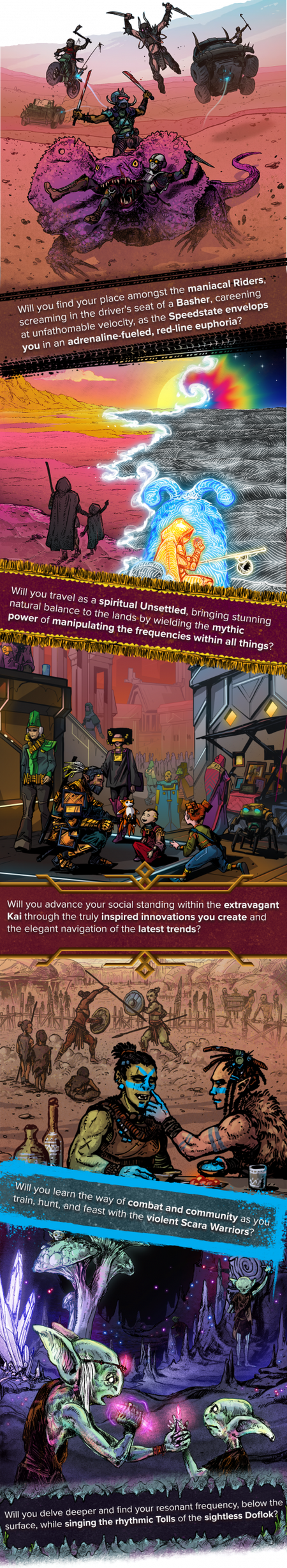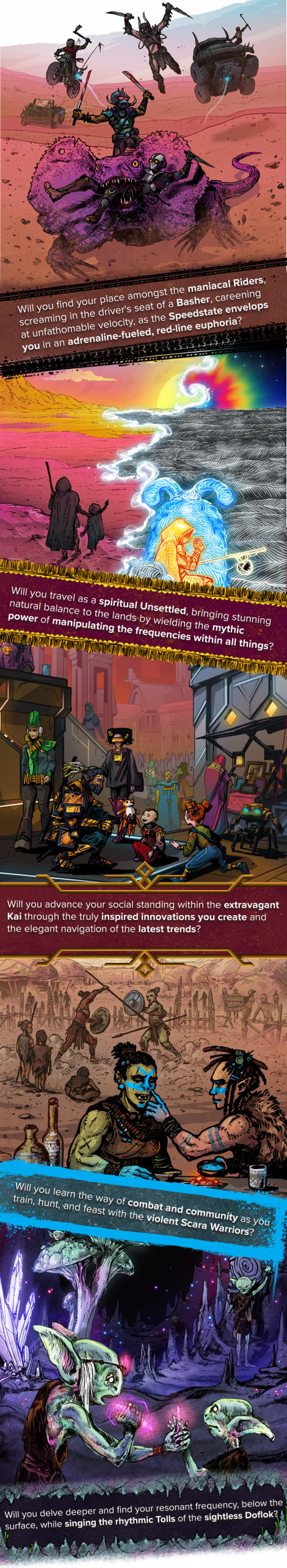 This sweltering land is jammed full of everything one might need for a campaign. Equally, if GMs already have an established world/setting, the Scorched Basin is the perfect pocket of exploration they can insert into those worlds allowing their players to delve into a new, wild-style of adventure.
