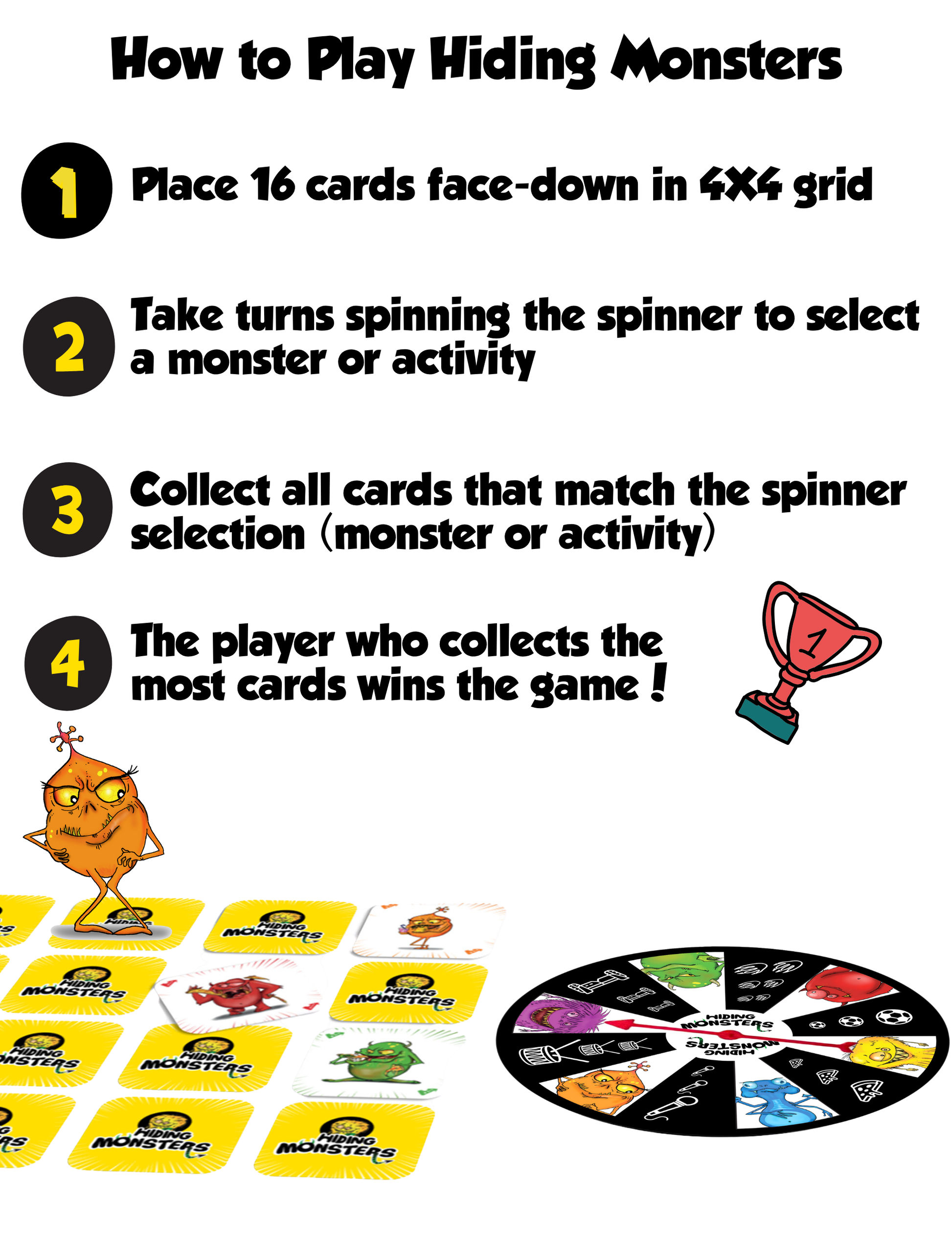Easy-to-Play: Spin the wheel to reveal a monster or an activity. Find and collect all the matching cards. For example, if the spinner lands on "pizza," find all the cards with monsters eating pizza.