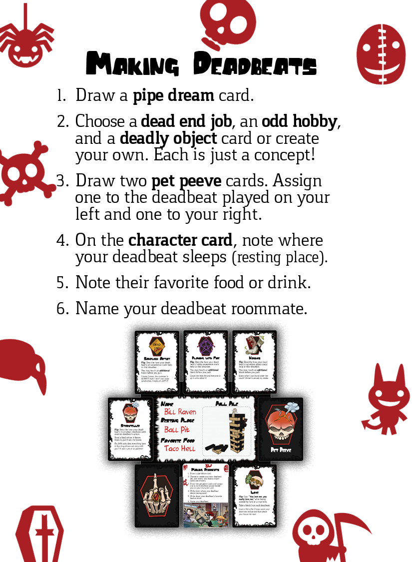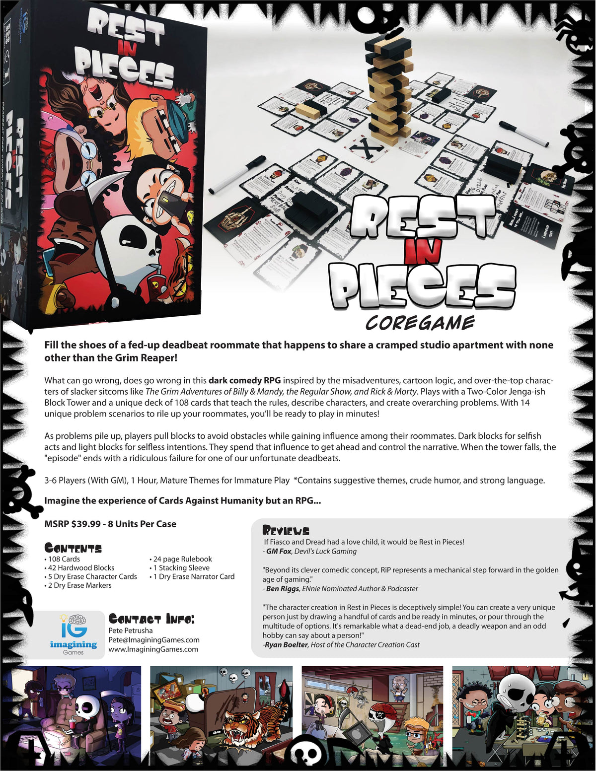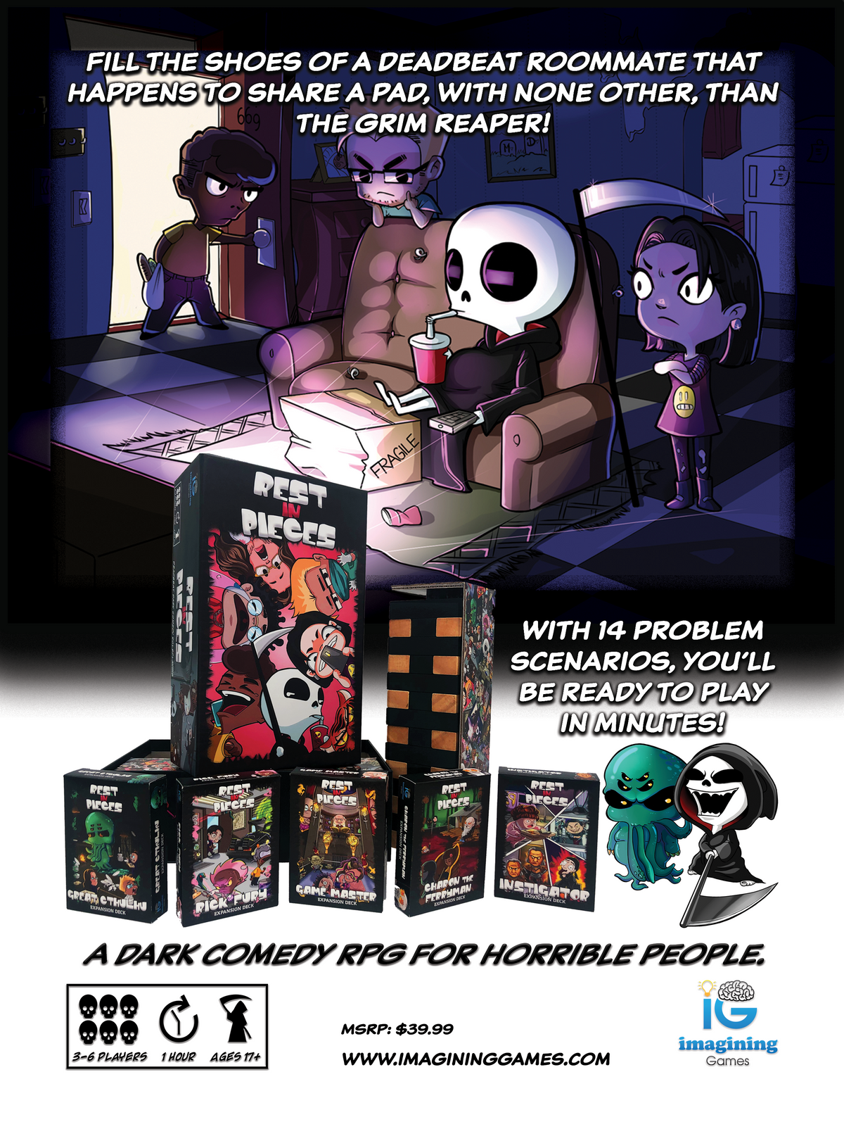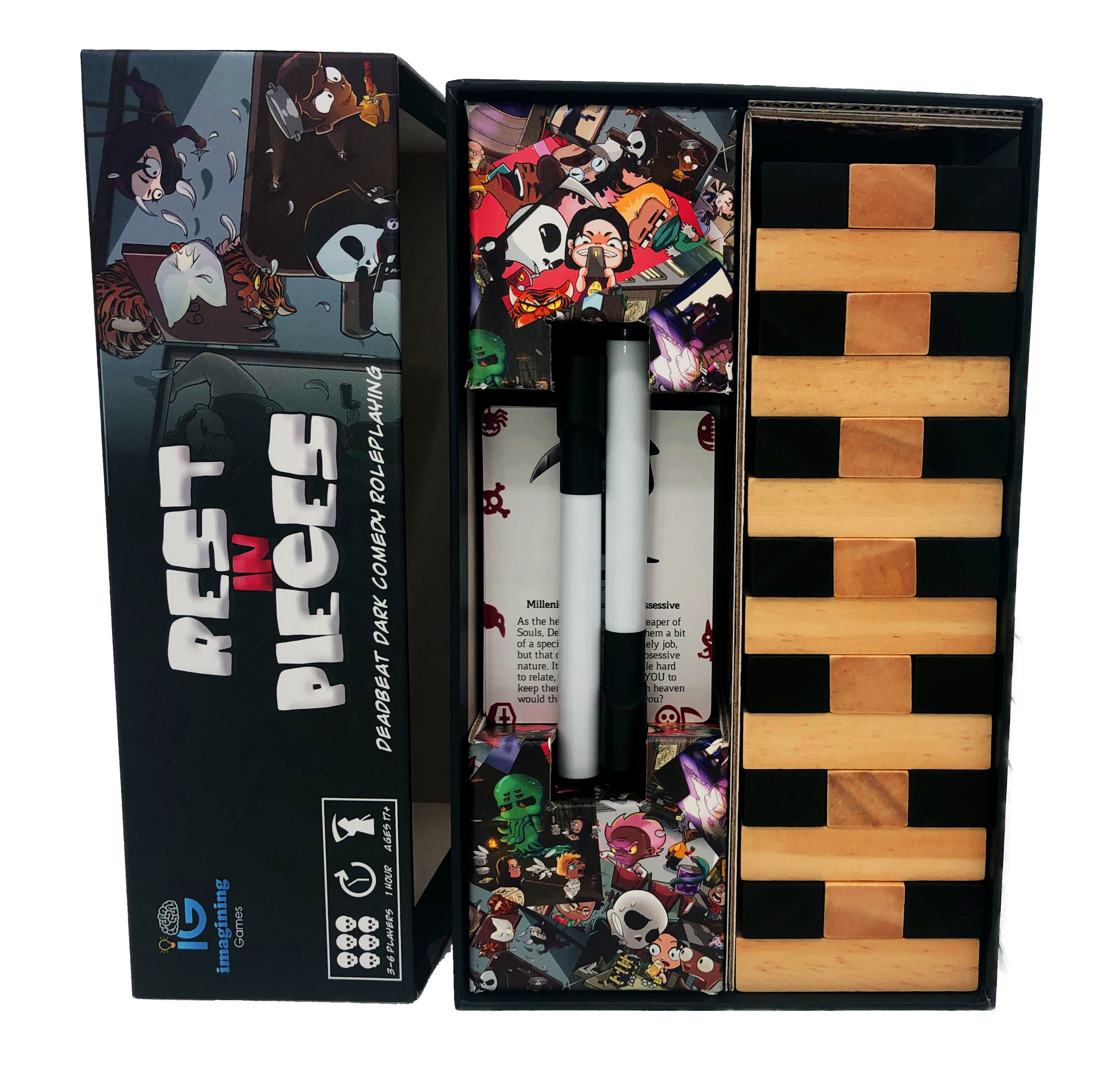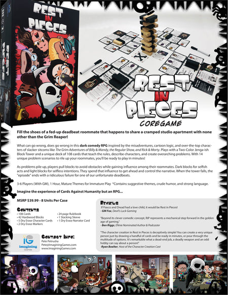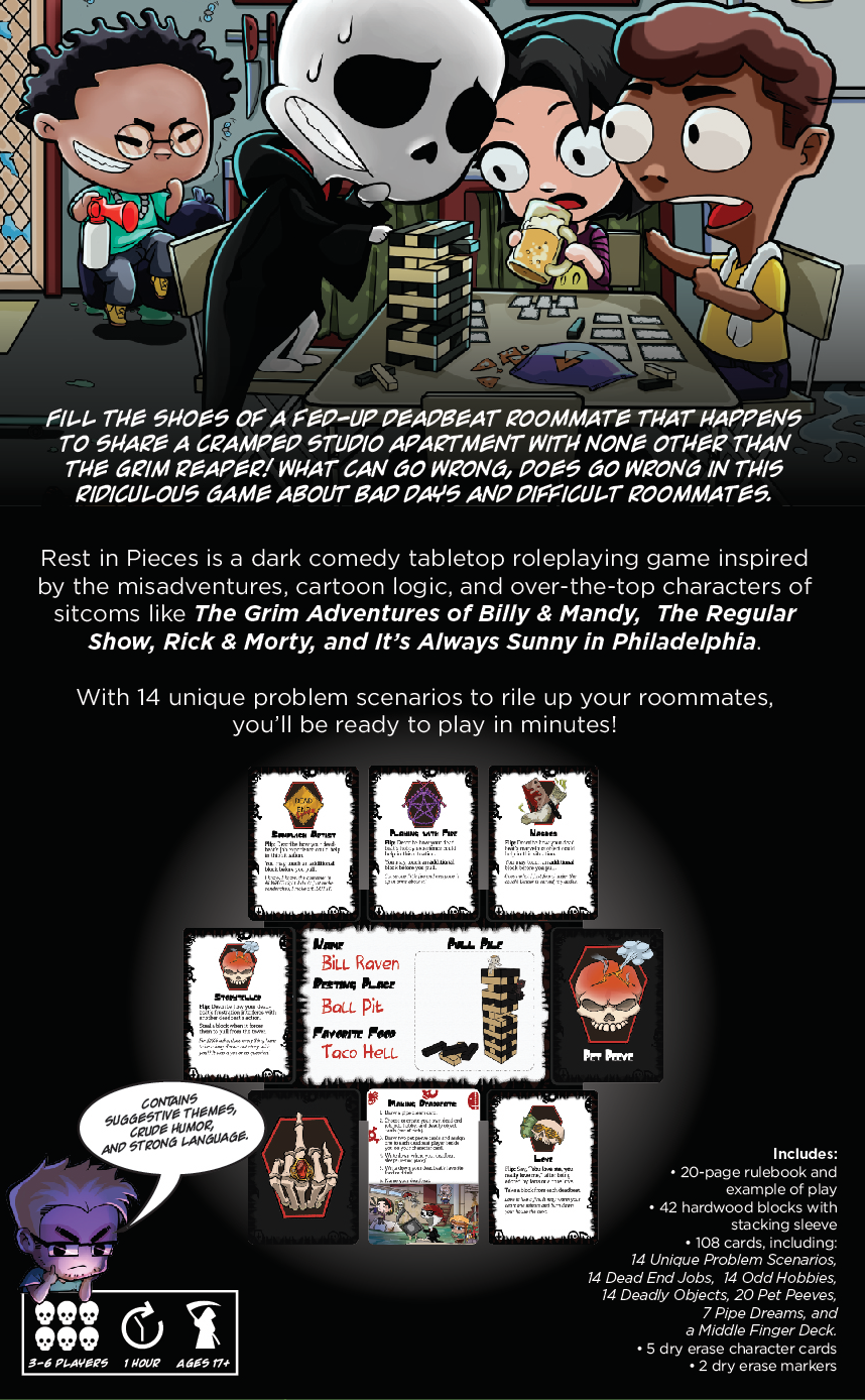 What can go wrong, does go wrong in this dark comedy RPG inspired by the misadventures, cartoon logic, and over-the-top characters of slacker sitcoms like The Grim Adventures of Billy & Mandy, the Regular Show, and Rick & Morty. Plays with a Two-Color Jenga-ish Block Tower and a unique deck of 108 cards that teach the rules, describe characters, and create overarching problems. With 14 unique problem scenarios to rile up your roommates, you'll be ready to play in minutes!