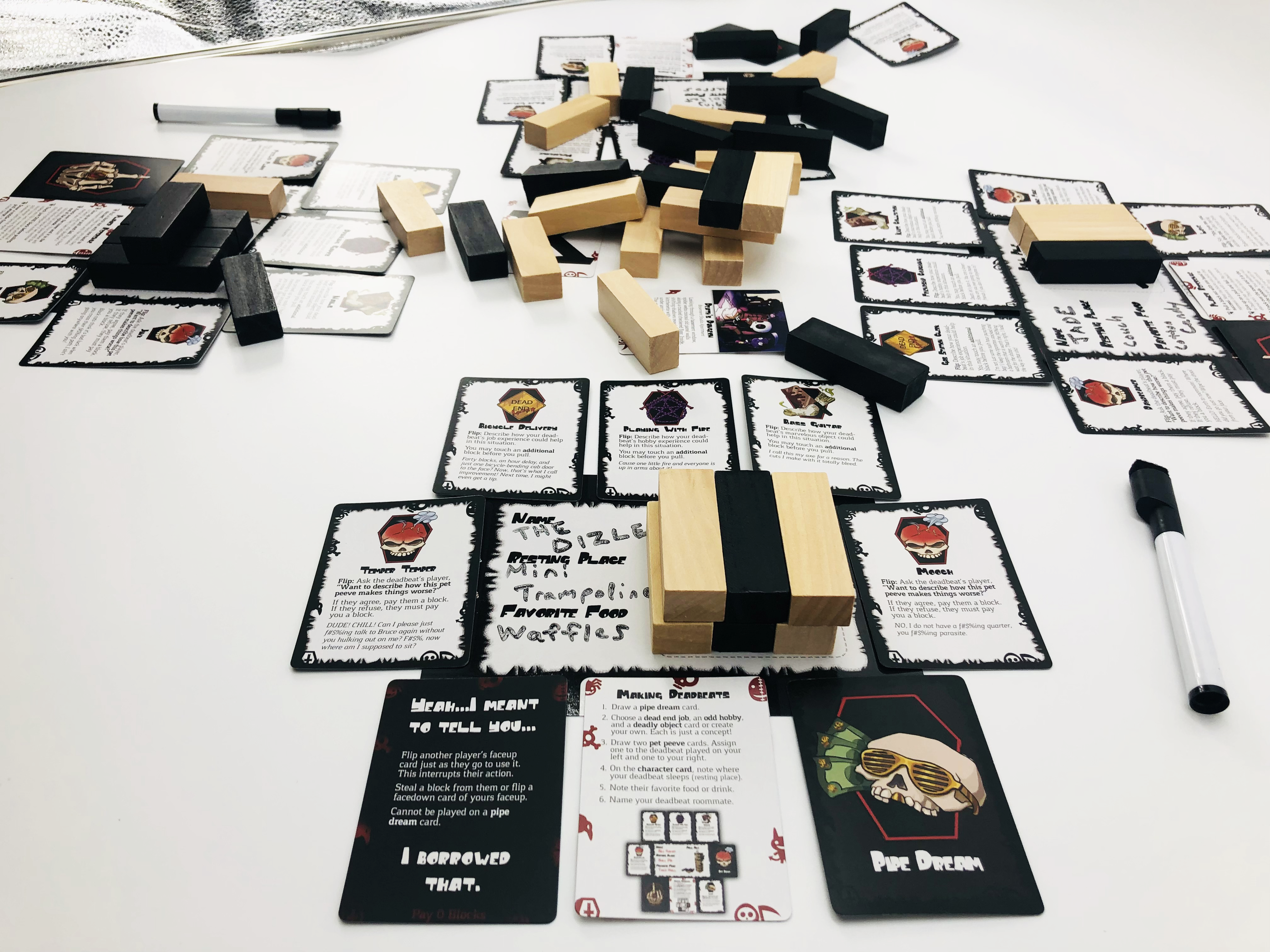 As problems pile up, players pull blocks to avoid obstacles while gaining influence among their roommates. Dark blocks for selfish acts and light blocks for selfless intentions. They spend that influence to get ahead and control the narrative. When the tower falls, the "episode" ends with a ridiculous failure for one of our unfortunate deadbeats.
