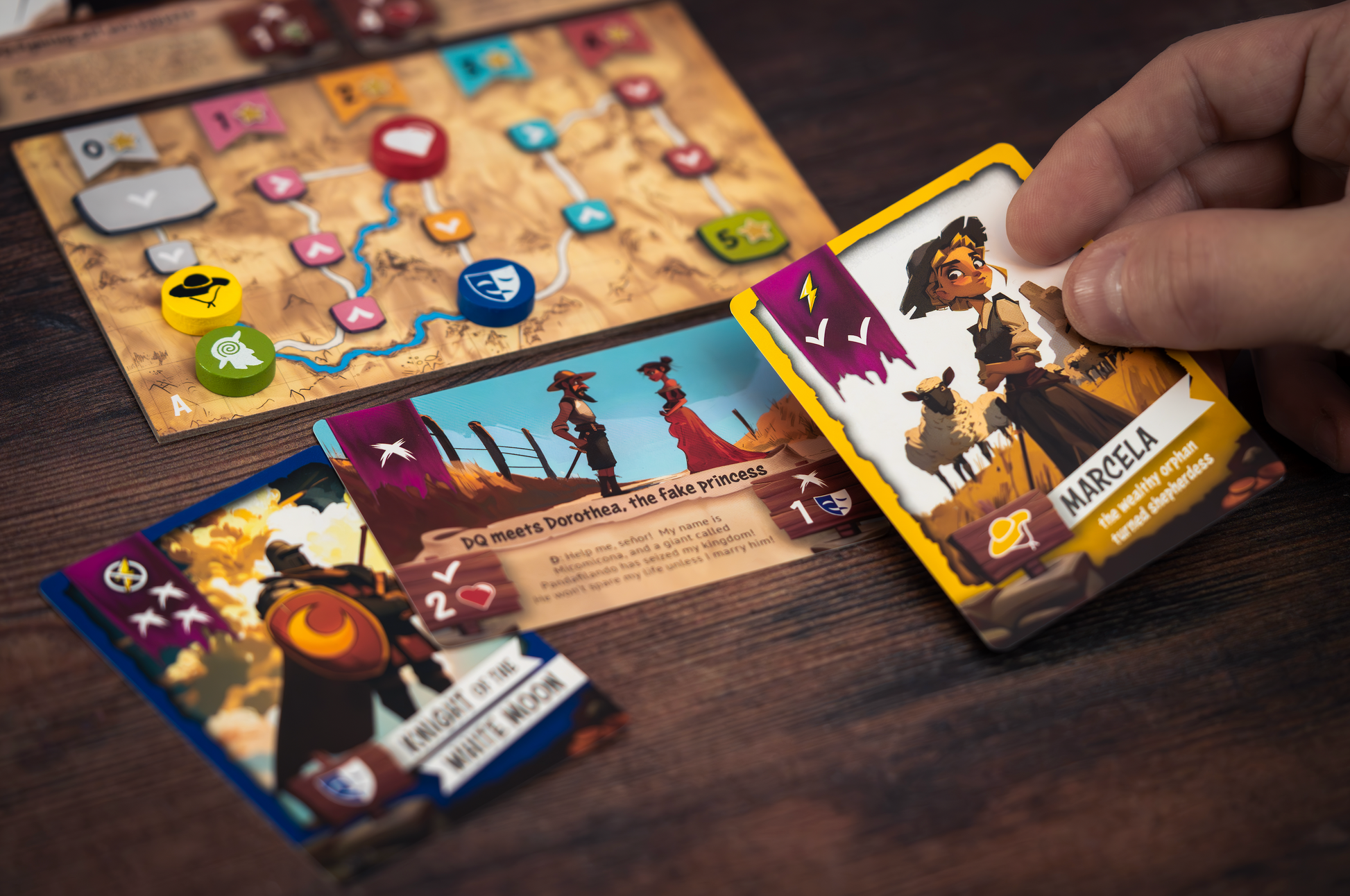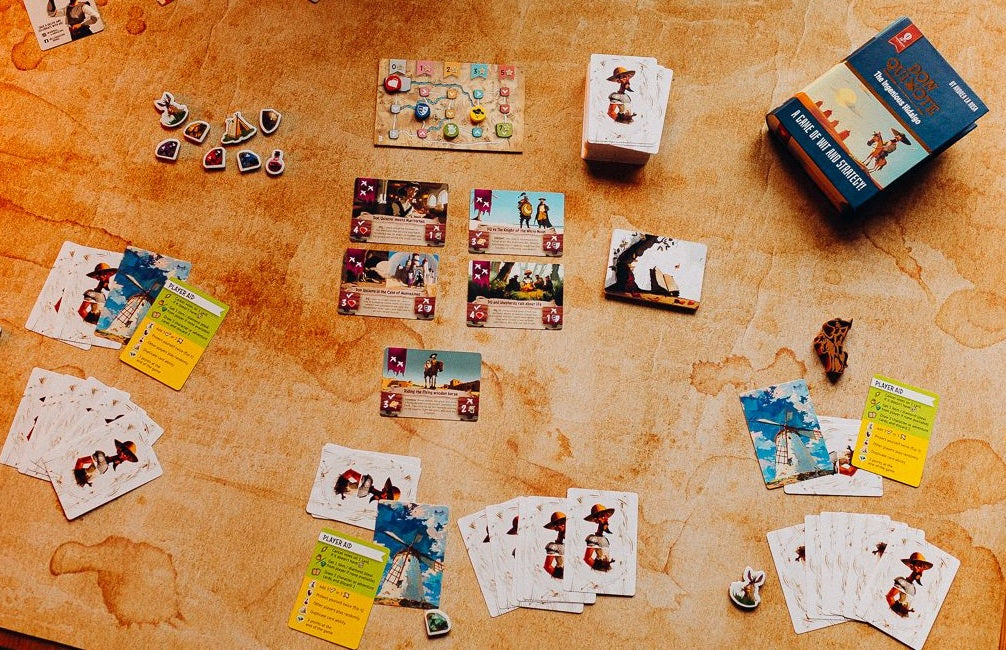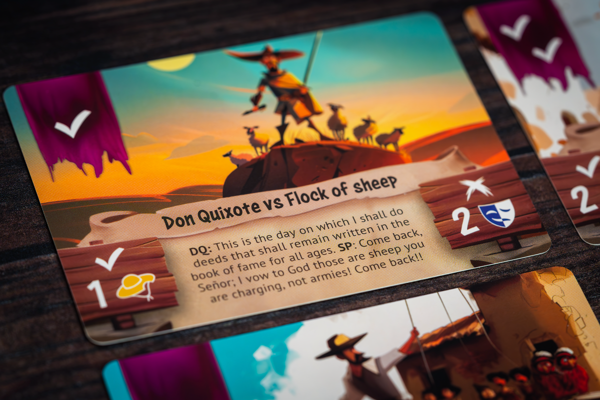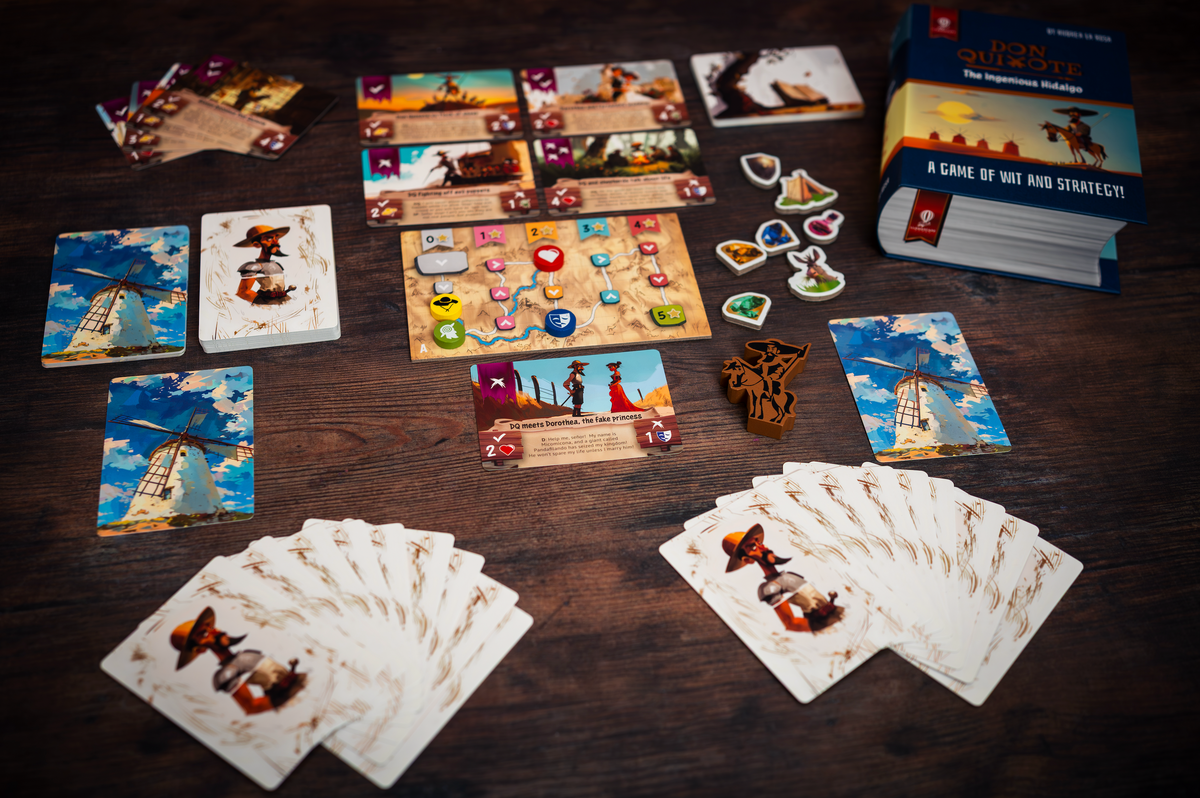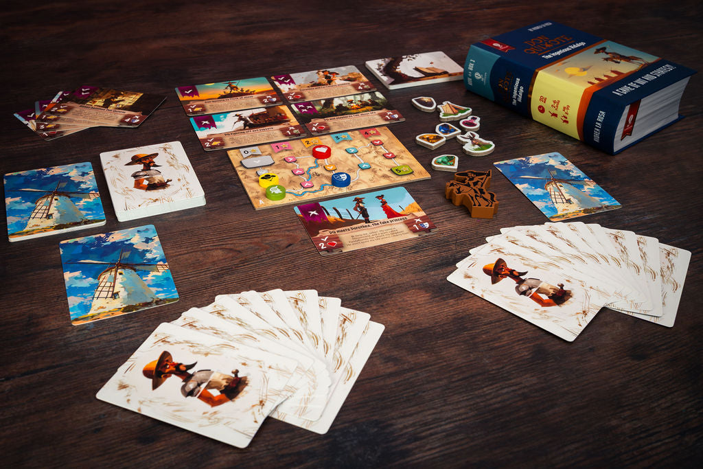 Each round, the ingenious Don Quixote will head for a new adventure, and players vote simultaneously on whether to help him or not. Success in an adventure means Don Quixote progresses on his quest towards glory or love, while failure increases his delusion.