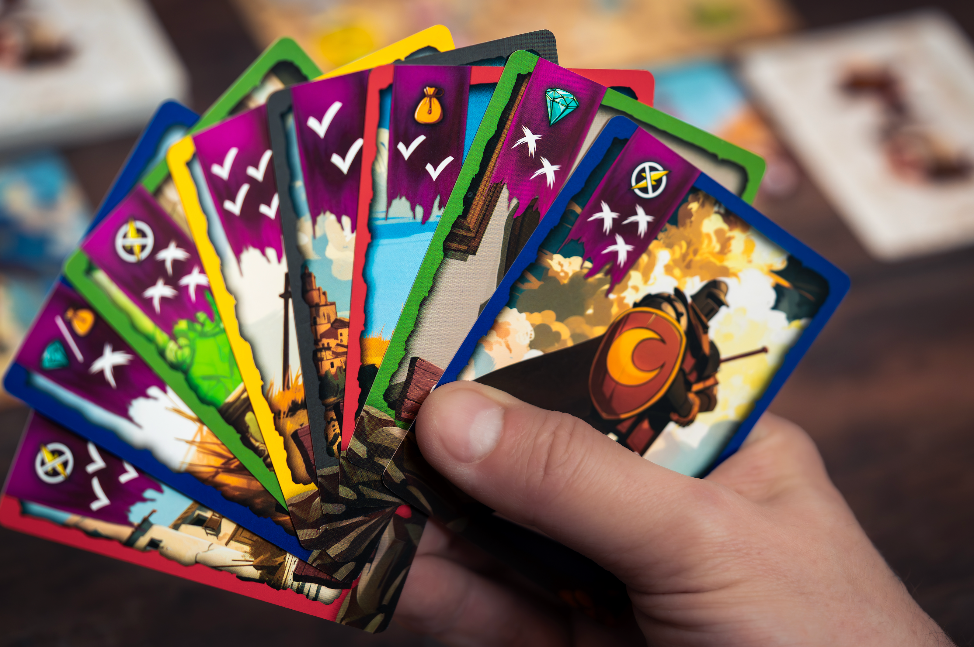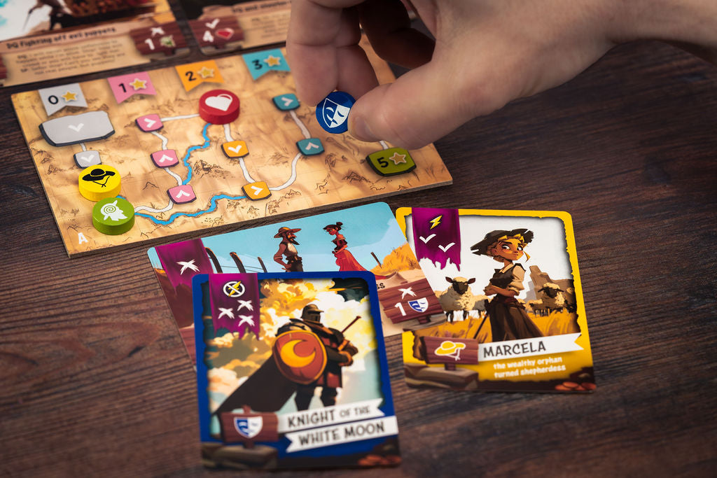 The twist: the more the knight progresses in one track, the more valuable your contributions to that track are, in a set collection mechanics where sets change value dynamically. Can you outwit the other players, anticipating what their next move will be, while not giving away your focus?