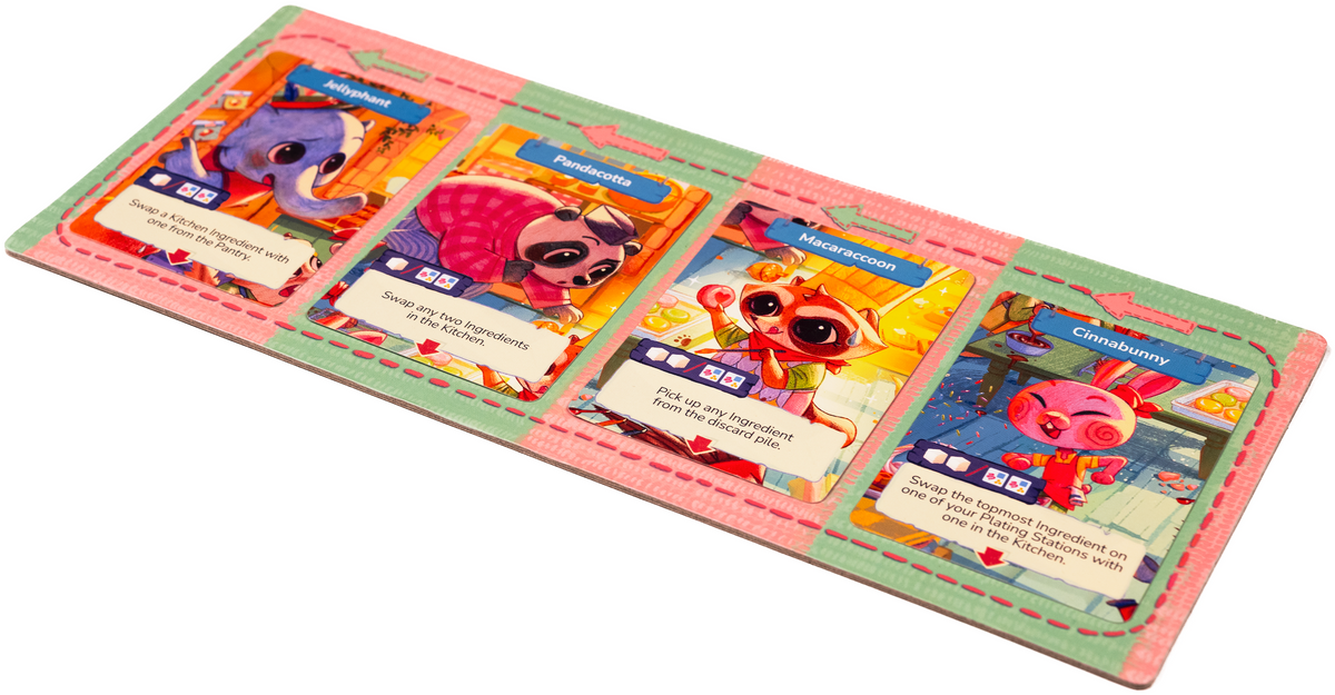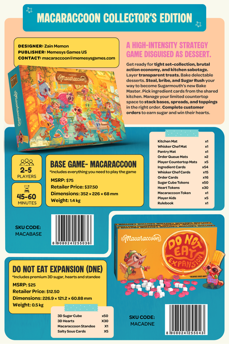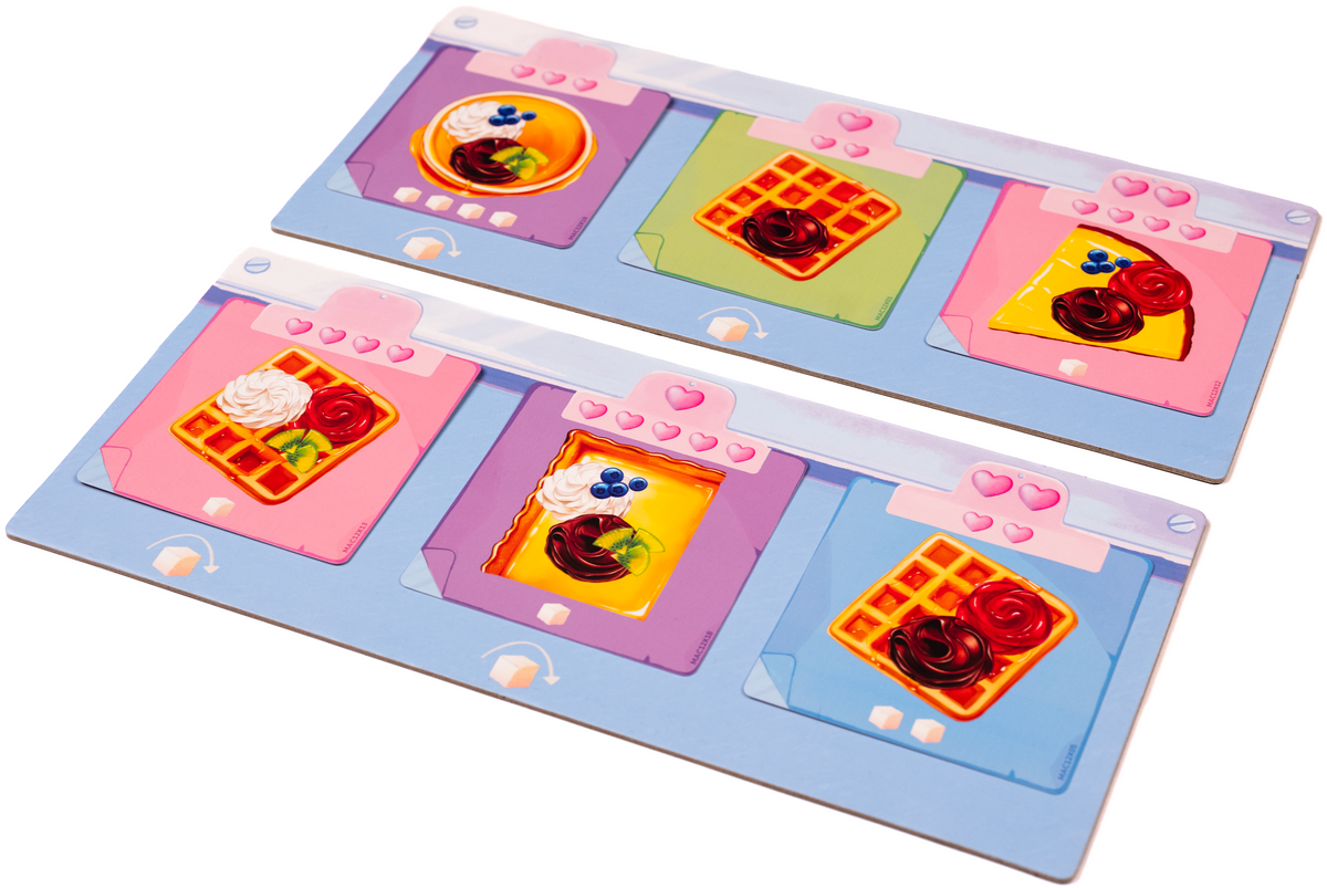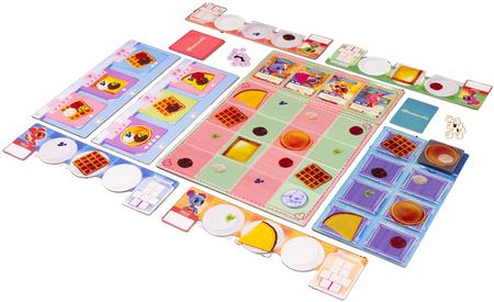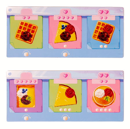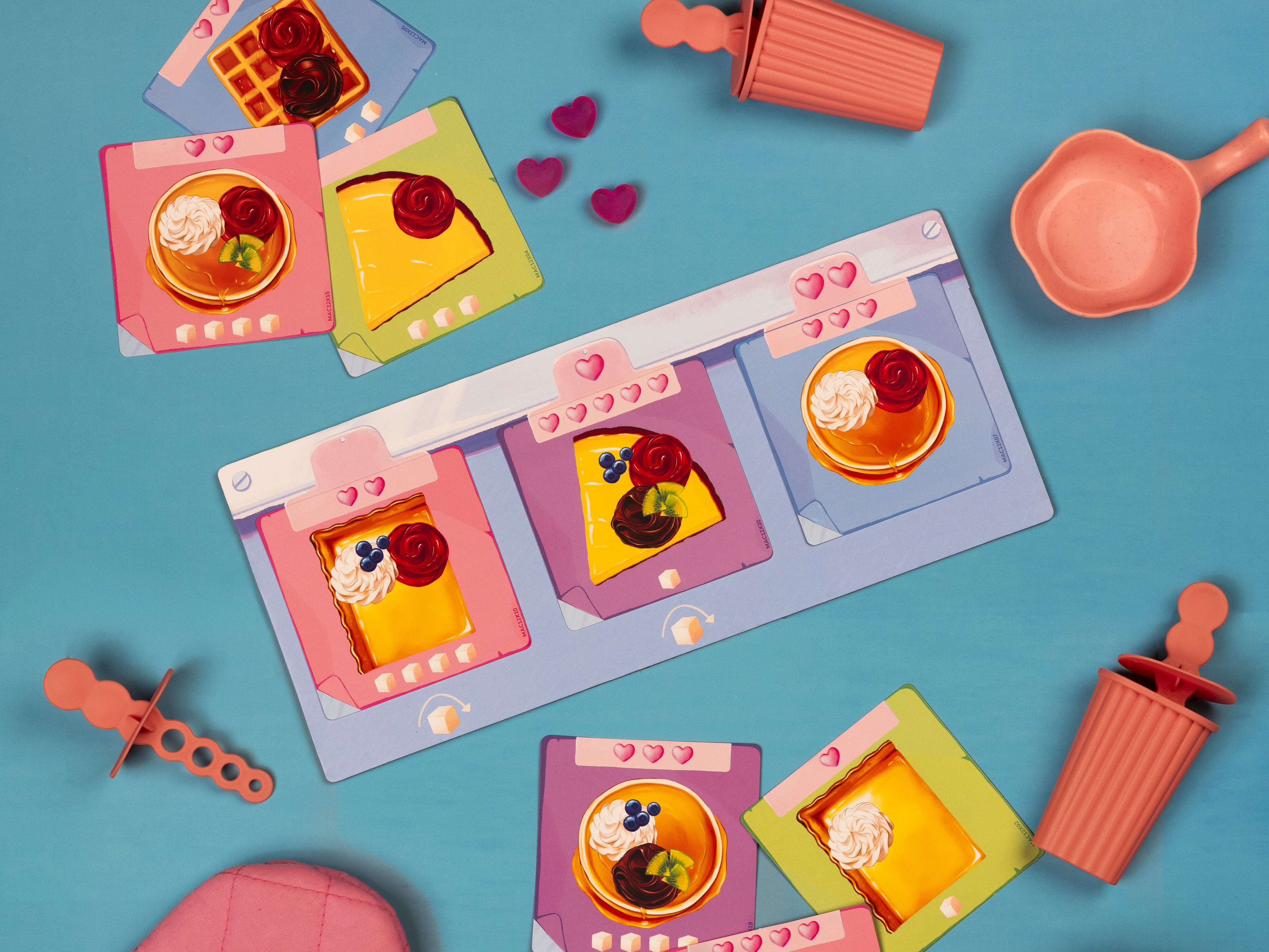 Get ready for tight set-collection, brutal action economy, and kitchen sabotage. Layer transparent treats. Bake delectable desserts. Steal, bribe, and Sugar Rush your way to become Sugarmouth’s new Bake Master. Pick ingredient cards from the shared kitchen. Manage your limited countertop space to stack bases, spreads, and toppings in the right order. Complete customer orders to earn sugar and win their hearts.
