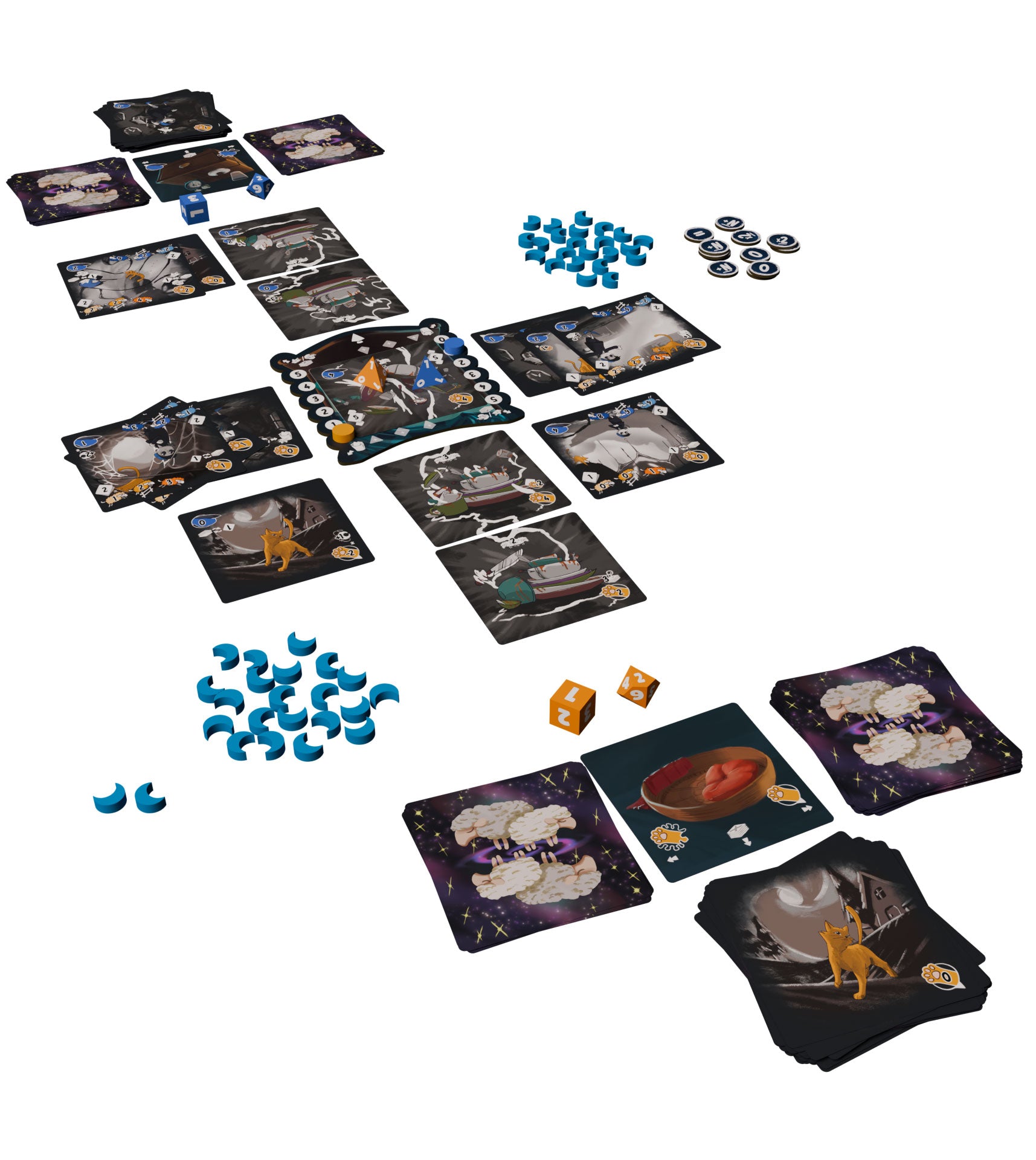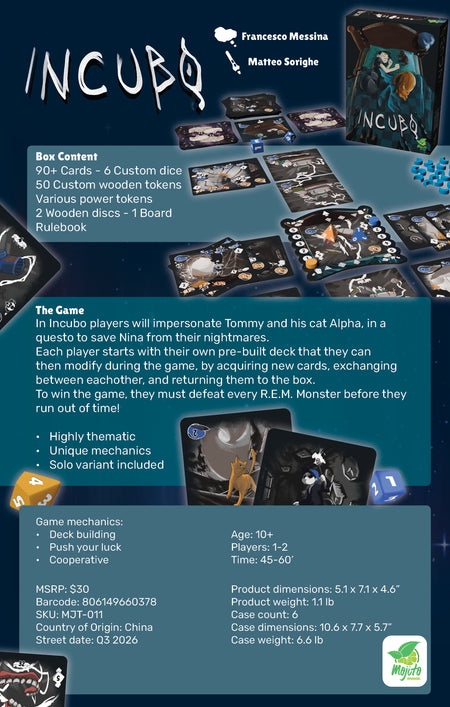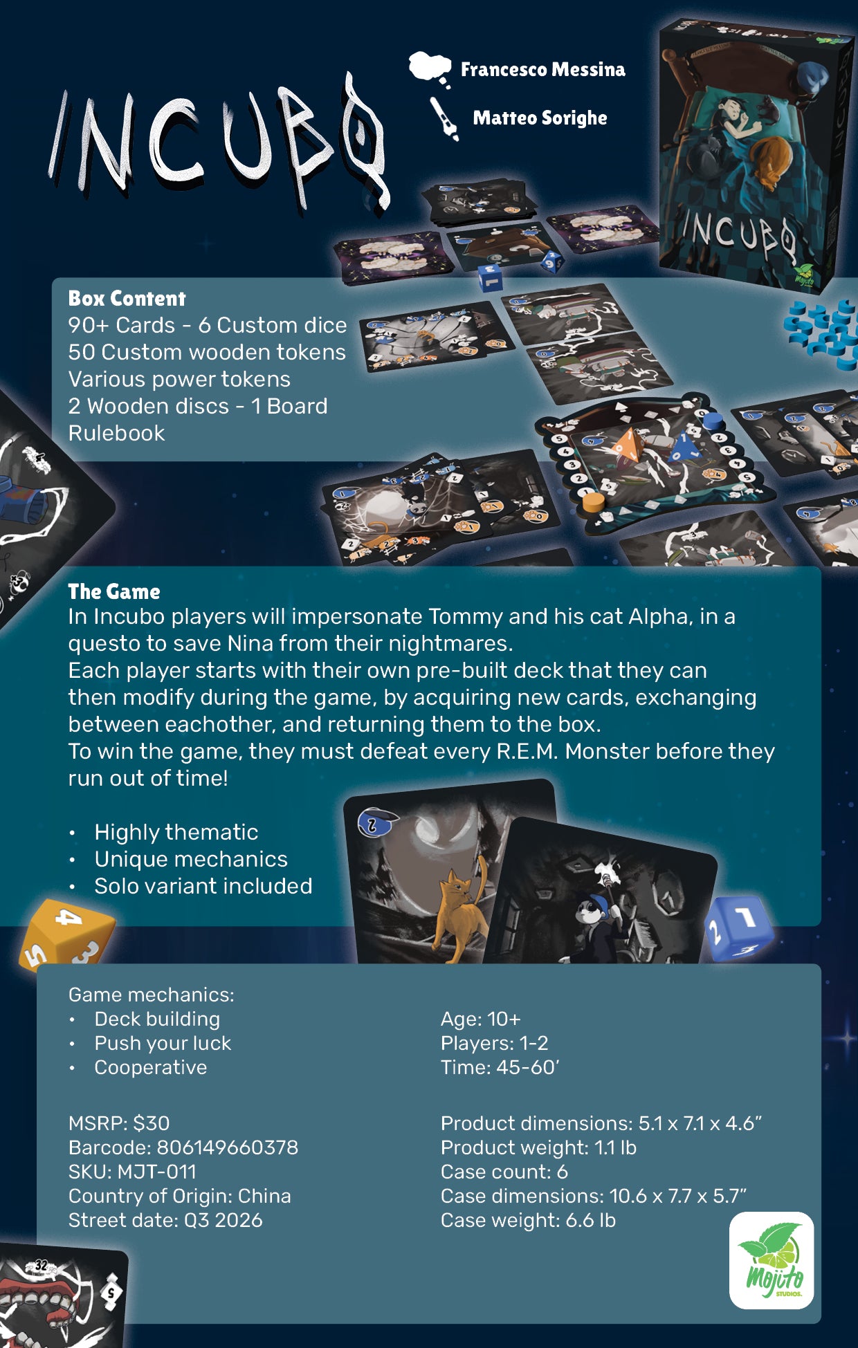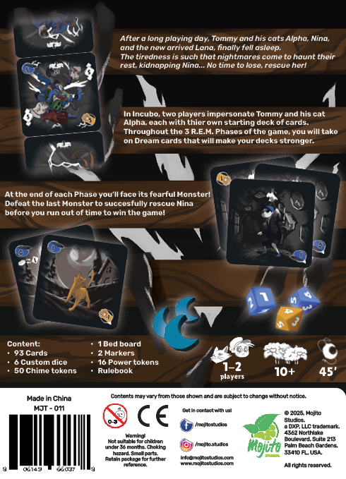 Incubo is a cooperative deck-building game designed for 2 players, where they take on the roles of a child Tommy and his best friend cat, Alpha, as they confront their fears to rescue their sister, Nina. Together, they must build their decks by passing cards between each other, eliminating weaker or negative cards, and facing various adventures within the dream world.