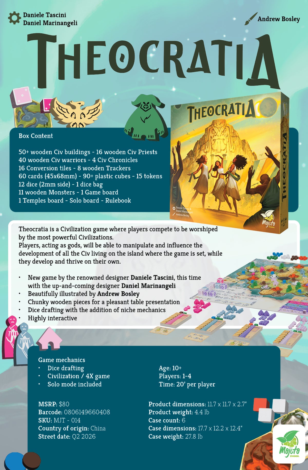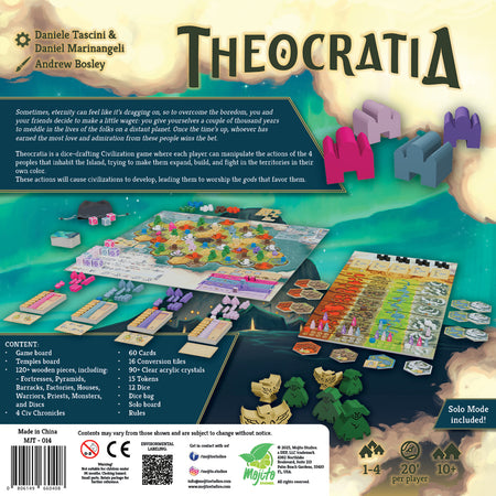 Theocratia is set on an imaginary island where four civilizations thrive, develop, explore the land, build new structures, and ultimately forge their own fate. Players take on the roles of highly advanced aliens who manipulate the lives of these civilizations in a wager to determine which alien deity will earn the most worship.