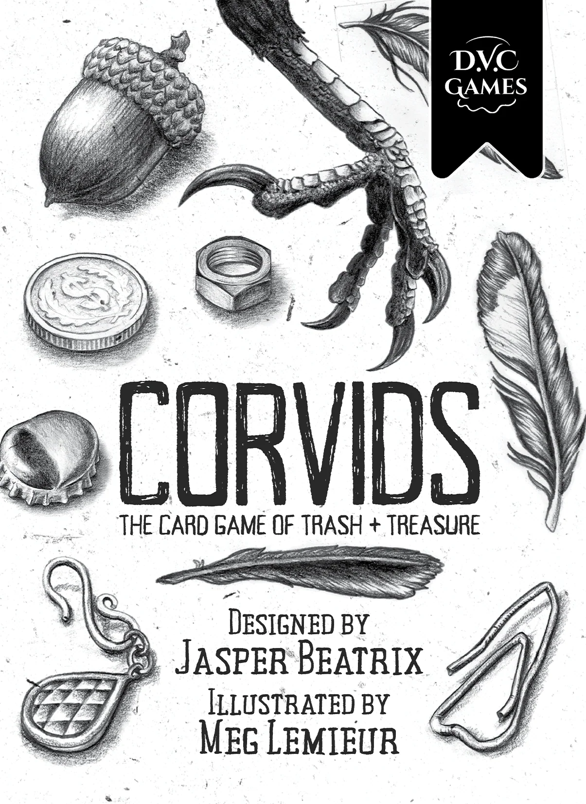 The game includes 40 trash cards, 2 sets of tweezers, feather tokens, and a set of secret-goal bird cards that feature detailed iillustrations. The game is played on a cloth mat, and comes in a stylish folding-lid box. Corvids is intended for beginner and intermediate board game players of all ages, and crow-fans at heart.