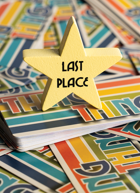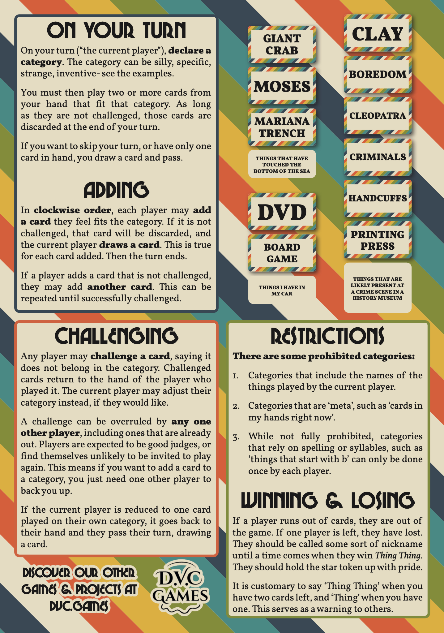 Thing Thing is a silly card game that we play a lot of at the office. We have cards upon cards of 'things'- places, people, objects, concepts- and we have find ways to relate them, usually with strange results. Playing two or more cards lets you get rid of them, but the category you used to relate them (leaders in their field, hard to get to, stuff I have touched recently, reasons the party didn't go well) may let other players discard cards as well, forcing you to draw new cards to compensate. It is overall a ridiculous activity, one in which each player races to either ditch cards on the turns of other players, or cleverly craft a category that is specific enough to ditch their own cards, but not include anyone else's. In the end, only one player will be left standing, as it is not a game about being a winner. All that matters is you are not Last Place.