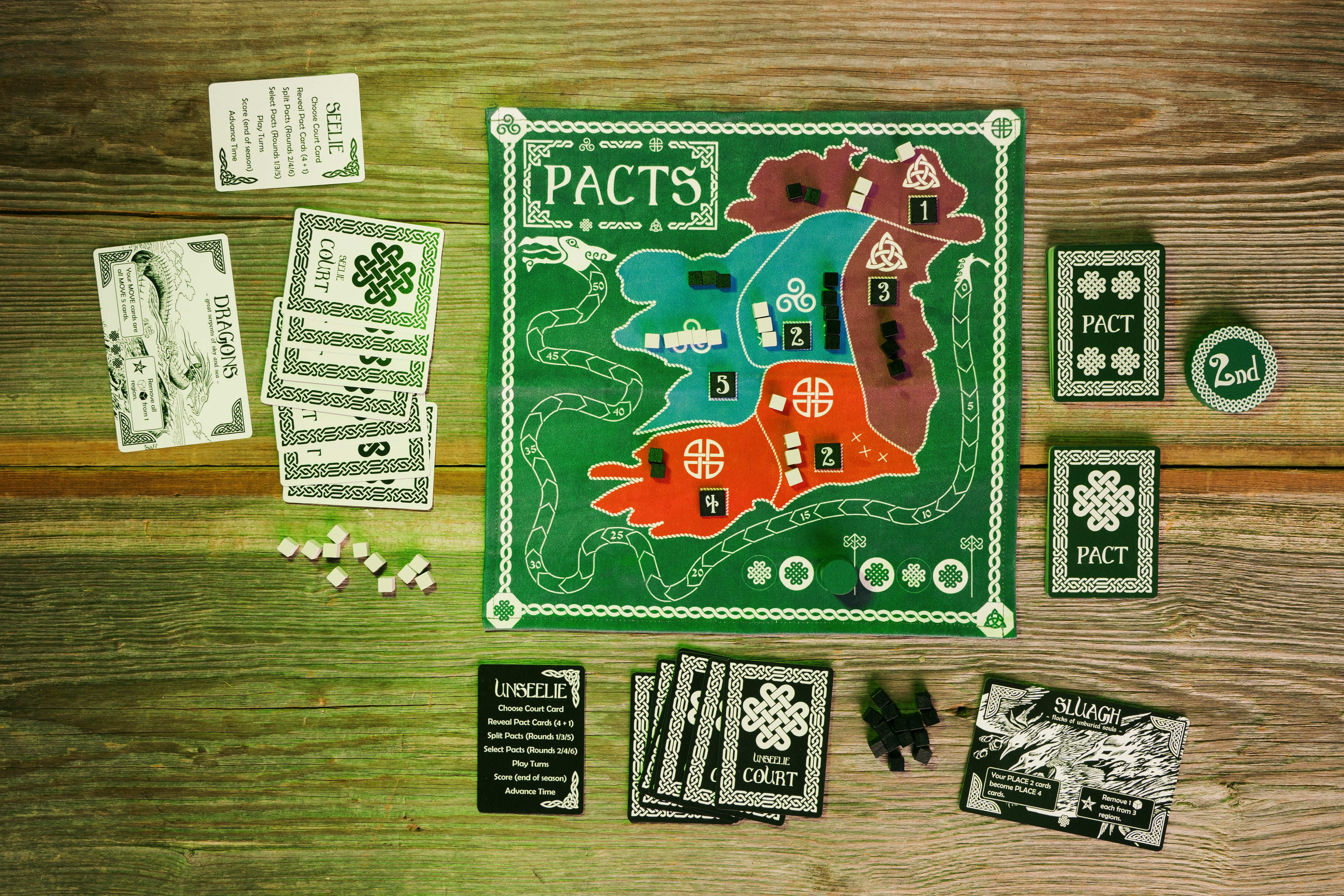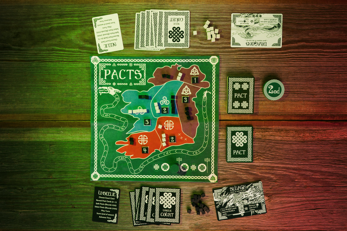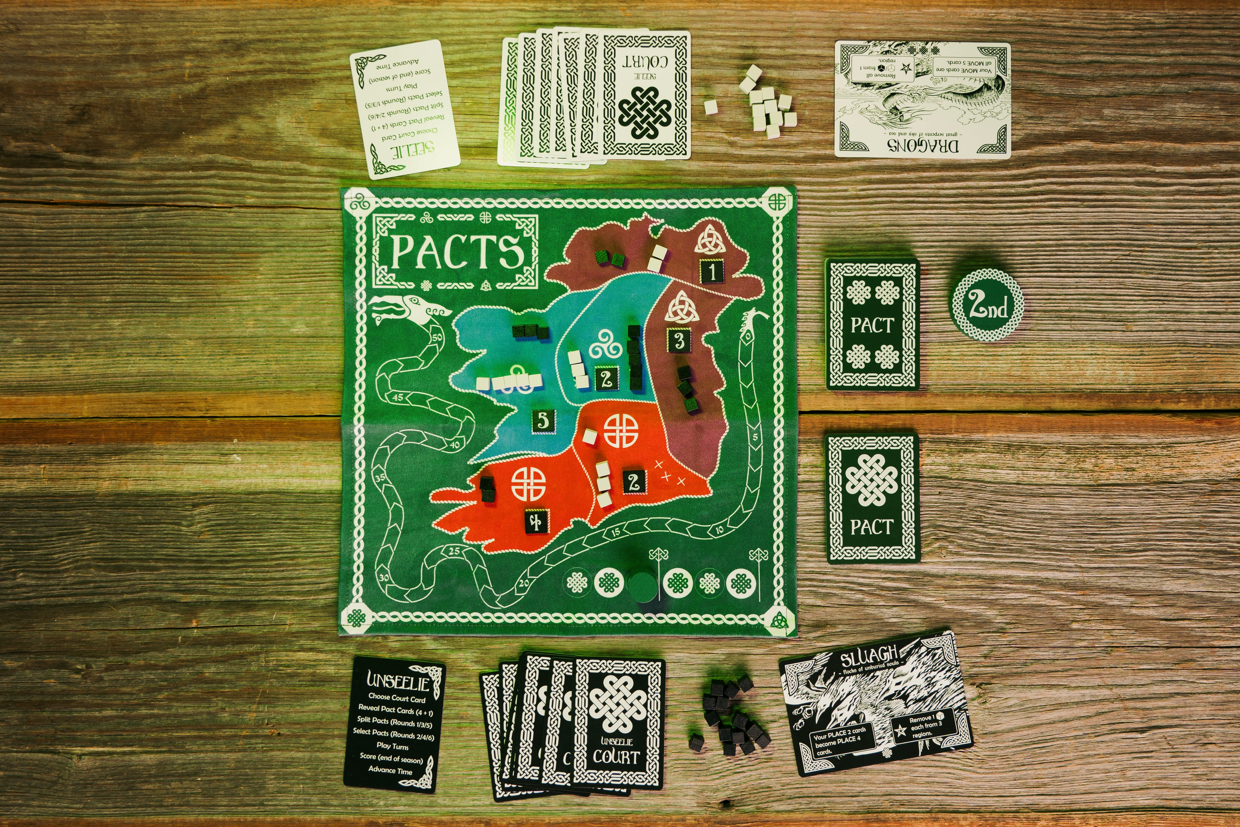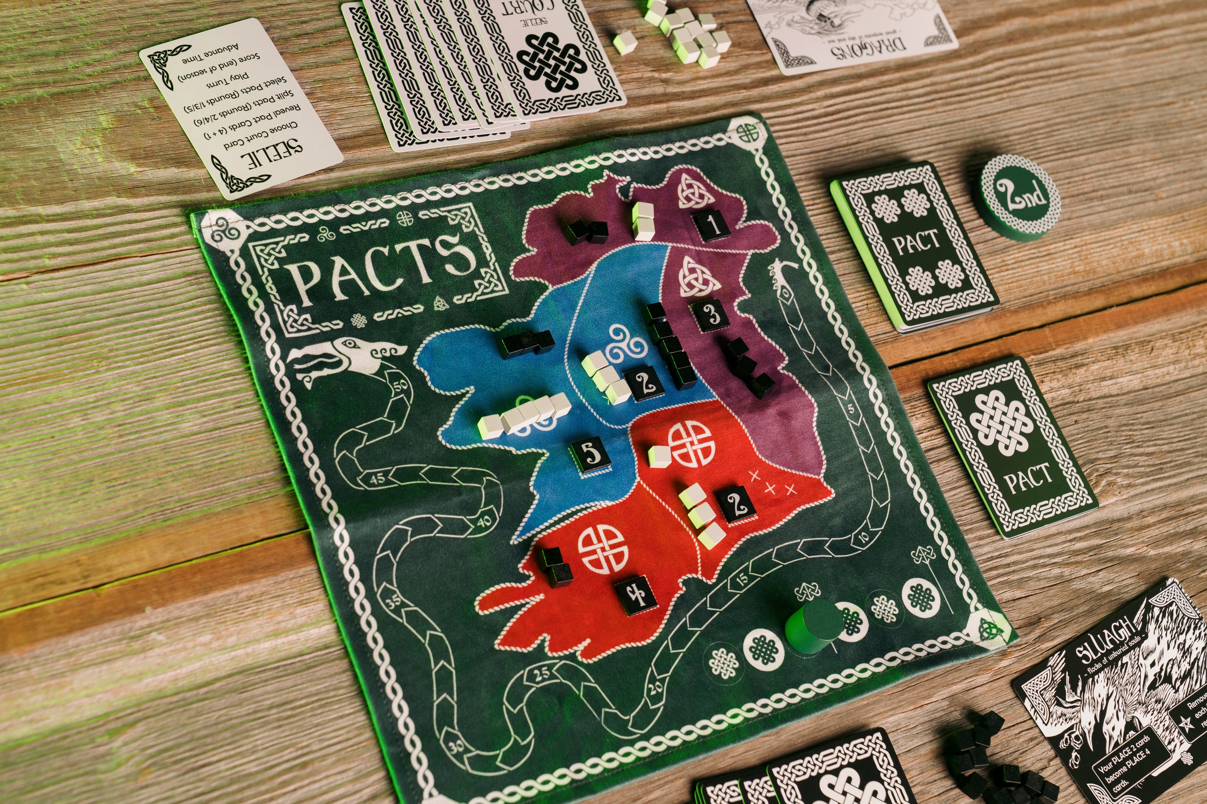 In Pacts, you shall rule one of these two courts, facing your eternal opponent in a duel of wits. Before starting, each of you will gain the assistance of mythological creatures such as dragons, banshees, and selkies to give you the edge. Each round, cards are dealt, where one player will split the possible actions between two piles, while the other will select who gets which set. You will each place, move, and remove influence across six regions and see who rules these sacred places, seeking majority control. The player who scores the best after three and six rounds will be declared the new ruler of this great isle.