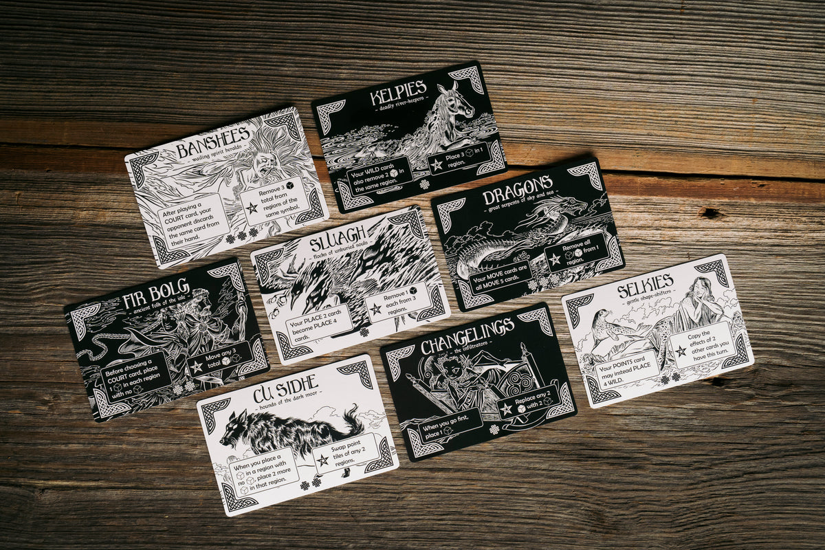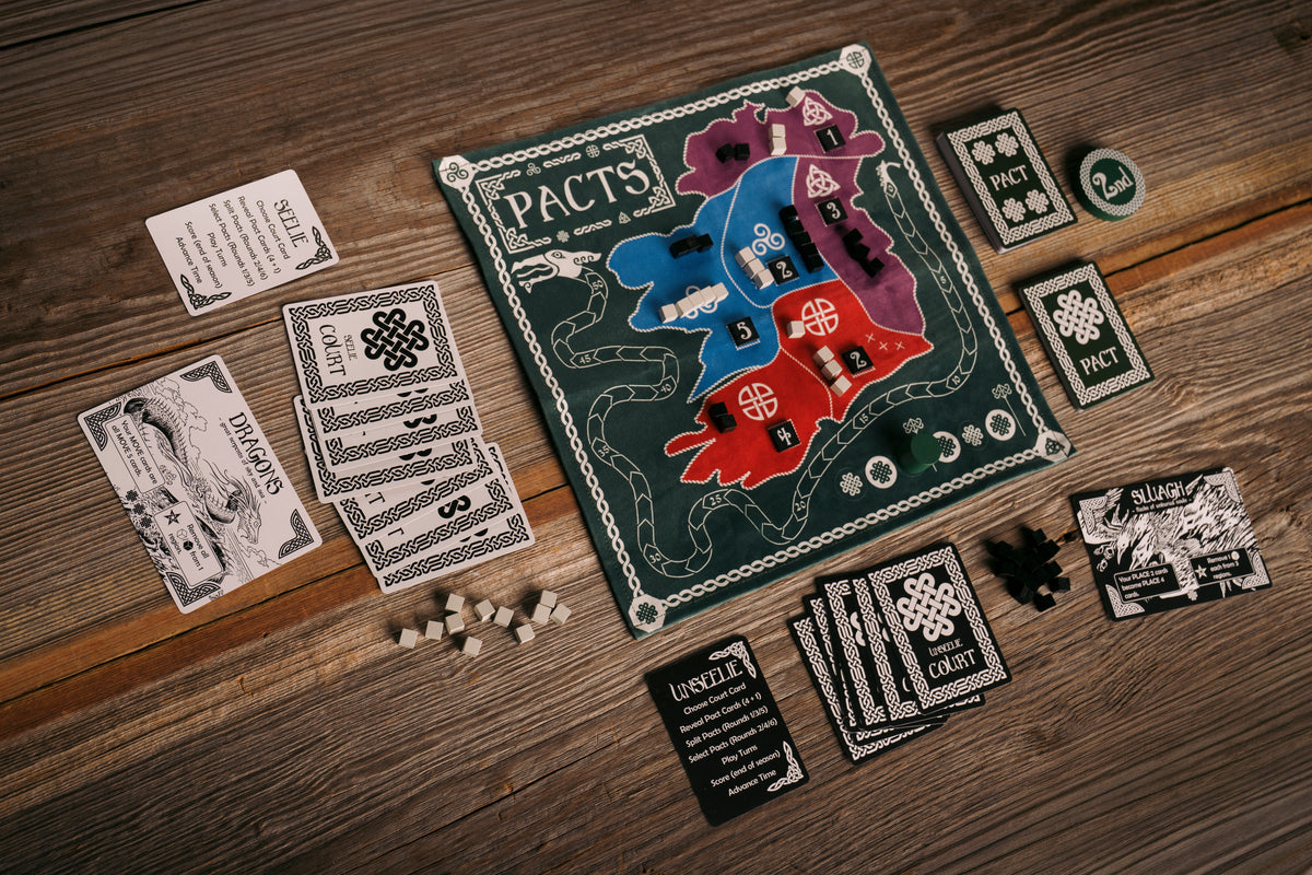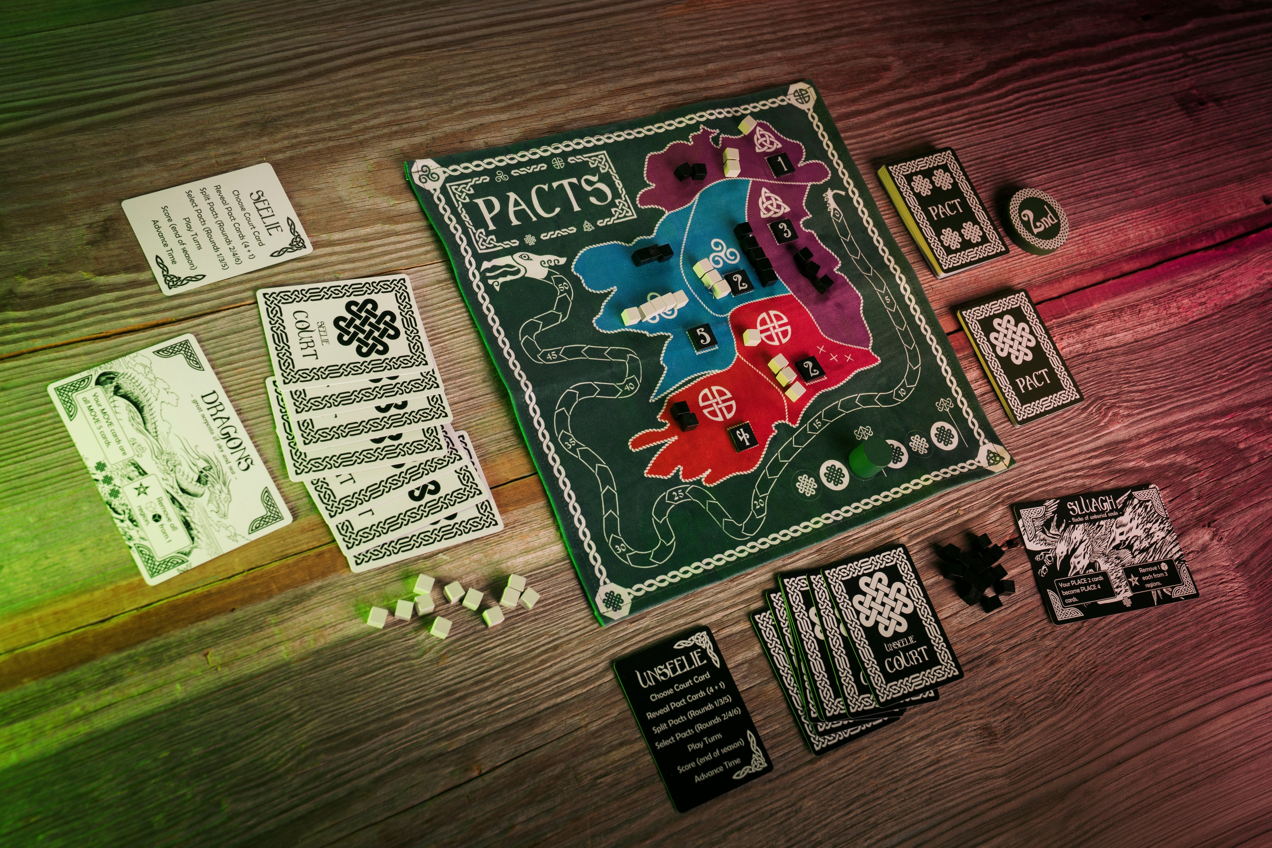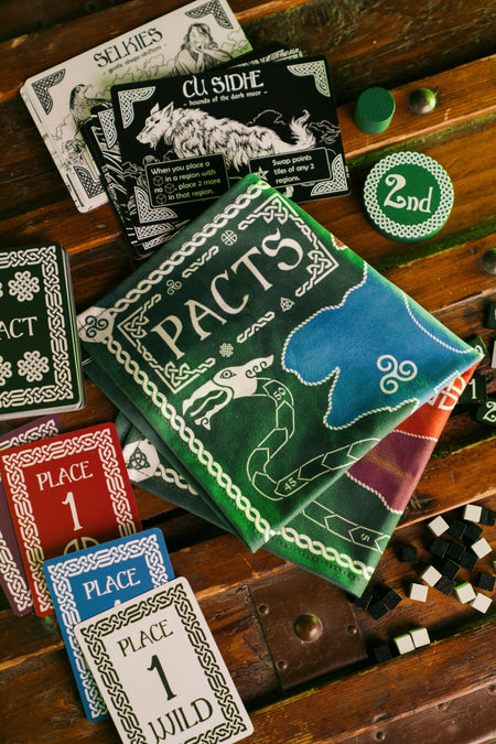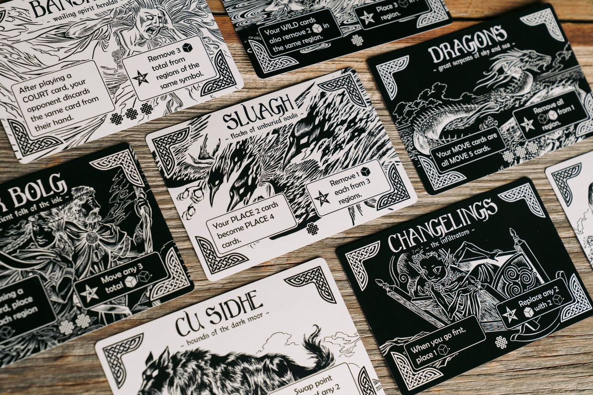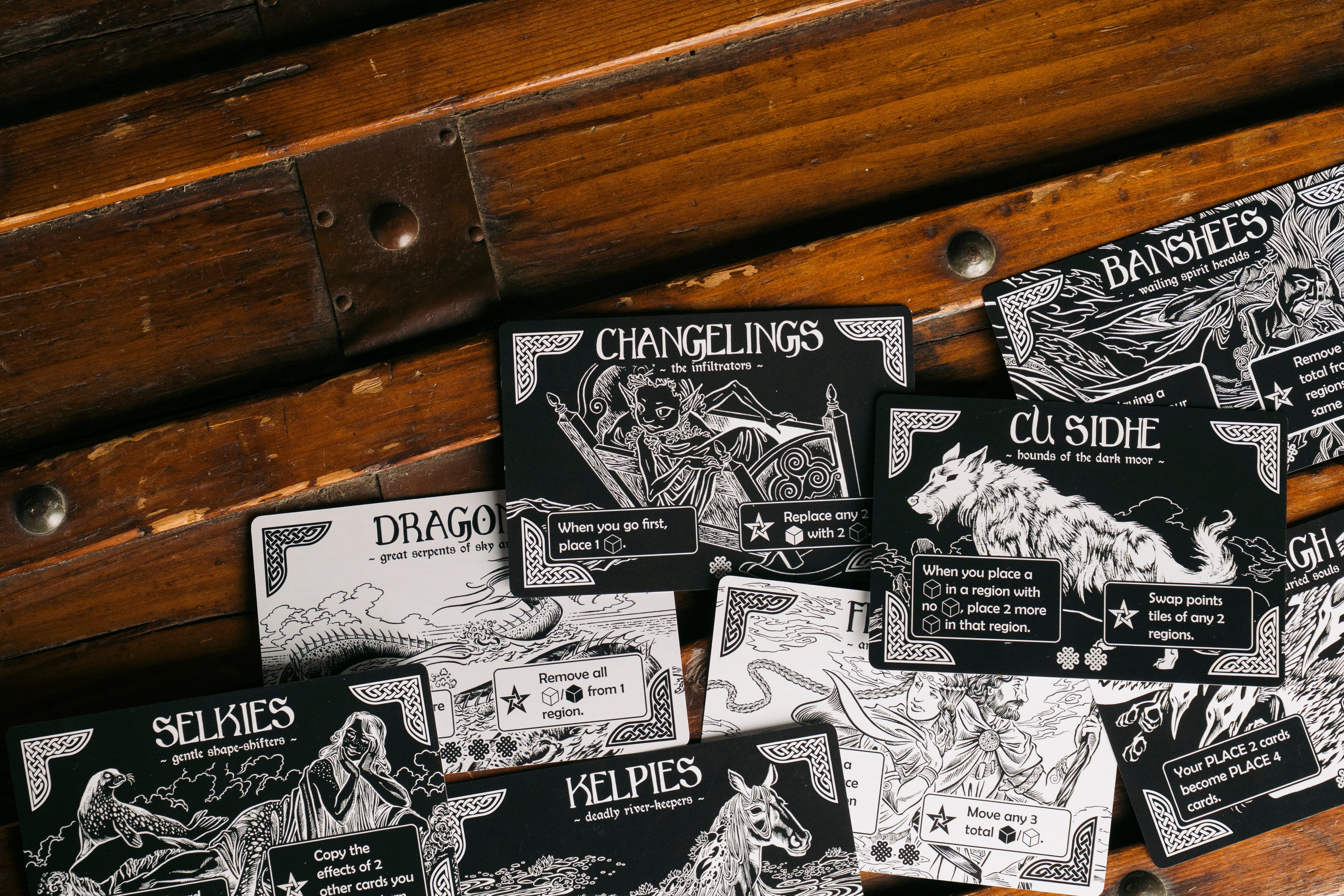 In Pacts, you shall rule one of these two courts, facing your eternal opponent in a duel of wits. Before starting, each of you will gain the assistance of mythological creatures such as dragons, banshees, and selkies to give you the edge. Each round, cards are dealt, where one player will split the possible actions between two piles, while the other will select who gets which set. You will each place, move, and remove influence across six regions and see who rules these sacred places, seeking majority control. The player who scores the best after three and six rounds will be declared the new ruler of this great isle.