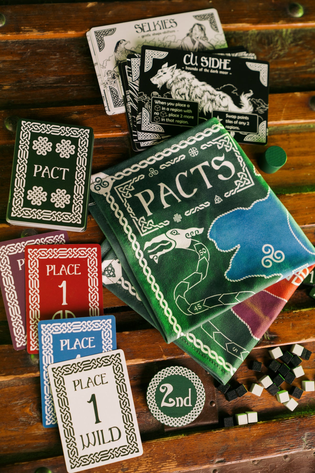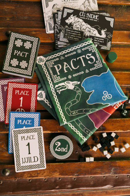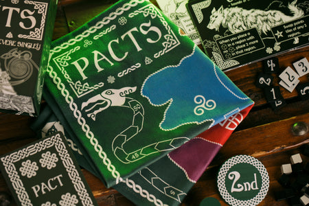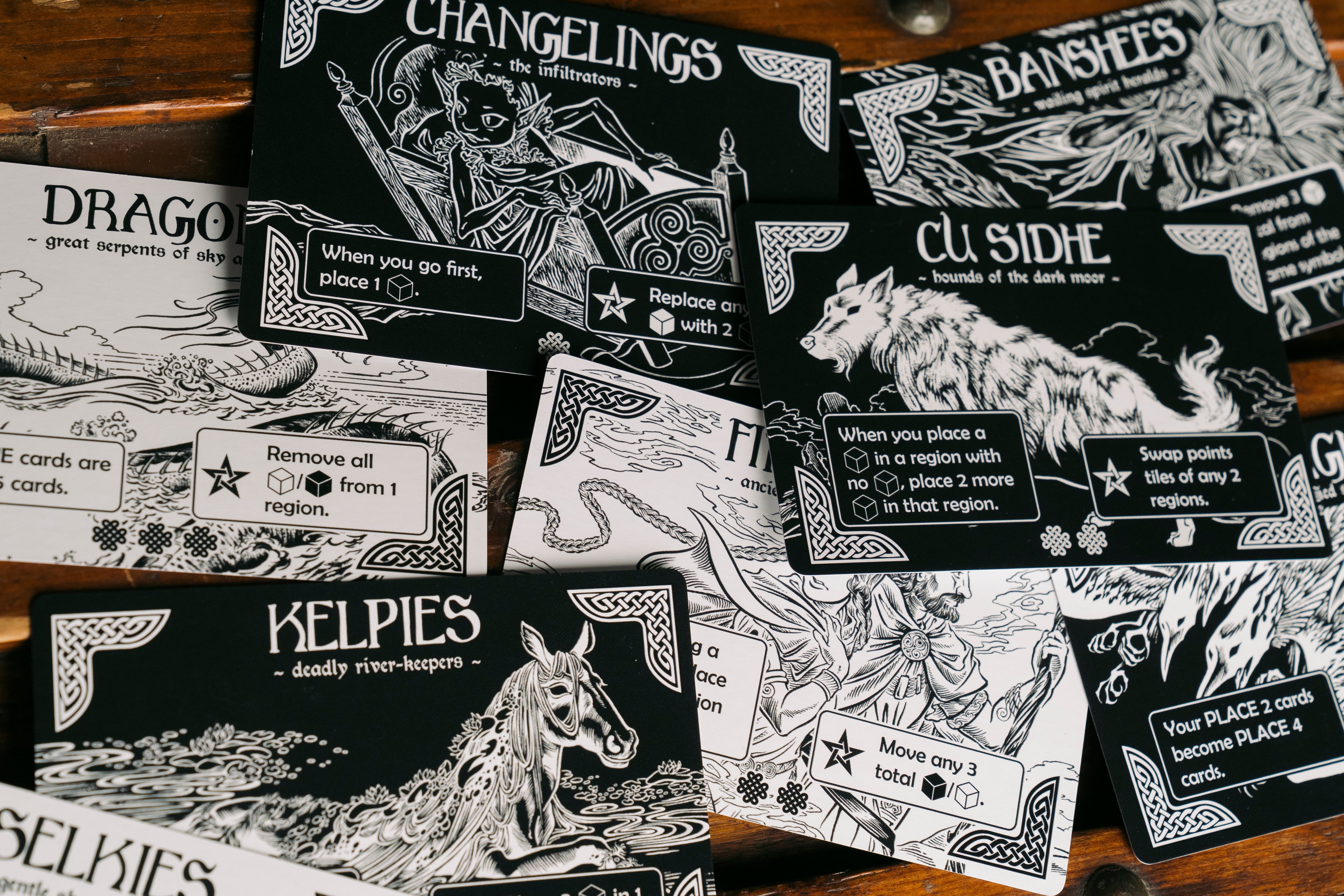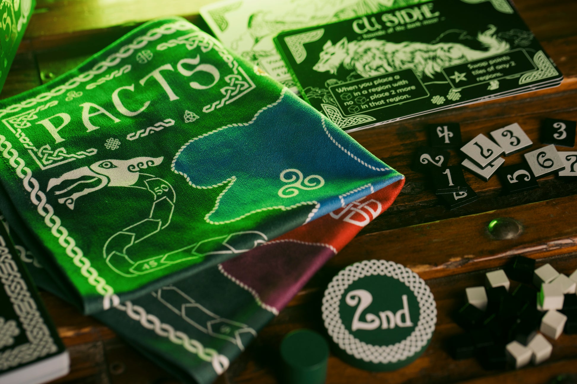 In Pacts, you shall rule one of these two courts, facing your eternal opponent in a duel of wits. Before starting, each of you will gain the assistance of mythological creatures such as dragons, banshees, and selkies to give you the edge. Each round, cards are dealt, where one player will split the possible actions between two piles, while the other will select who gets which set. You will each place, move, and remove influence across six regions and see who rules these sacred places, seeking majority control. The player who scores the best after three and six rounds will be declared the new ruler of this great isle.