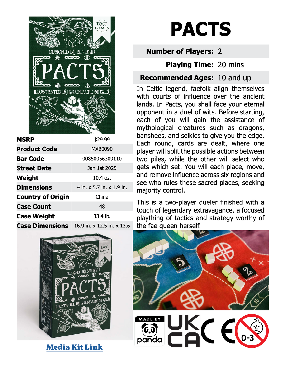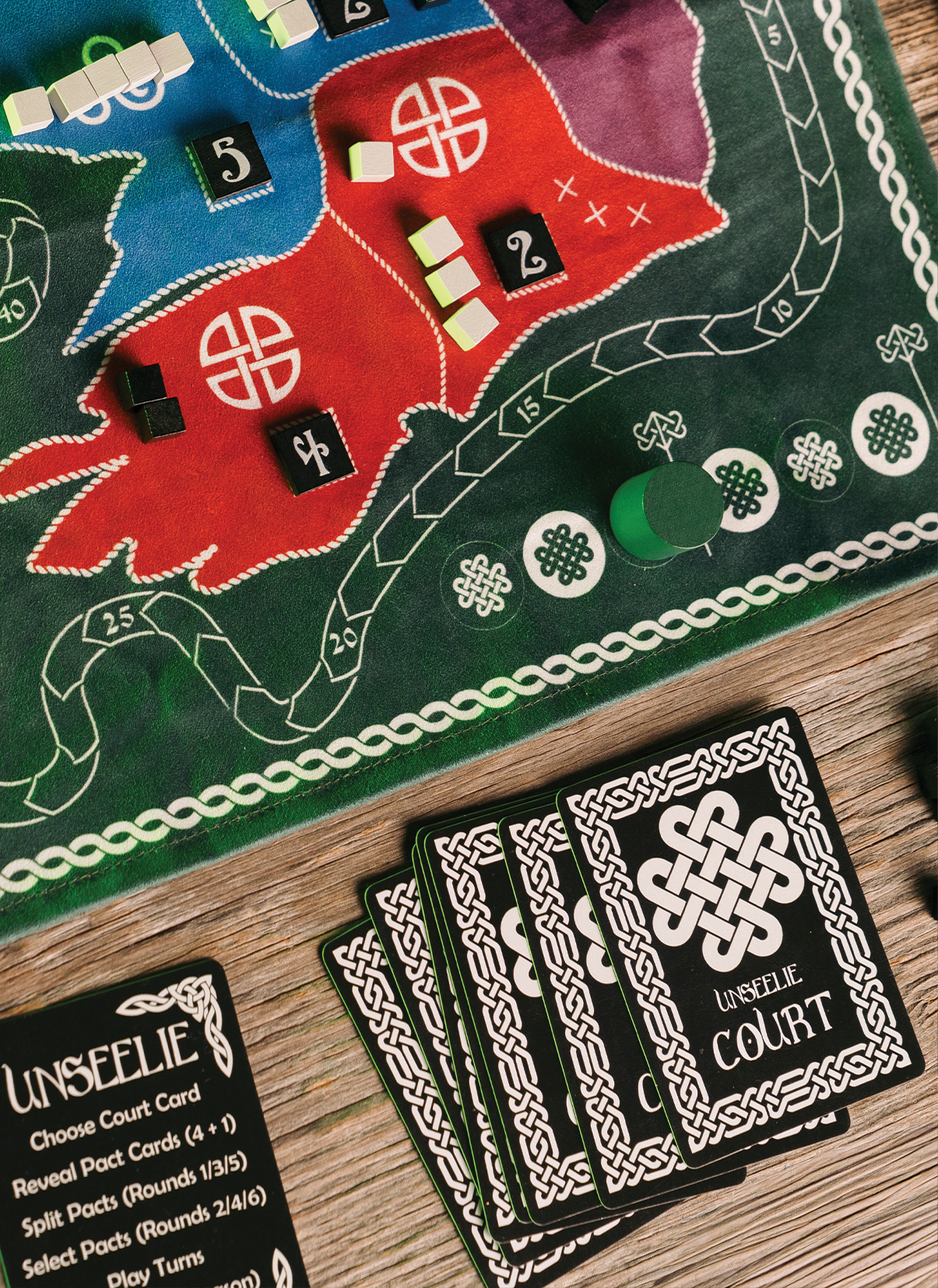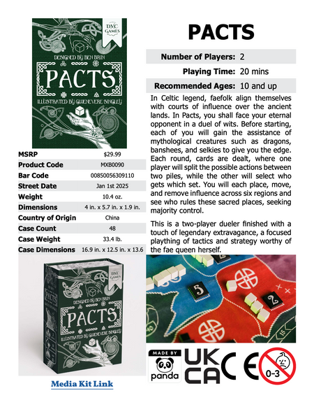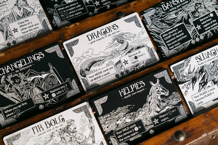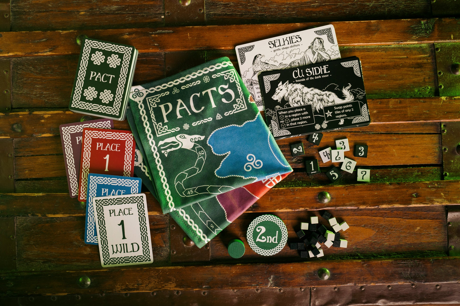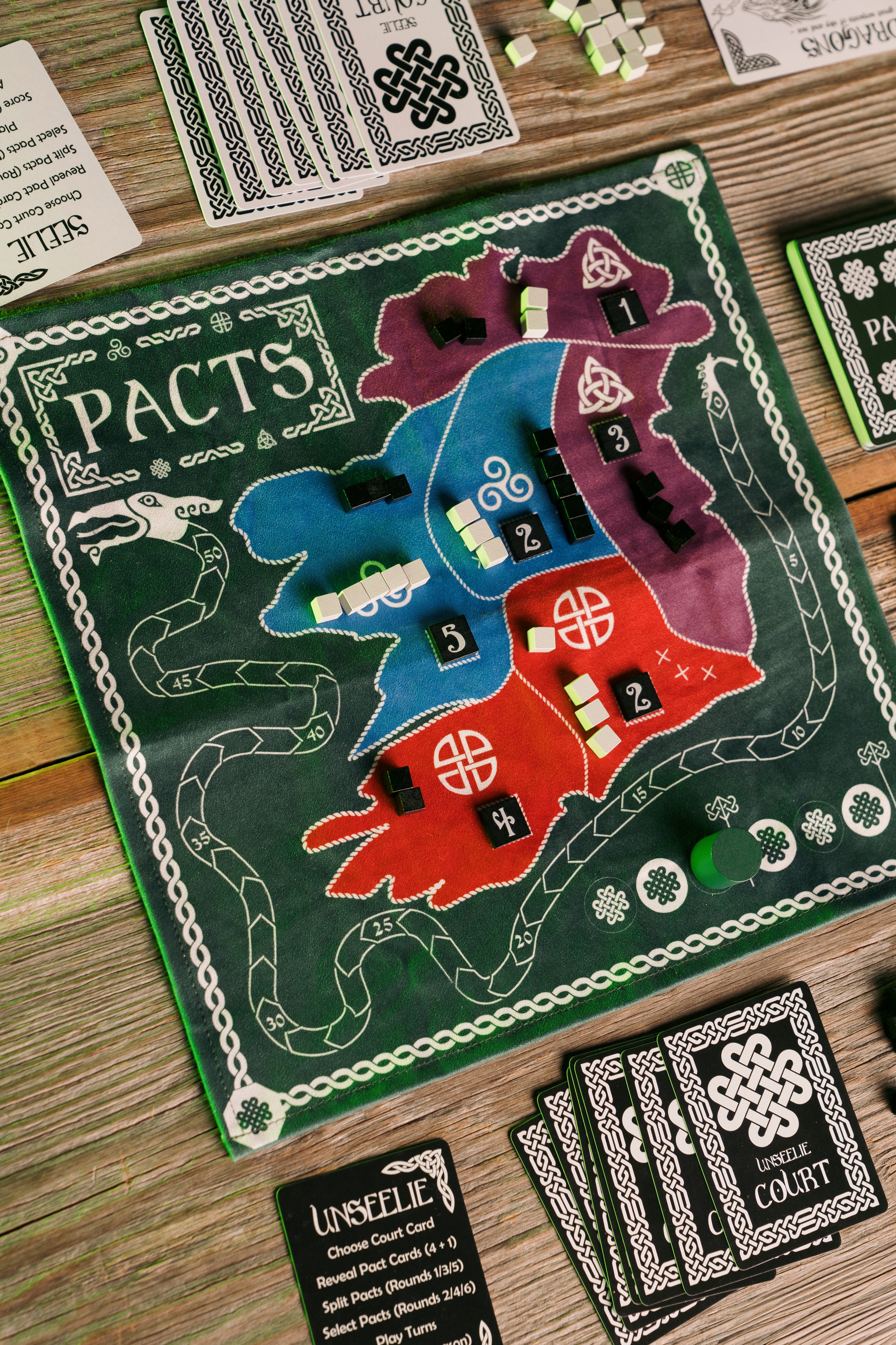 In Pacts, you shall rule one of these two courts, facing your eternal opponent in a duel of wits. Before starting, each of you will gain the assistance of mythological creatures such as dragons, banshees, and selkies to give you the edge. Each round, cards are dealt, where one player will split the possible actions between two piles, while the other will select who gets which set. You will each place, move, and remove influence across six regions and see who rules these sacred places, seeking majority control. The player who scores the best after three and six rounds will be declared the new ruler of this great isle.