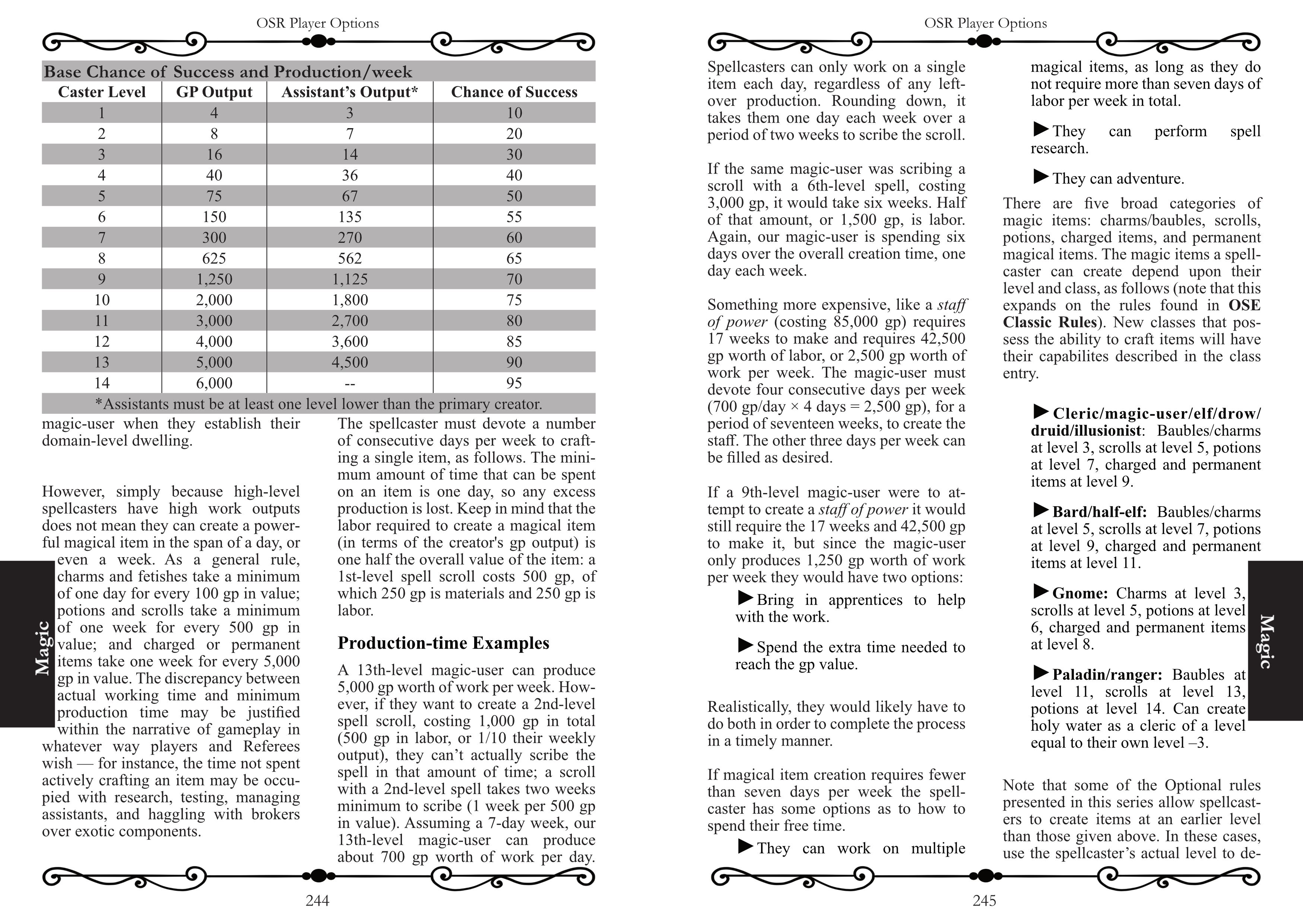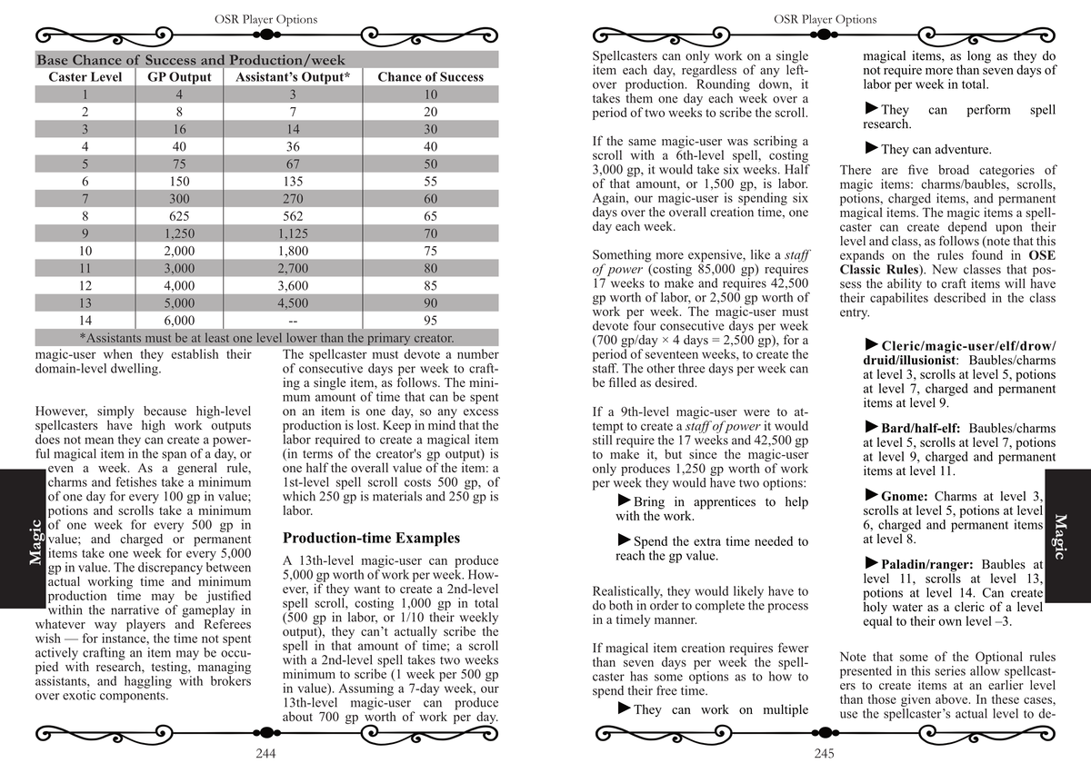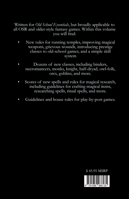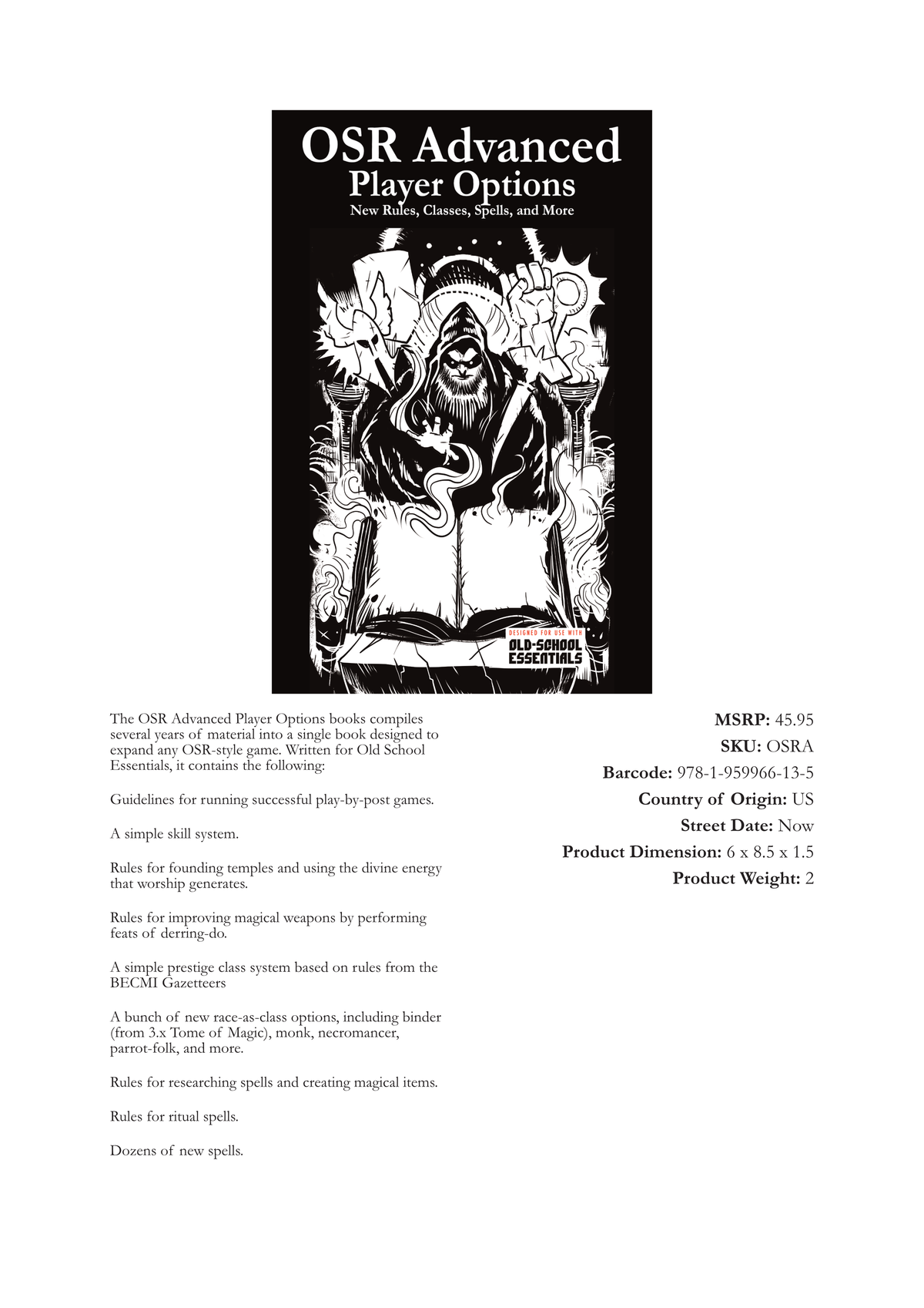 The OSR Advanced Player Options books compiles several years of material into a single book designed to expand any OSR-style game. Written for Old School Essentials, it contains the following: