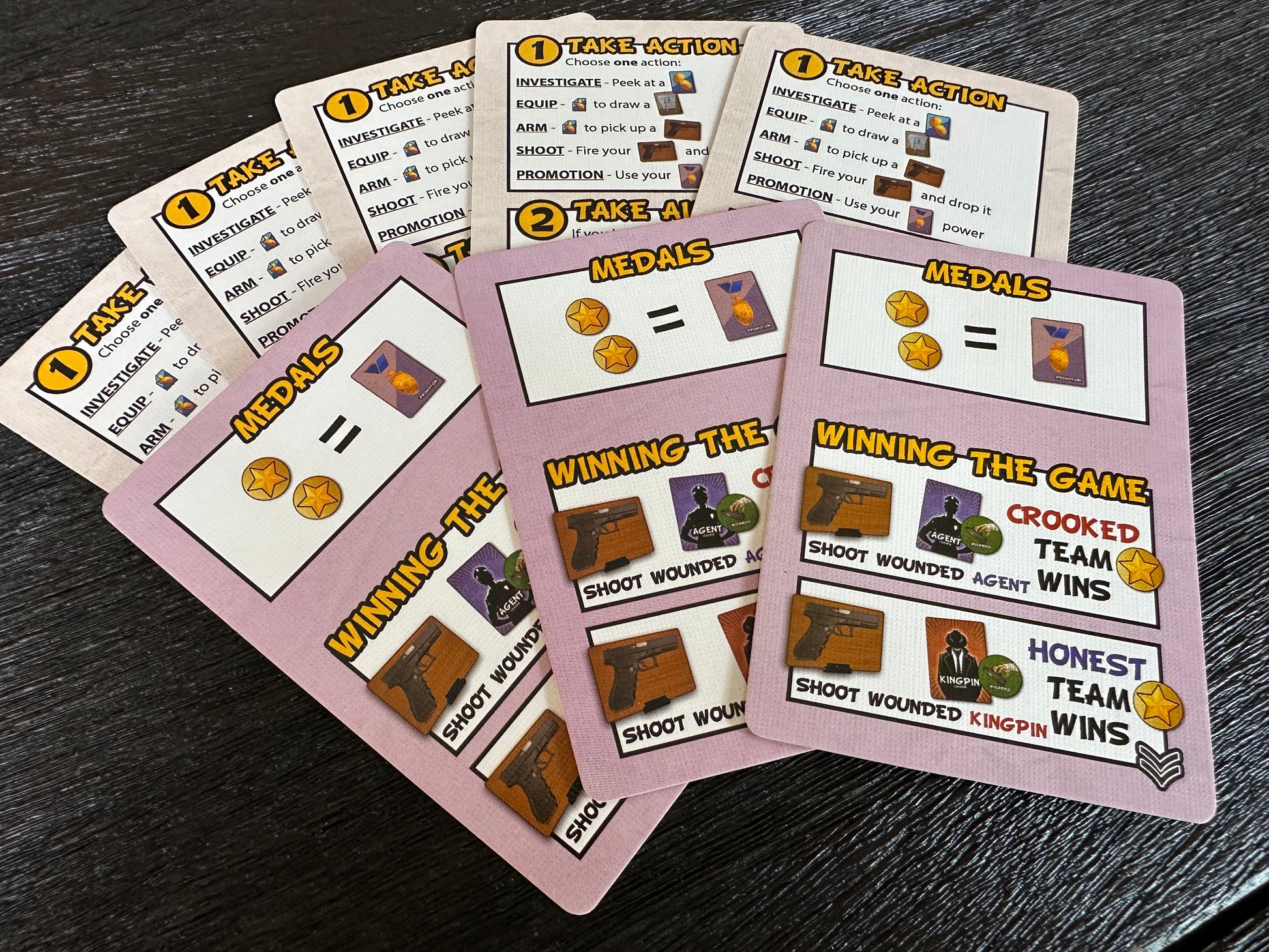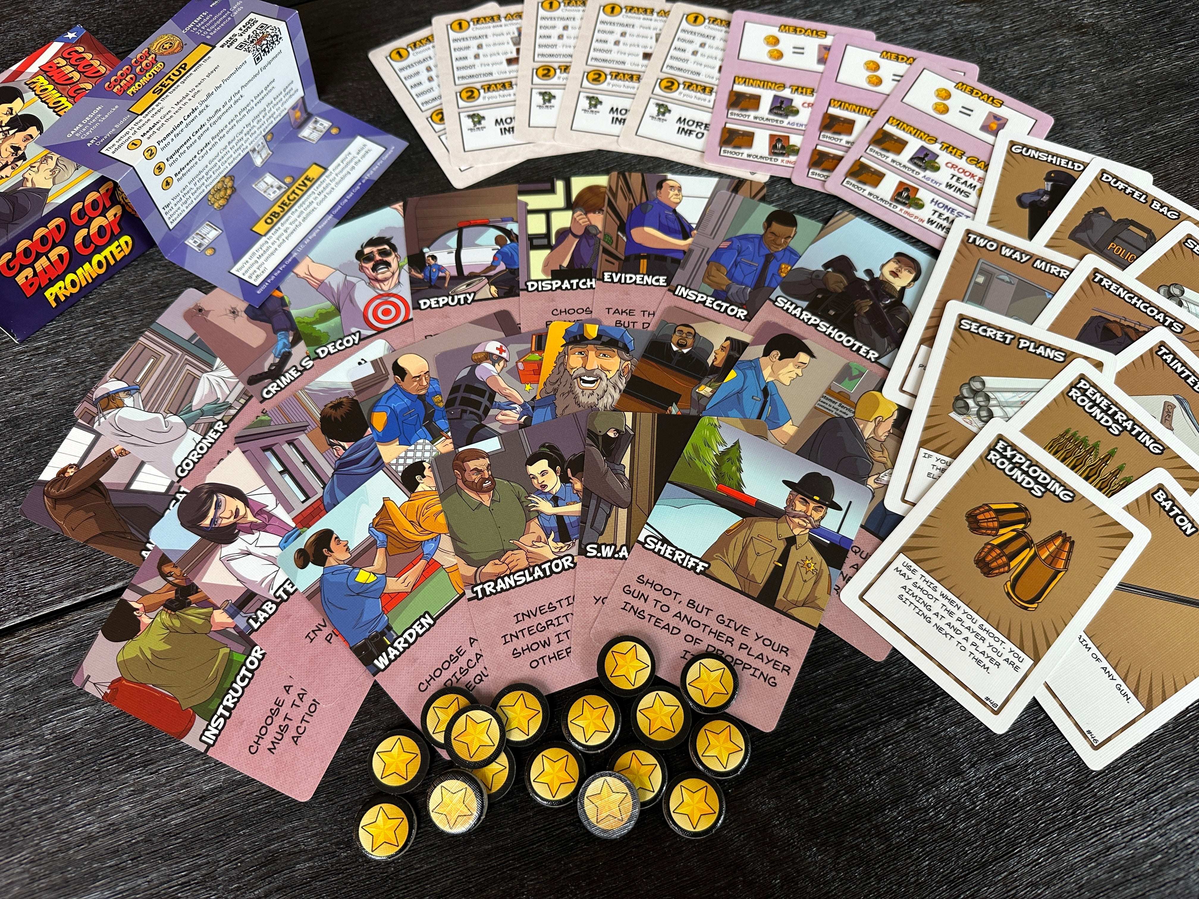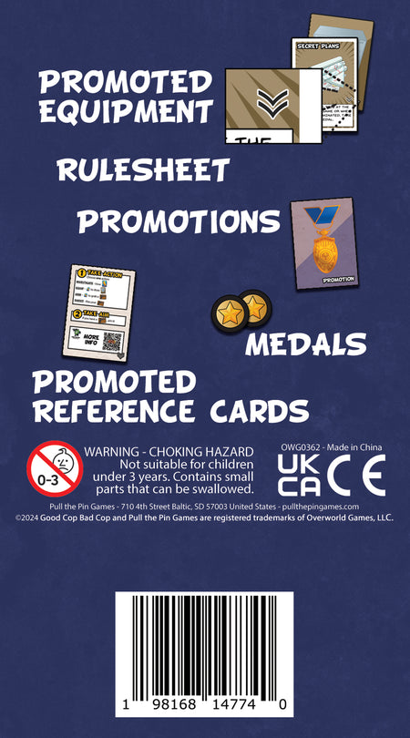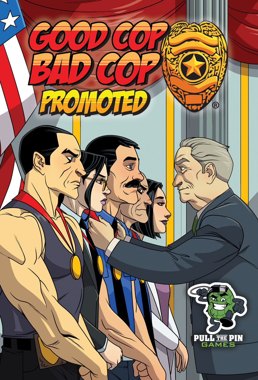 The Promoted expansion to Good Cop Bad Cop® allows you to play a series of games and earn medals for your heroism during each one. Those medals are used to get promotions in the next game. Each promotion provides a unique action you can take on your turn that no one else can.