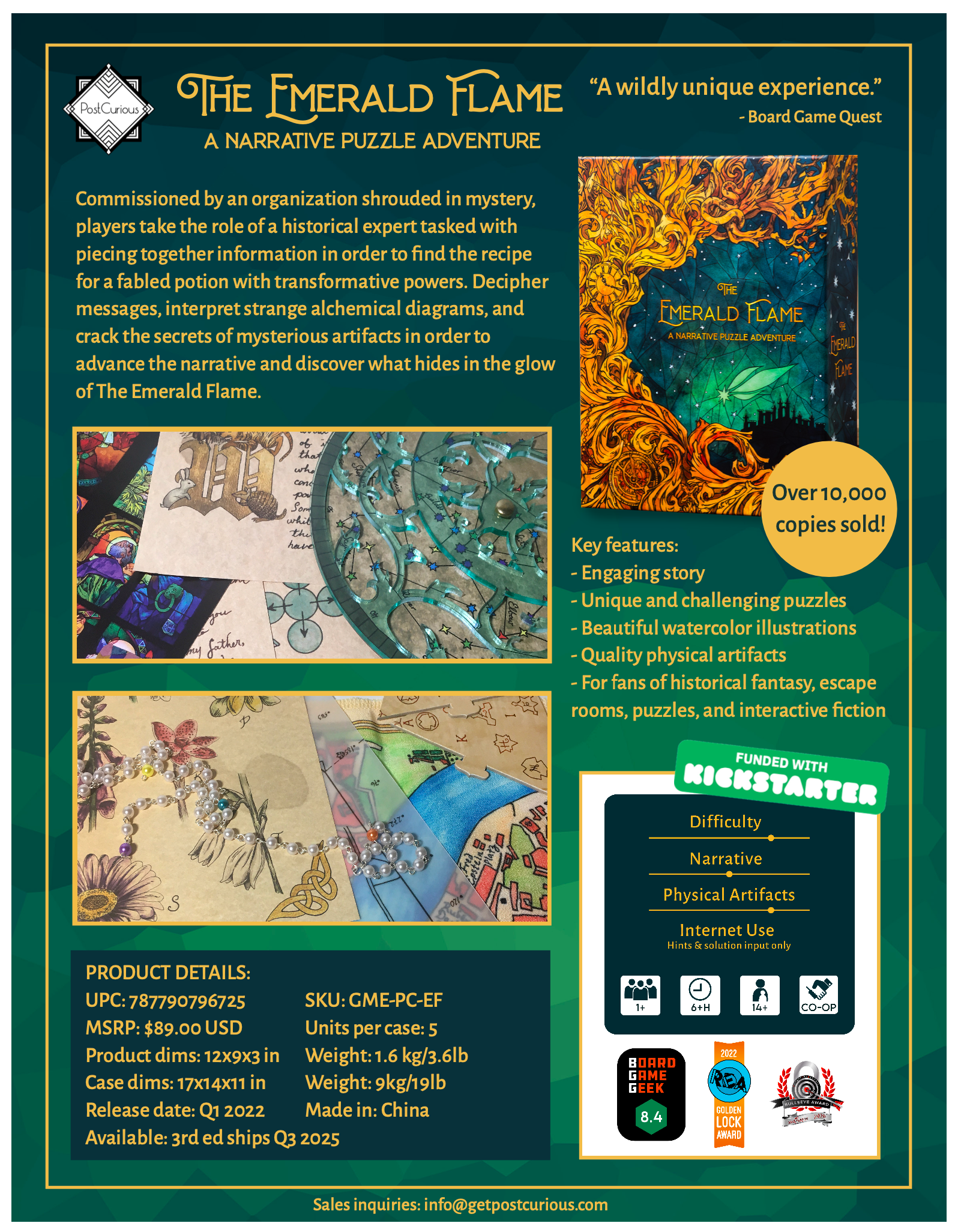 The Emerald Flame is a narrative tabletop puzzle game told in three parts. Commissioned by an organization shrouded in mystery, players take the role of a historical expert embarking on a quest to piece together the recipe for a fabled elixir by investigating maps, drawings, alchemical diagrams, and mysterious artifacts. Combining history, hand-drawn illustration, vibrant characters, and original puzzles, The Emerald Flame will challenge and engage players of all experience levels and has been called "a captivating adventure from beginning to end."