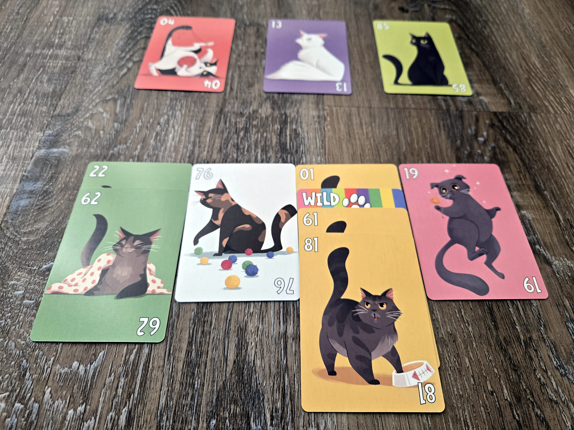 The game contains 100 cat cards numbered 00-99. Three of these are dealt face up in numeric order into the middle of the play area and five cards are dealt to each player to start the game.