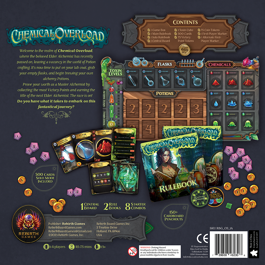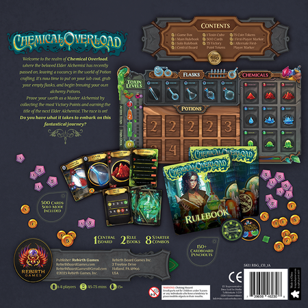 Chemical Overload BASE is a Deck Building, Tableau Building game set with an Alchemy theme. In the game, players compete to create various potions with unique effects. Most VP wins.