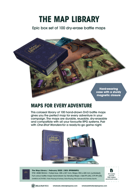 This colossal Map Library of 100 hand-drawn DnD battle maps gives you the perfect map for every adventure in your campaign. The maps are durable, reusable, dry-erasable and compatible with all your favourite RPG systems. No more scrambling for scenery – just grab a map and let the chaos unfold.