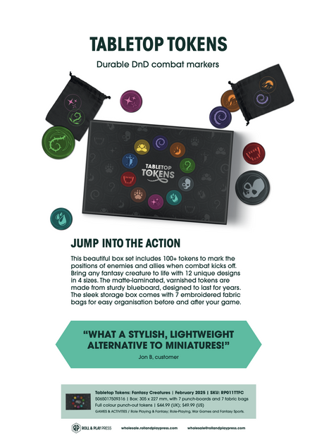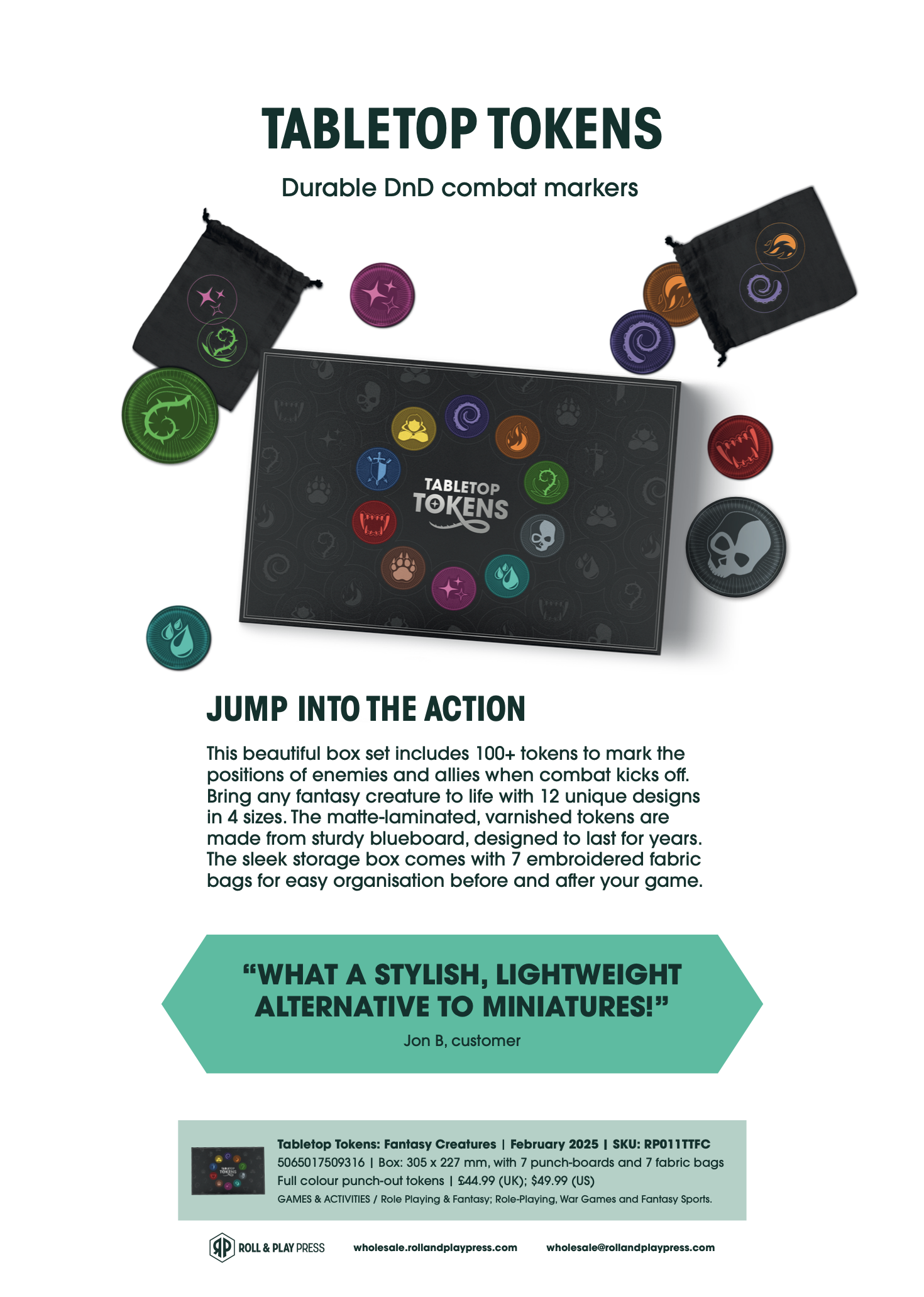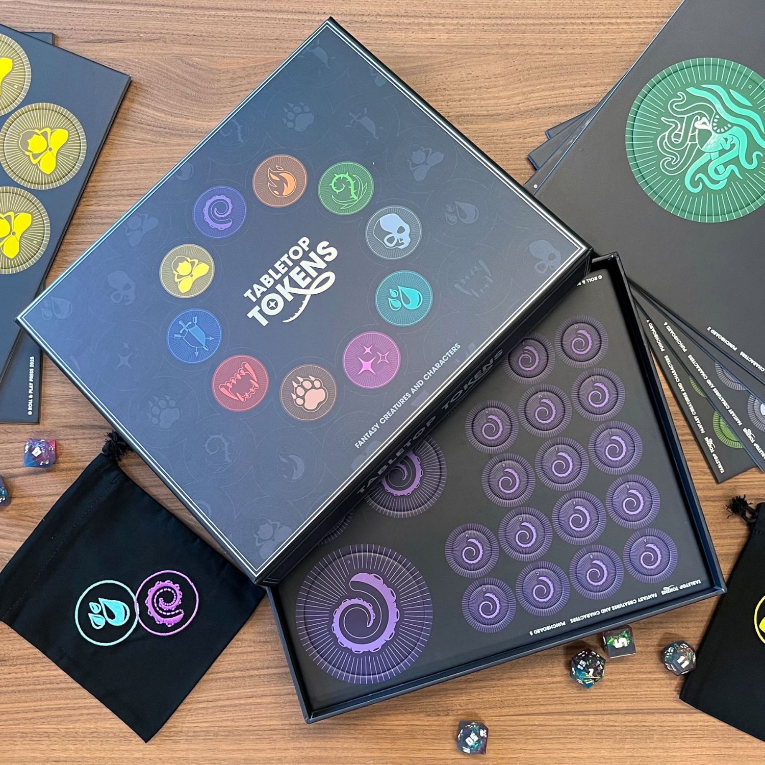 The Tabletop Token sizes go from a humble 1" all the way to a mighty 4", for creatures small to gargantuan and everything in-between. These matte-laminated, sturdy, varnished tokens are the best alternative to minis that money can buy.