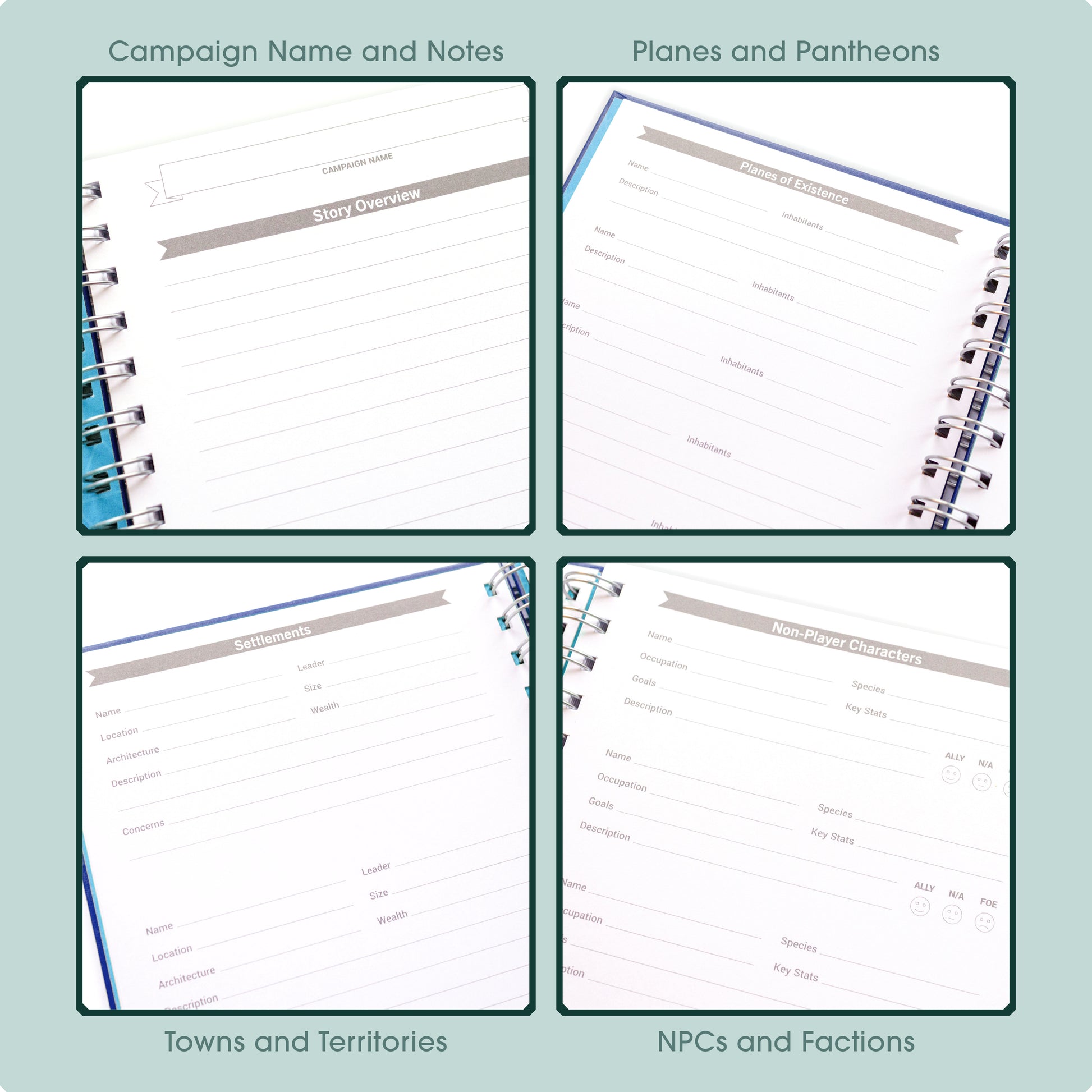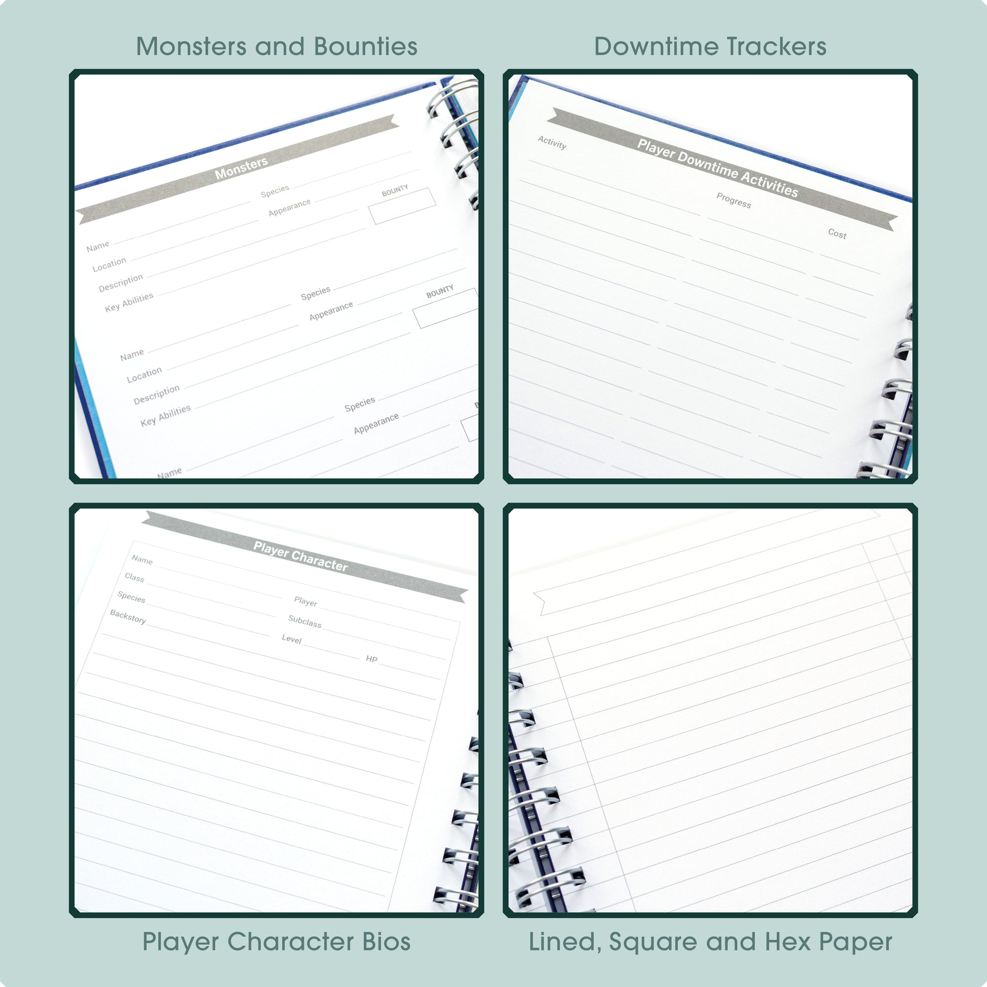 Our Game Master’s Quest Journals are purpose-built to keep track of your campaign notes and handouts. It has everything you need to manage your DnD campaigns without breaking a sweat. There’s space for world building notes, session planning sheets and trackers for NPCs, monsters, magic items, house rules and more! Plus lined, dotted and squared paper, and two sizes of hex grids for planning maps and dungeons.