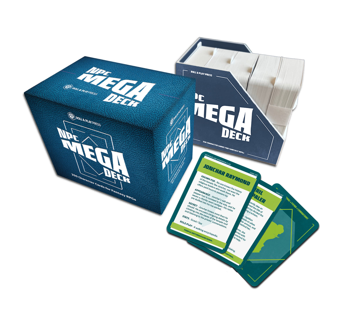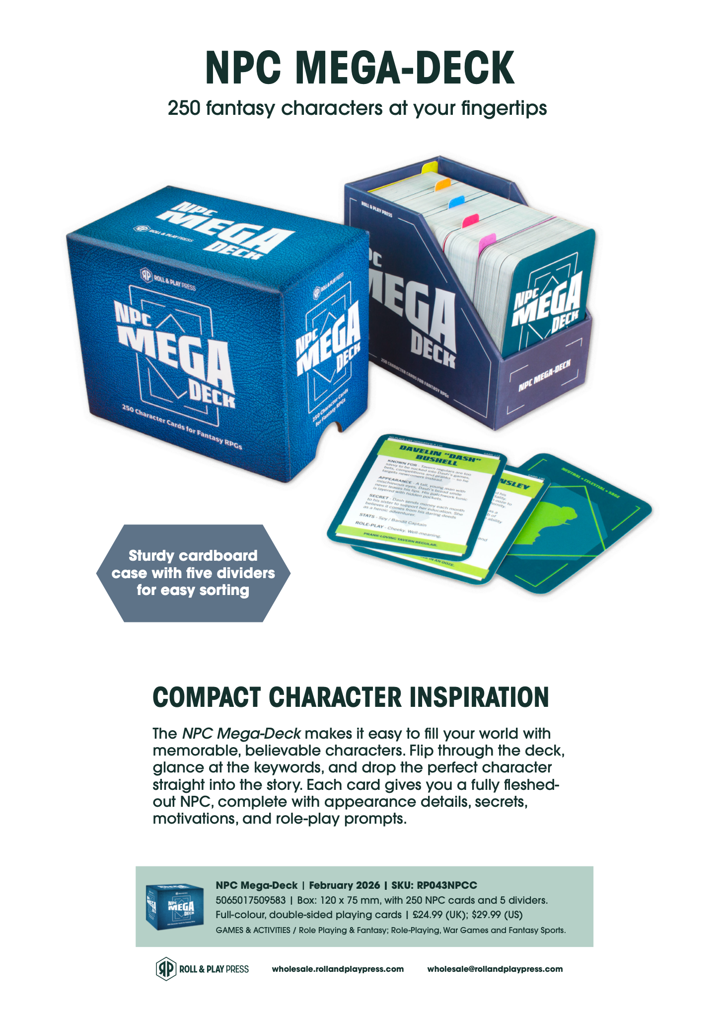 The NPC Mega-Deck makes it easy to keep your world full of memorable, believable characters. No more blank stares when your players talk to someone you didn’t plan for.