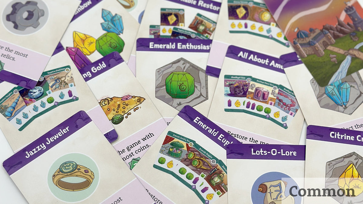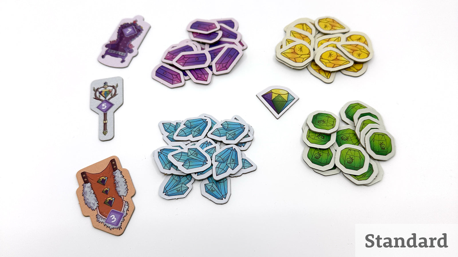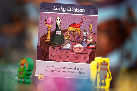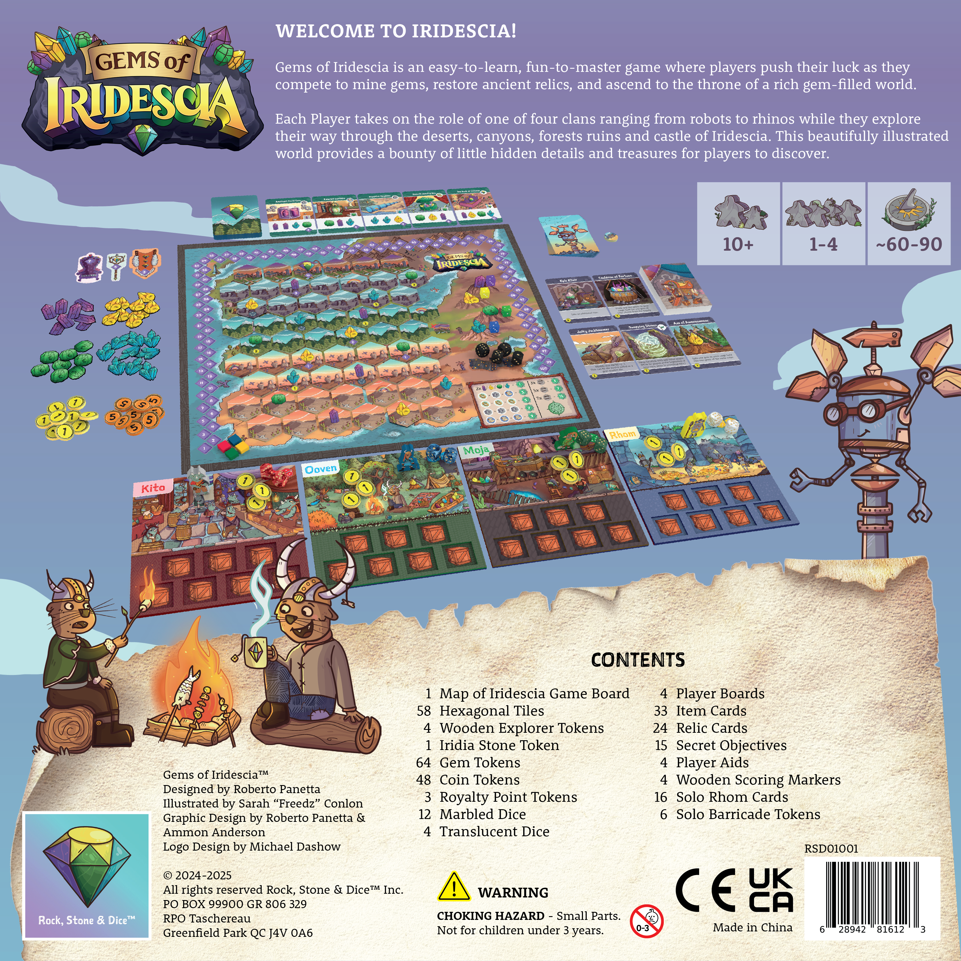 Gems of Iridescia is an easy to learn, fun to master worker placement board game where players will push their luck as they compete to mine gems, restore ancient relics and ascend to the throne of a rich gem-filled world. Quick to learn using a simple rule system that enables players to jump right into the game without reading page after page of rule books. Secret objectives and a variety of ways to score create different paths to victory making every expedition a unique and fun experience. Explore Iridescia by flipping over land tiles, revealing the gems hidden beneath them and then roll dice to mine them. Each gem color is tied to a dice value that can be manipulated to help your cause. Roll high enough, and you can claim more gems, adding them to your cargo hold providing you with a valuable resource for restoring relics and scoring royalty points! Sell some of your hard earned Gems and visit Rumi the Travelling Merchant to purchase tools that will grant your adventurers exciting new abilities to aid in their search for Iridescia’s treasures! Your trove of Gems can be used to restore Iridescia's ancient relics. Restoring Relics will gain you tons of Royalty Points and solidify your claim to the throne! The beautifully illustrated world of Iridescia provides a bounty of little hidden details and treasures for players to discover.