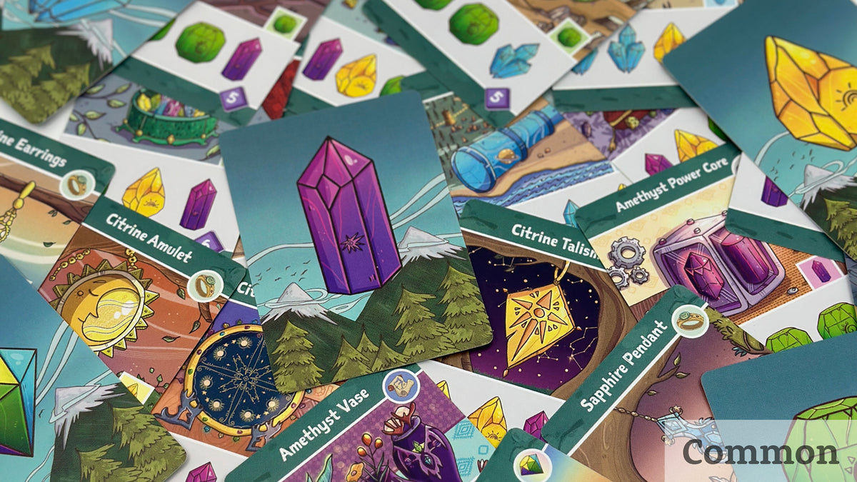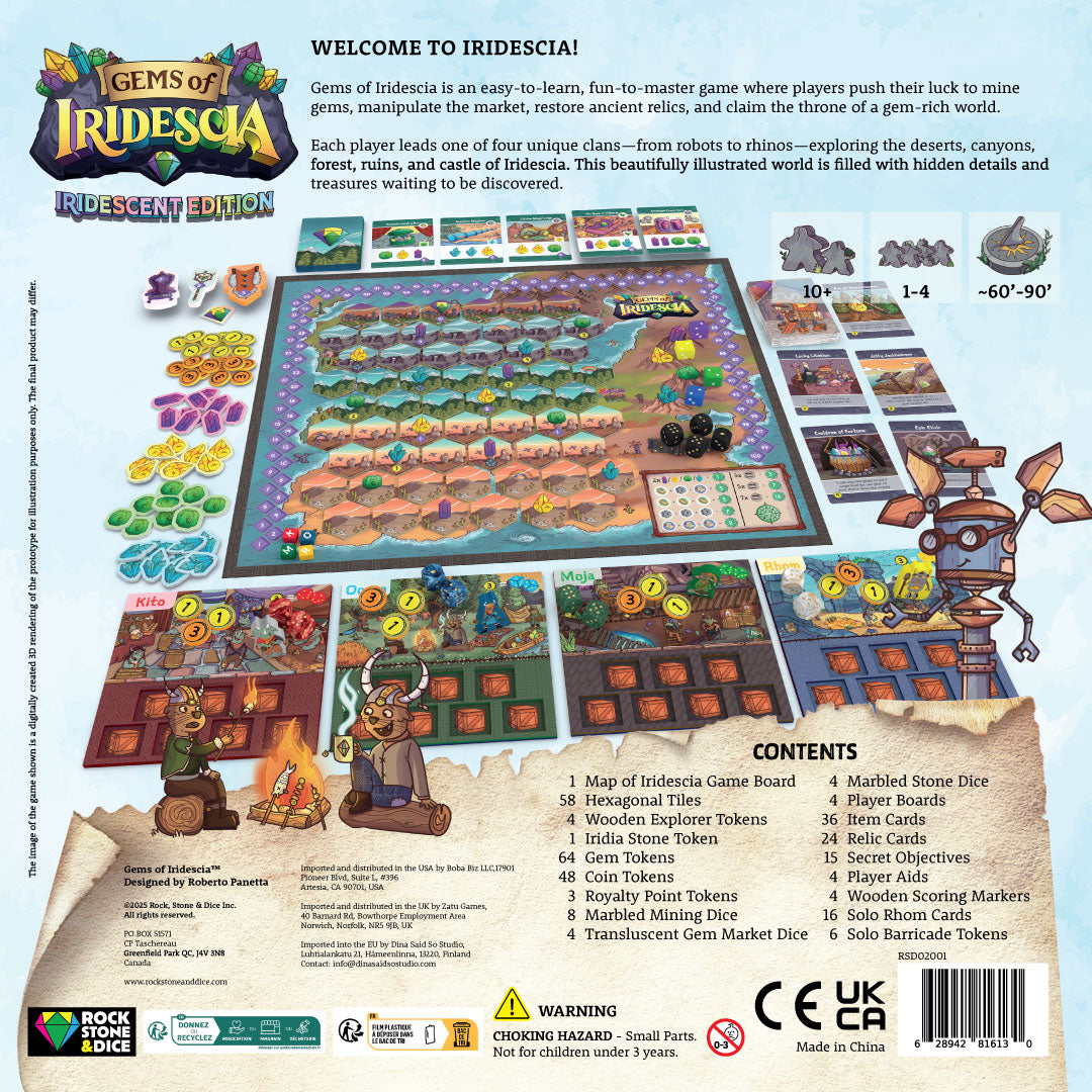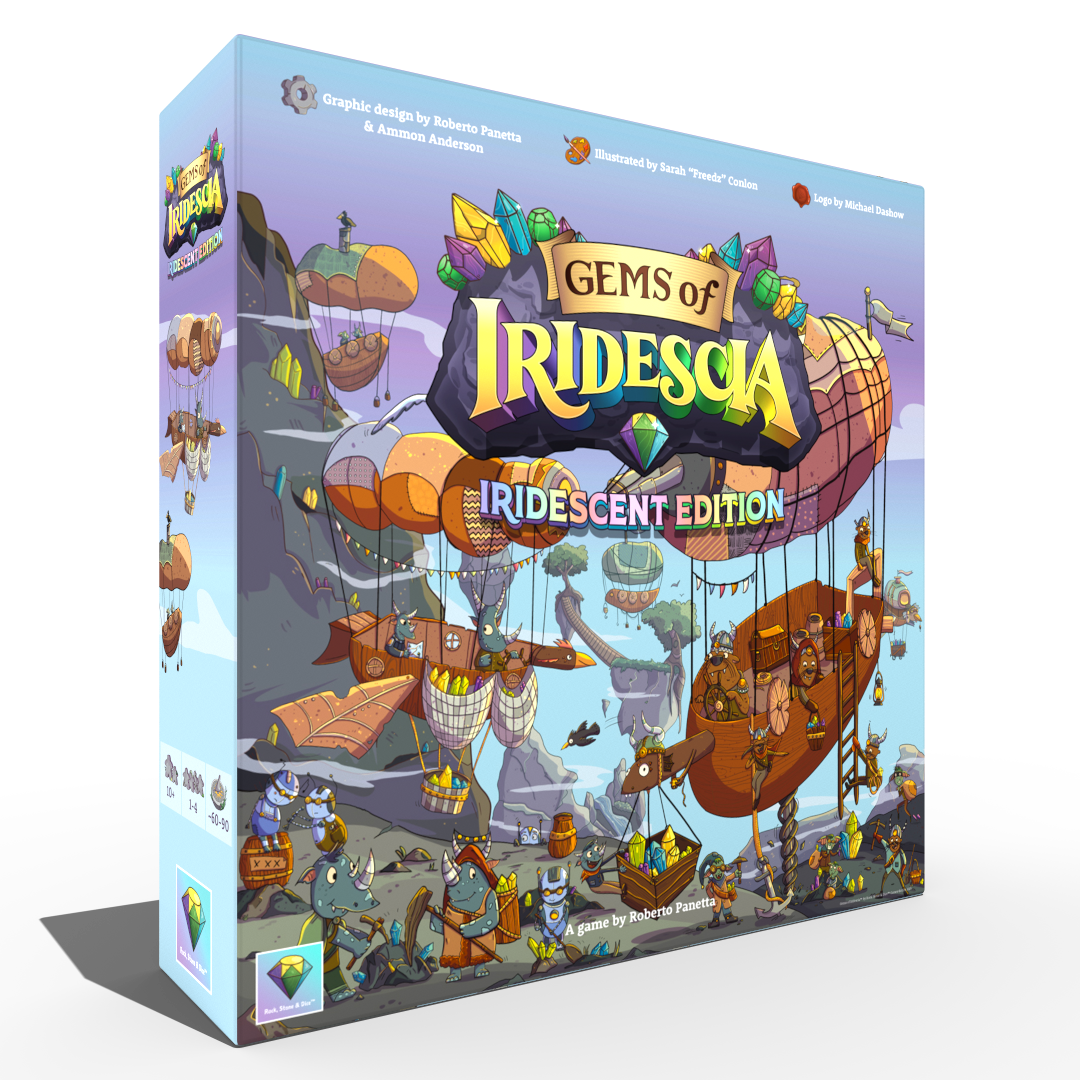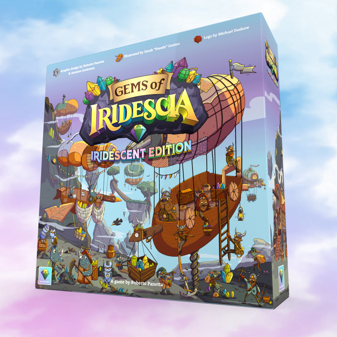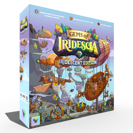 Gems of Iridescia DELUXE is an easy to learn, fun to master worker placement board game where players will push their luck as they compete to mine gems, restore ancient relics and ascend to the throne of a rich gem-filled world. Quick to learn using a simple rule system that enables players to jump right into the game without reading page after page of rule books. Secret objectives and a variety of ways to score create different paths to victory making every expedition a unique and fun experience. Explore Iridescia by flipping over land tiles, revealing the gems hidden beneath them and then roll dice to mine them. Each gem color is tied to a dice value that can be manipulated to help your cause. Roll high enough, and you can claim more gems, adding them to your cargo hold providing you with a valuable resource for restoring relics and scoring royalty points! Sell some of your hard earned Gems and visit Rumi the Travelling Merchant to purchase tools that will grant your adventurers exciting new abilities to aid in their search for Iridescia’s treasures! Your trove of Gems can be used to restore Iridescia's ancient relics. Restoring Relics will gain you tons of Royalty Points and solidify your claim to the throne! The beautifully illustrated world of Iridescia provides a bounty of little hidden details and treasures for players to discover.