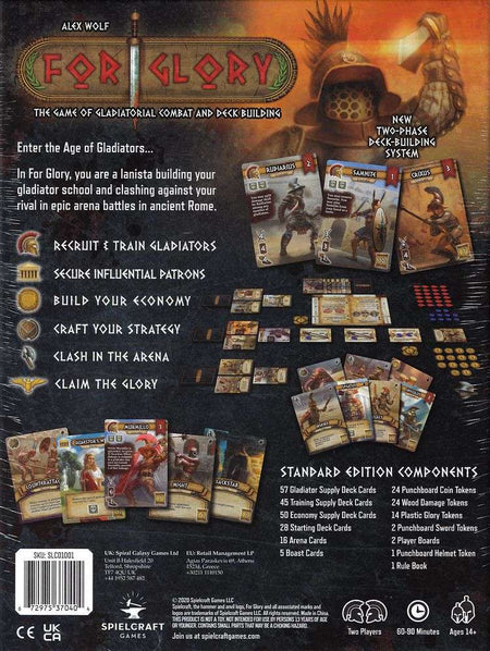 For Glory is the game of gladiatorial combat and deck building for 2 players. Players take on the role of gladiator school owners, or lanistas, in ancient Rome.